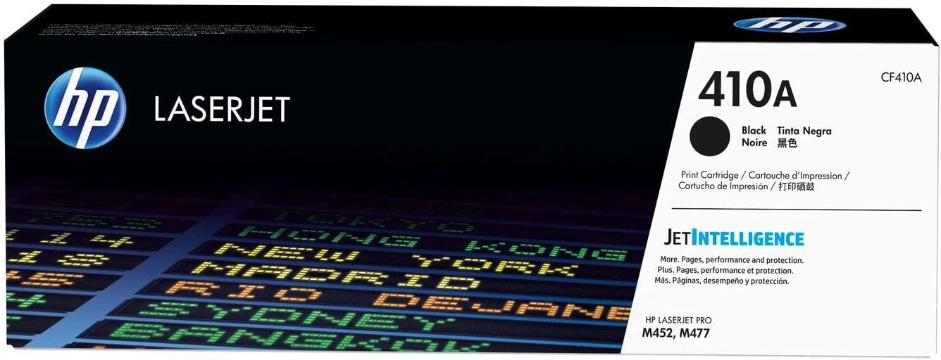 Key Features: Count on high-quality, reliable printing and save time by avoiding common printing problems: Original HP Toner provides the printing experience crucial for office productivity This cartridge works with: HP Color LaserJet Pro M452dn, M452dw, M452nw; HP Color LaserJet Pro MFP M377dw, M477fdn, M477fdw, M477fnw Cartridge yield (approx.): 2,300 pages Use Original HP Toner Cartridges to eliminate toner leaks and premature failures Buy sustainable—100% of Original HP Toner Cartridges contain recycled content Help protect your printer from malicious code and maintain the integrity of your data with Original HP’s tamper-resistant chips, firmware and packaging Original HP Toner is committed to office air quality—HP voluntarily designs and tests its printing systems to meet eco-label emissions guidelines What’s in the box: 1 new Original HP 410A Black Toner Cartridge (CF410A)