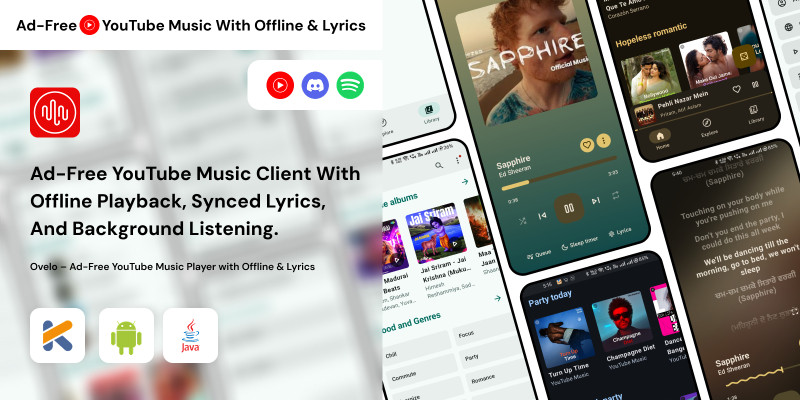 Ovelo – Ad-Free YouTube Music Player Android. Ad-free YouTube Music client with offline playback, synced lyrics, and background listening.