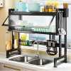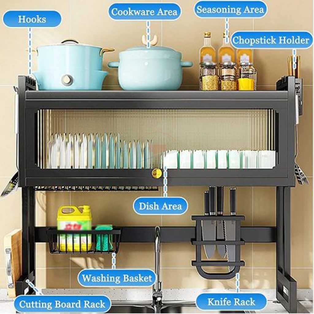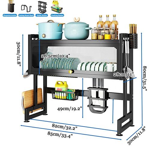 Key Features: Over The Sink Dish Drying Rack Dish Drainer For Storage Kitchen Counter Organization Display – Black. FLIP-UP CABINET DOOR: The cutlery rack above the sink is durable enough. The flip-top lid does not take up space and is convenient for storage, and the large capacity can store all the tableware. The design above the sink allows water to drain directly into the sink instead of the tabletop, effectively avoiding water accumulation. ALL STAINLESS STEEL MATERIAL: Made of 304 stainless steel, the tableware rack above the sink is durable enough for long-term use. In addition, its large capacity allows you to store all tableware, and the design above the sink allows it to drain water directly to the sink, rather than to the table, effectively avoiding water accumulation. MULTI FUNCTIONAL KITCHEN ORGANIZER: The expandable shelf provides more space without occupying more counter space, which is very convenient. It can meet the needs of any kitchen appliance. This would be a great kitchen organizer. All the accessories you need are complete, including cleaning basket, knife rest, chopping block holder, chopsticks barrel, hook “. (All the accessories are made of stainless steel) SIMPLE ASSEMBLY AND EASY CLEANING: The dish holder is equipped with a hexagonal wrench and wrench, which requires no additional tools and is easy to install. Assemble the corresponding modules according to the instructions. All accessories can be easily removed for cleaning by wiping with a wet towel. Now add it to your shopping cart, and your kitchen will have a perfect tableware drainer. FIND A SUITABLE TABLEWARE RACK FOR YOU: please carefully measure three values before purchasing: the width of the kitchen sink, the height of the faucet, and the height from the bottom of the cabinet to the table top