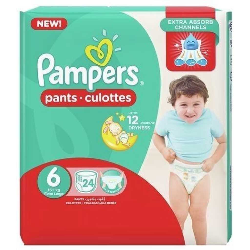 Pampers Pants High count S6 (15+ Kg) – 24pcs – Extra Large A great night’s sleep means a good morning mood. Introducing new easy put-on Pampers pants for boys and girls. Order your Pampers Pants – in a Great Value Pack from TilyExpress online and have it delivered straight at your doorstep. The only brand to feature an extra Sleep-Layer , they quickly absorb wetness and spread it evenly across the core. Giving your baby up to 12 hours of dryness for more fun and happy mornings. Pampers locks the wetness away from your baby’s skin thanks to its Micro Pearls™ located in the core of the diaper that absorb up to 30 times their weight. Two Dry-zones that quickly absorb liquids and lock them away from your baby skin. Stretchy waistband and leg cuffs adapt to baby shapes and movements for a perfect fit in all positions. Key Features: Diaper Size: 6 Baby Weight: 15+ Kg Pack Count: 24 Extra soft and secure Up to 12 hours protection Day and night comfort