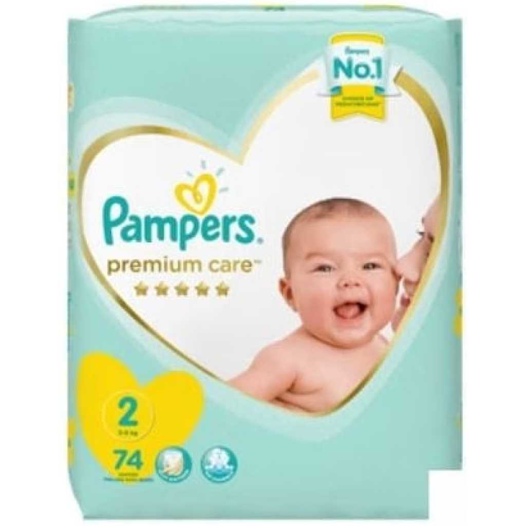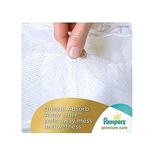 Pampers Premium Care Diapers, Size 2 (3-6kg), Jumbo Pack (Count 74) Give your baby our best care for skin, Pampers Premium Care. Pampers Premium Care diapers are gentle and hypoallergenic to help maintain baby’s healthy skin. They have Extra Absorb Channels™ to distribute wetness evenly for up to 12 hours and an Absorb Away Liner ™ to pull away wetness and mess. They’re also breathable inside and out and have a wetness indicator that lets you know when your baby might need a diaper change. This way your baby can enjoy comfortable dryness even after little accidents, for up to 12 hours. No nappy absorbs liquid stool as well as pampers Premium Care. Breathable Back Sheet keeping babies aerated always.
