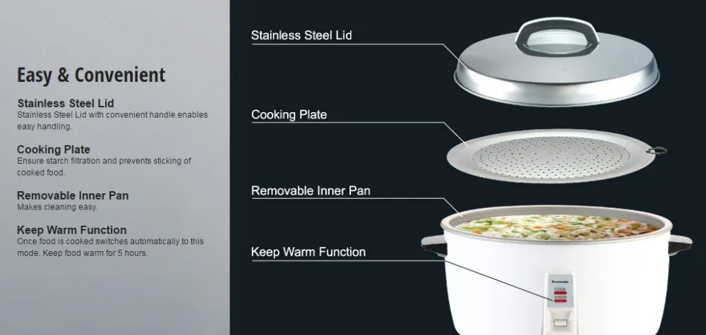 Panasonic Conventional Rice Cooker (3L) SR-GA321 Conventional Rice Cooker Delicious rice at the touch of a switch. • Capacity: 3.2 Litres / 5-17 cups • Aluminum Inner Pan • Keep Warm Up To 5 Hours • Multi-Cooking: Soup & Stew, Noodles, Rice Dishes, Steam Dishes Conventional Rice Cooker SR-GA321 Thumbnail Image 1Conventional Rice Cooker SR-GA321 Thumbnail Easy & Convenient Stainless Steel Lid Stainless Steel Lid with convenient handle enables easy handling. Cooking Plate Ensure starch filtration and prevents sticking of cooked food. Removable Inner Pan Makes cleaning easy. Keep Warm Function Once food is cooked switches automatically to this mode. Keep food warm for 5 hours. Key Features: Panasonic Conventional Rice Cooker (3L) SR-GA321 Conventional Rice Cooker Delicious rice at the touch of a switch. • Capacity: 3.2 Litres / 5-17 cups • Aluminum Inner Pan • Keep Warm Up To 5 Hours • Multi-Cooking: Soup & Stew, Noodles, Rice Dishes, Steam Dishes Conventional Rice Cooker SR-GA321 Thumbnail Image 1Conventional Rice Cooker SR-GA321 Thumbnail