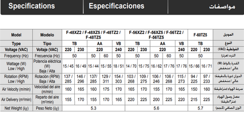 This ceiling fan has aerodynamic blades for a strong silent breeze, a built-in thermal fuse to guard against overheating and a built-in safety wire for extra protection. Additional Information Colour White Model F-56XZ2 Watt 76W Voltage AC 220-240 Item Dimensions 56 inch (1400mm blade span) Installation Set up by a qualified Technician Material Aluminum Warranty 1 Year Additional Features IP21 Application Domestic Use Key Features: This ceiling fan has aerodynamic blades for a strong silent breeze, a built-in thermal fuse to guard against overheating and a built-in safety wire for extra protection.