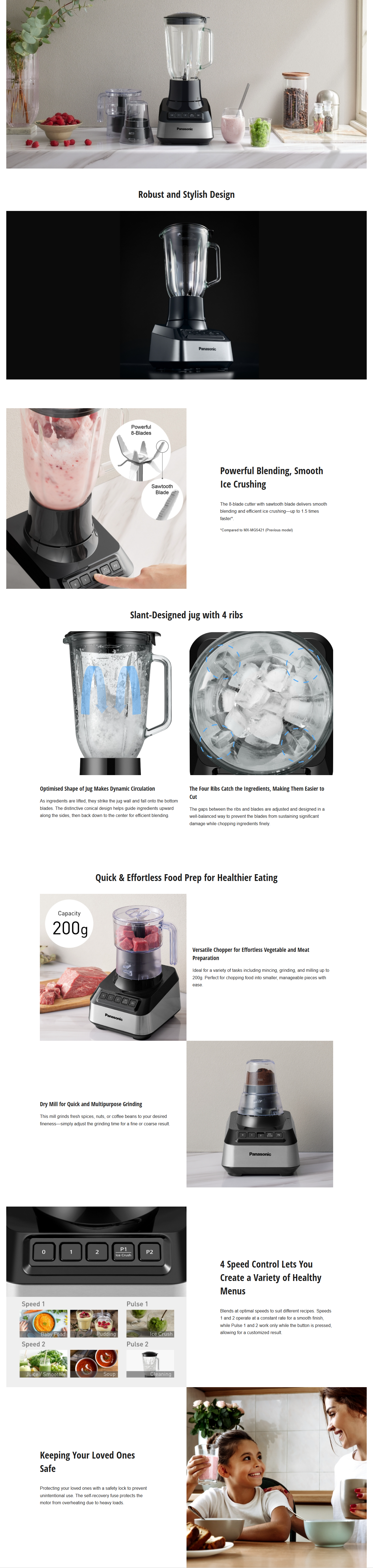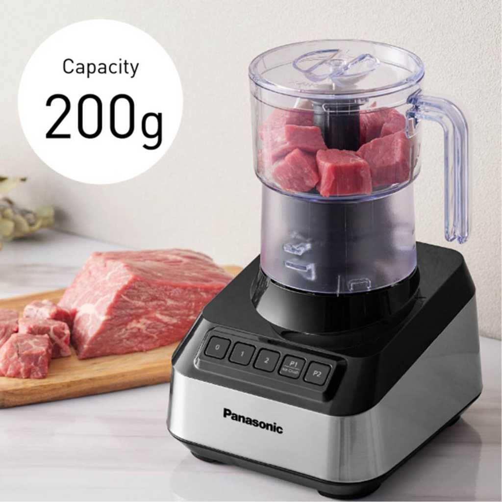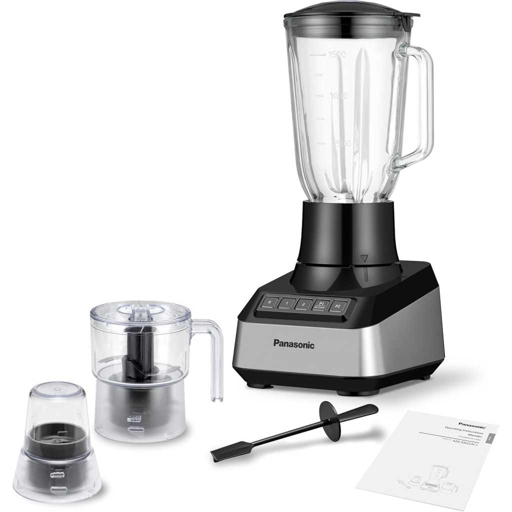 Panasonic Blender 800W Glass Jug Chopper – MX-MG54C1KTZ Key Features: The MX-MG54C1 boasts a durable and modern design, featuring an 8-blade system that effortlessly handles smoothies with ice and chilled desserts. It also includes a large-capacity chopper and mill, giving you even more versatility in the kitchen. Robust and Stylish Design Powerful Blending, Smooth Ice Crushing Versatile Chopper for Effortless Vegetable and Meat Preparation Dry Mill for Quick and Multipurpose 4 Speed Control Lets You Create a Variety of Healthy Menus