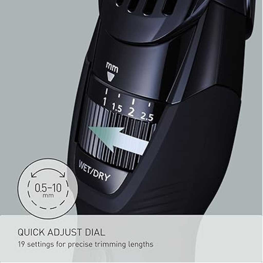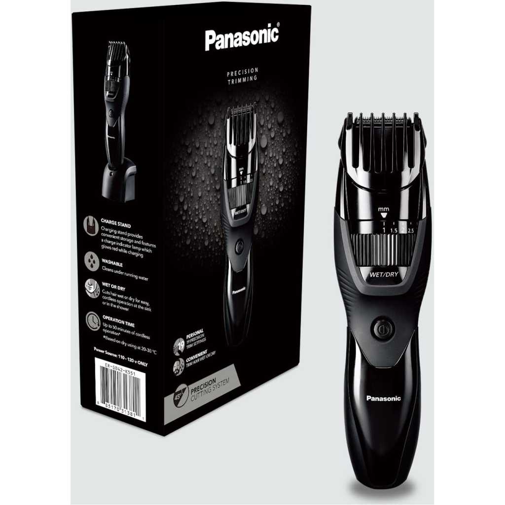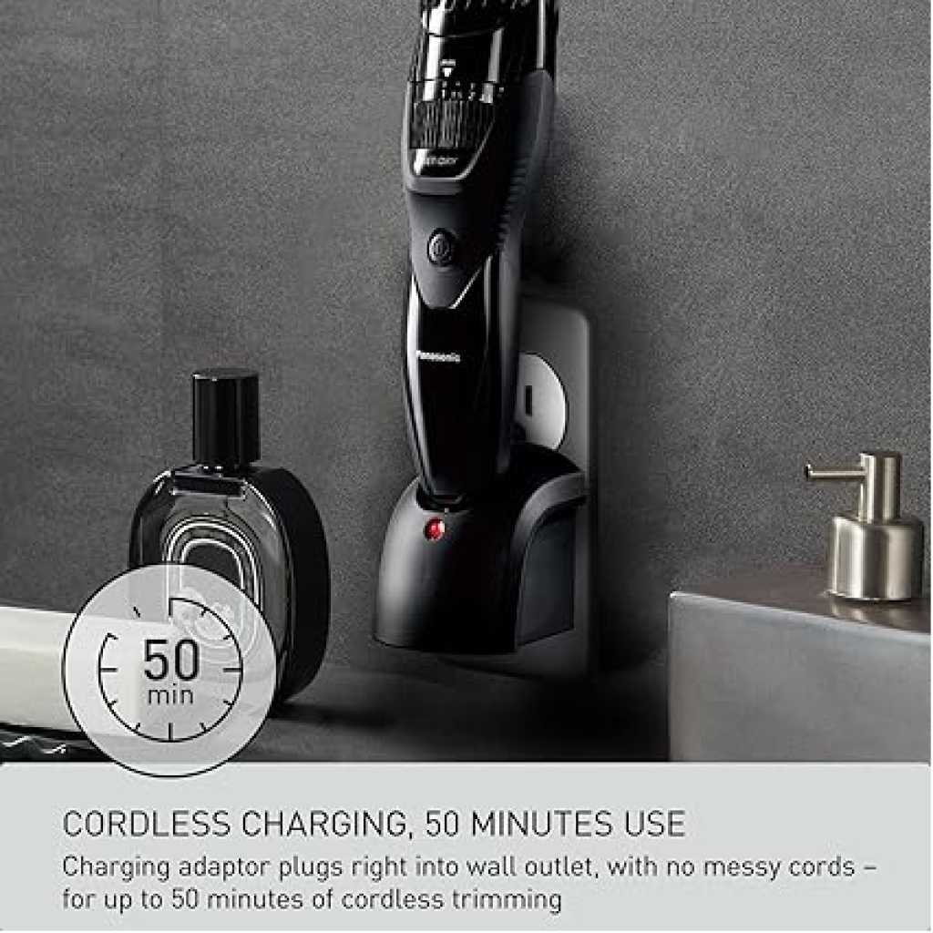 Panasonic Cordless Men’s Beard Trimmer ER-GB42K, With Precision Dial, Adjustable 19 Length Setting, Rechargeable Battery, Washable (Black) Key Features: Panasonic Cordless Men’s Beard Trimmer ER-GB42K, With Precision Dial, Adjustable 19 Length Setting, Rechargeable Battery, Washable (Black) Personalized Cutting and Sculpting: An adjustable dial with 19 settings to get the exact look you want; included comb attachment raises flattened hairs for clean cutting. Cutting Length Steps: 19, Cutting Length Adjustment: 1.0-10 mm, Cutting Length w/o Attachment: 0.5 mm Precision 45-Degree Blade Cutting System: Ultra-sharp, hypoallergenic blades make this an ideal beard trimmer for men for quick, efficient hair, beard, and mustache grooming Rubberized, Ergonomic Grip for Maximum Comfort: Sleek design is easy to hold and gives total control for clean, detailed cutting and trimming Wet/Dry Mens Trimmer: Waterproof, 100 % washable cordless mustache trimmer lets you comfortably trim in or out of the shower Charges Fast & Travels Easily: The ER-GB42 beard trimmer charges quickly in AC wall adaptor for up to 50 minutes of use and packs easy. Order WER9606P replacement blade to maintain optimal trimming