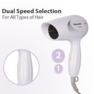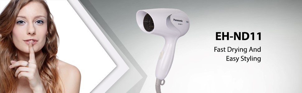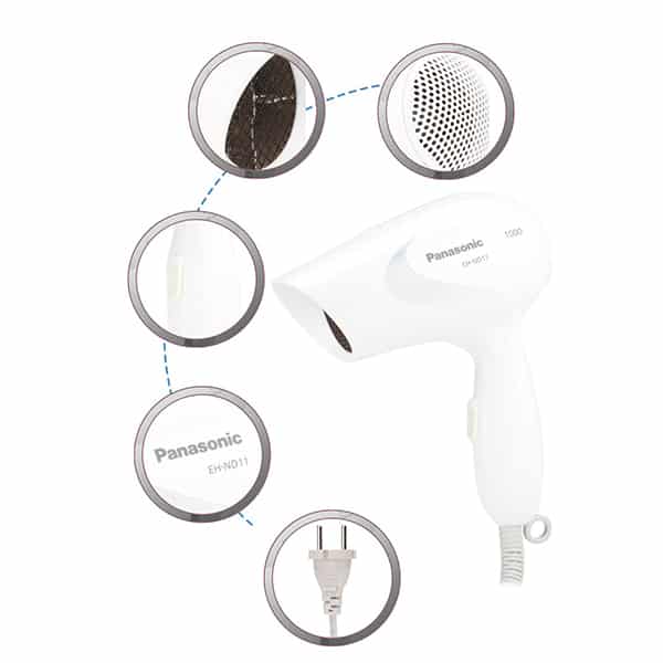 Panasonic Hair Dryer EH-ND11 1000W 220V – White. Compact design, portable size: With its compact, convenient, portable size this hair dryer fits anywhere. It is portable enough to be carried easily in your travelling bags and backpacks so that you can keep your personal stylist close to you always. ➦ Dual Speed and Heat ➦ Long Non-Tangled Cord ➦ Compact and Portable Dual speed selection: This hair dryer offers two speed settings to select the amount of speed required for different hairstyles. The speed of the air can be easily varied with just the simple push on the handle. 1000 W turbo dry: The dryer consumes 1000-Watt power which provides powerful yet gentle air to dry the hair effectively within minutes. Turbo mode produces high speed uniform airflow that can set tresses and dry locks efficiently. 1.8 m. long tangle-free cord: It is equipped with a 1.8 m long tangle free cord. The cord enables easy utilization without pulling it out of the power socket when you yank it. It increases the range of the device so that you can use the dryer comfortably. Light in weight, ergonomic design: This hair dryer is light in weight and has an ergonomic design that is very easy to hold and operate. It has a hanging notch at the base so that it can be hung by a hook near the closet or wardrobe. Warranty Information: 2 Year Standard Manufacturer Warranty by Panasonic from the Date of Purchase Key Features: Panasonic Hair Dryer EH-ND11 1000W 220V – White. Brand: Panasonic Model Number: EH-ND11-W62B Color: White Model Name: EH-ND11-W62B Number of Speed Settings: 2 Number of Heat Settings: 2 Attachment Types: Concentrator Cold Air Feature: No Technology Used: Uniform Blow Technology