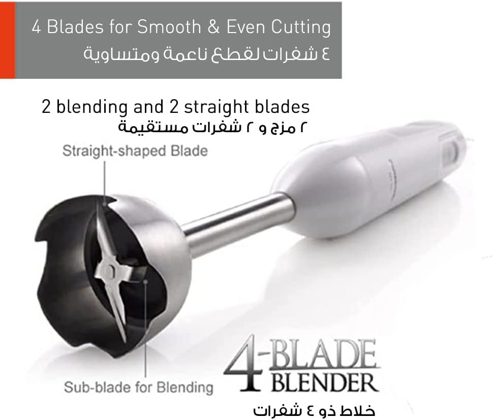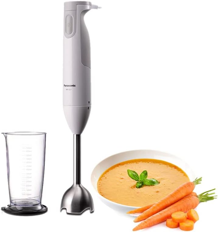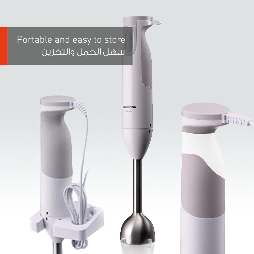 Key Features: Panasonic Hand Blender MX-GS1WTZ 600W With 1.7L Bowl. Easy-to-Grip Handle. 2 Straight & 2 Blending Blade. Stainless Steel Shaft. Powerful motor 600 W max. One speed. Easy to use & time saving. Blending bowl .7 L . Cord length 1.3 M. Wall bracket.