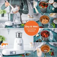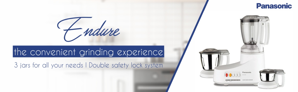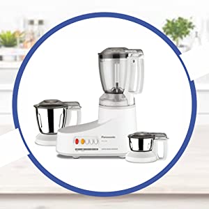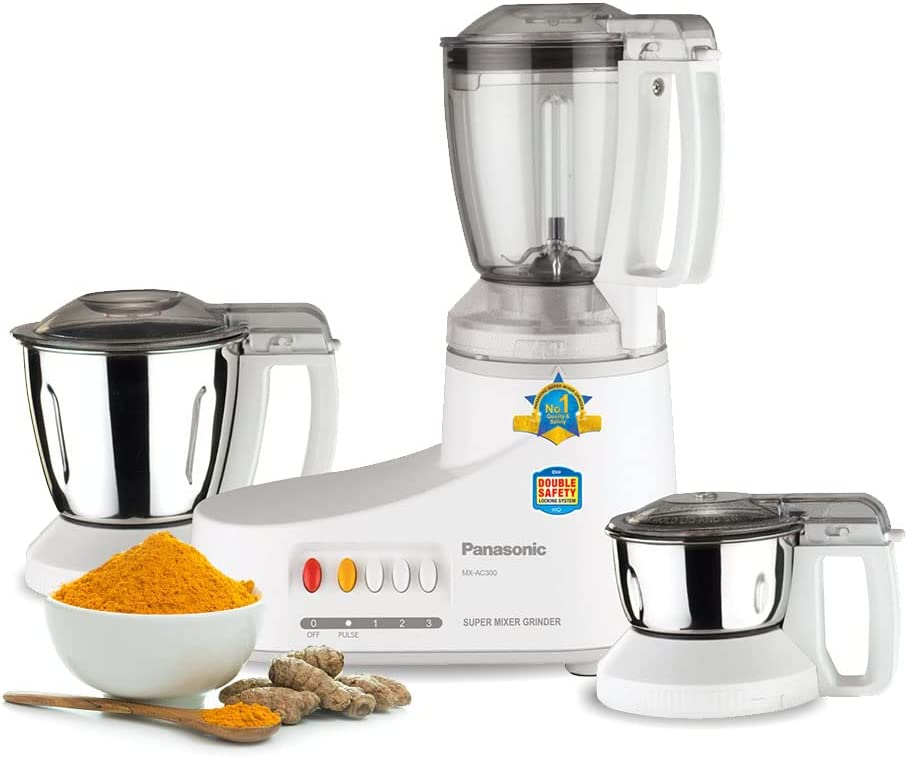 Panasonic Mixer Grinder With 3 Jar MX-AC300 – White Key Features: Panasonic Mixer Grinder With 3 Jar MX-AC300 – White Powerful Motor, 1000W Max. Locked Wattage To Achieve Optimum Results 6 In 1 Blending, Wet Grinding, Dry Grinding, Whipping, Mincing, Chopping And Meat Grinding Samurai Edge Blade For Efficient Grinding Especially On Hard Spices I.E. Turmeric One Unbreakable Polycarbonate Jar And Two Stainless Steel Wet/Dry Mill For Preparing Different Ingredients Unique Interlocking Safety System Makes Sure That The Mixer Grinder Will Only Switch On If The Jar Is Locked Properly In Place