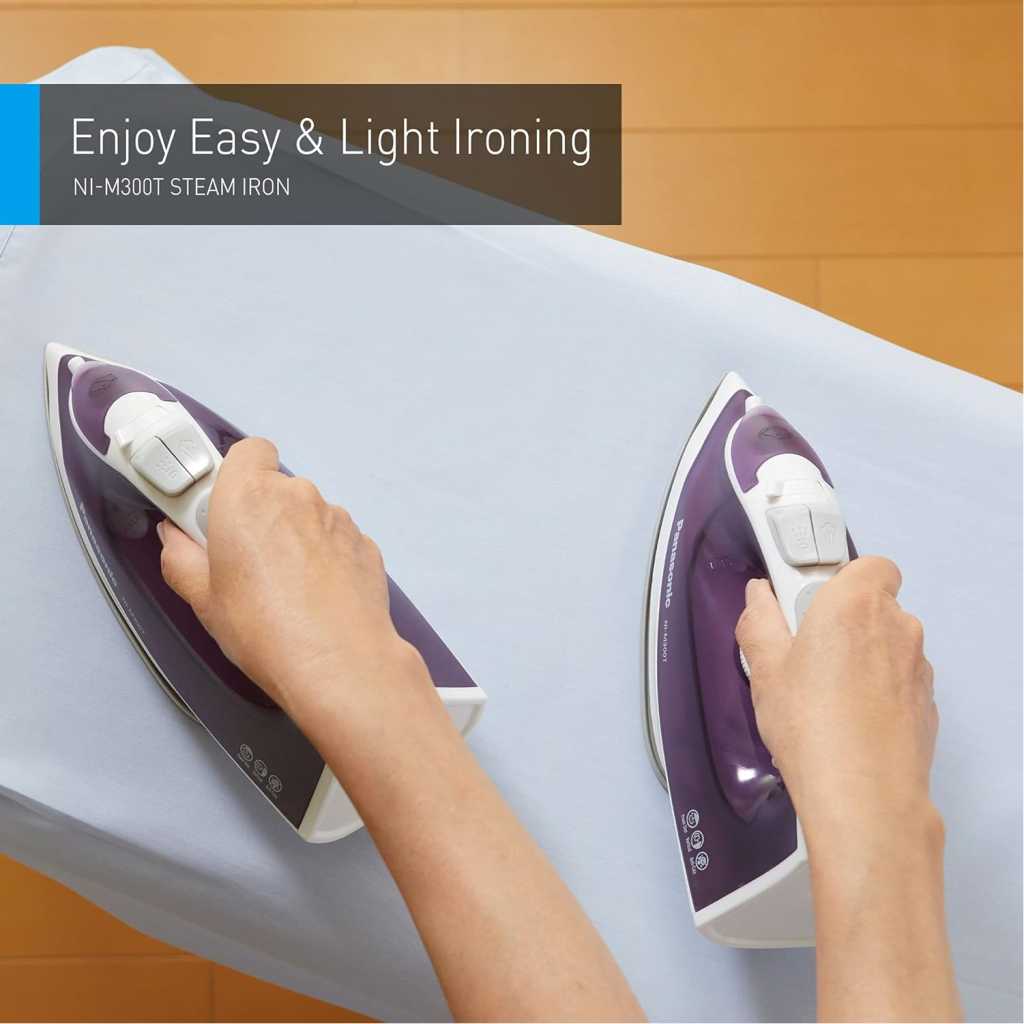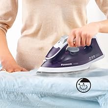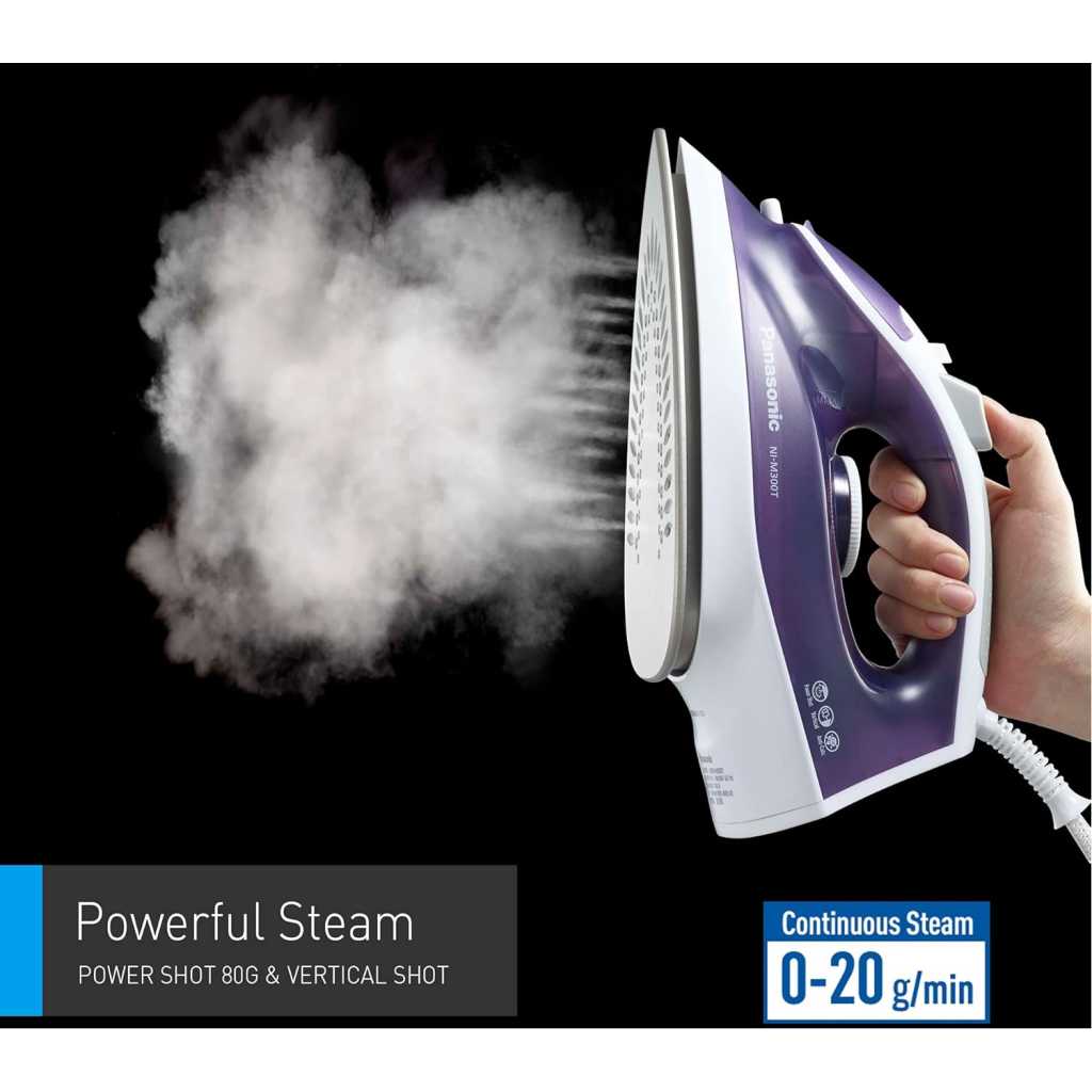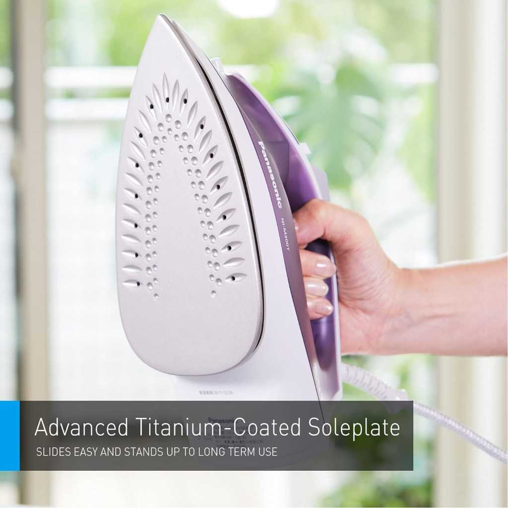 From the manufacturer Key Features: Panasonic Steam Iron, NI-M300TATH, 1800W, Spray, Vertical 80g Power Shot – Violet. Achieve quick results with powerful 1800W. Power Shot for steam up to 20 g/min. removes stubborn wrinkles and Vertical Shot for a powerful steam burst removing wrinkles from hanging garments. Advanced Titanium Coated Soleplate slides easily and is durable enough for long time usage. Anti-Calc System to prevent calcium deposits clogging the steam vents. Swivel cord, designed to minimize tangle during use. Push button-controlled spray to direct extra moisture where needed and easily remove stubborn wrinkles.