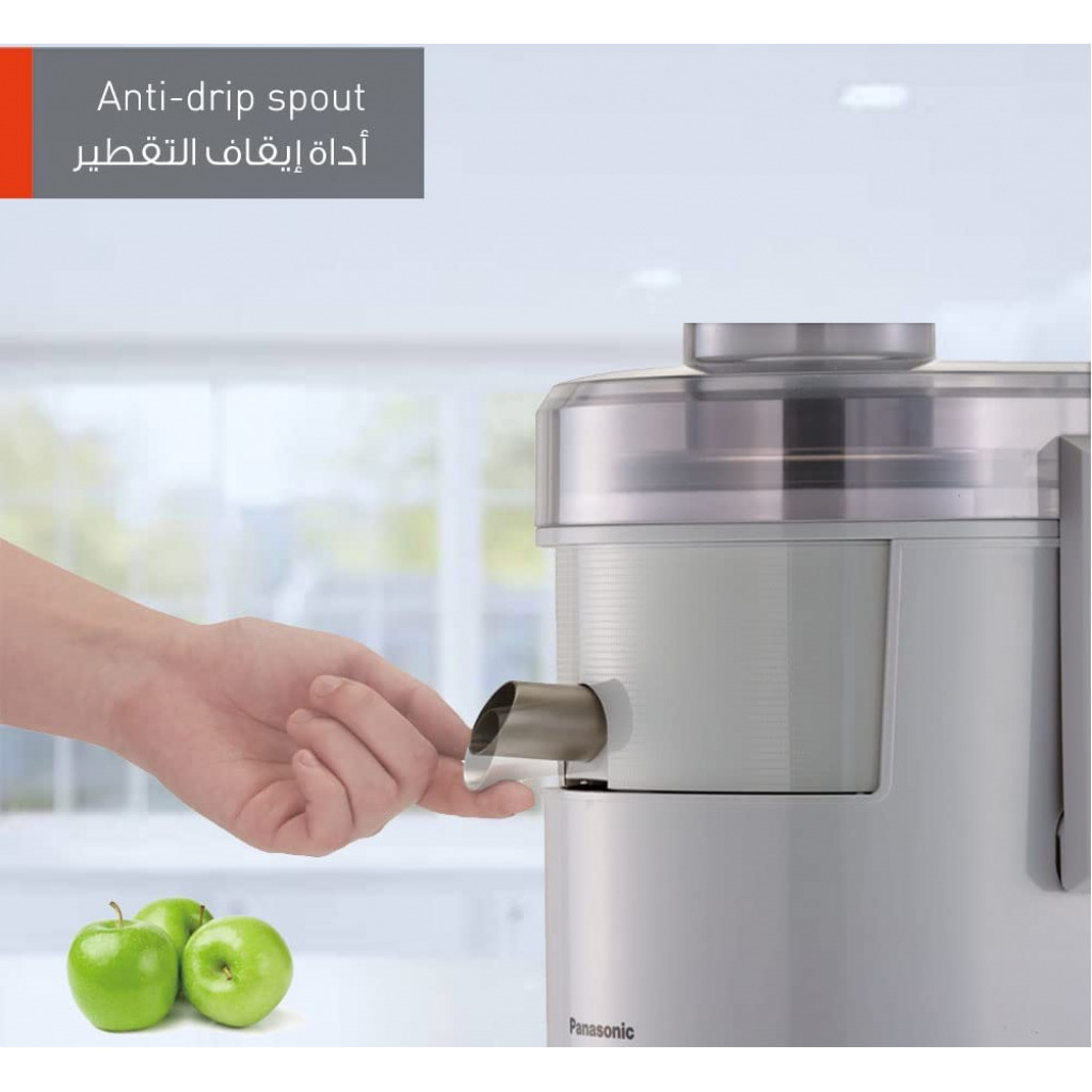 Key Features: Panasonic Wide Tube 800W Juicer, 1.5L Juice Cup 2.0L Large Capacity Pulp Container, MJSJ01 – White The stainless steel spinner’s S-Shaped cutter firmly holds fruits in place for optimum juice extraction. The fine filter mesh separates the juice from the pulp so you always get a refreshing drink. 800W Max.Locked Wattage for powerful juicing The feeder tube has a 75mm diameter, large enough to fit whole fruits & vegetables. 120 Degree Rotatable Anti-Drip Spout allows for easy pouring in different directions. Single Speed Juicing 1.5L Juice Cup 2.0L Large Capacity Pulp Container