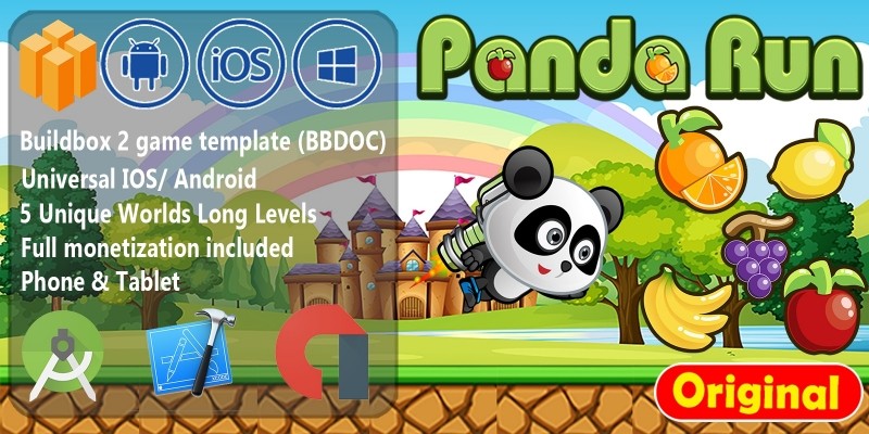 Panda Fruit Run - Buildbox Game Template . Run, jump, shoot, ride and swim your way across 5 worlds to get them back.