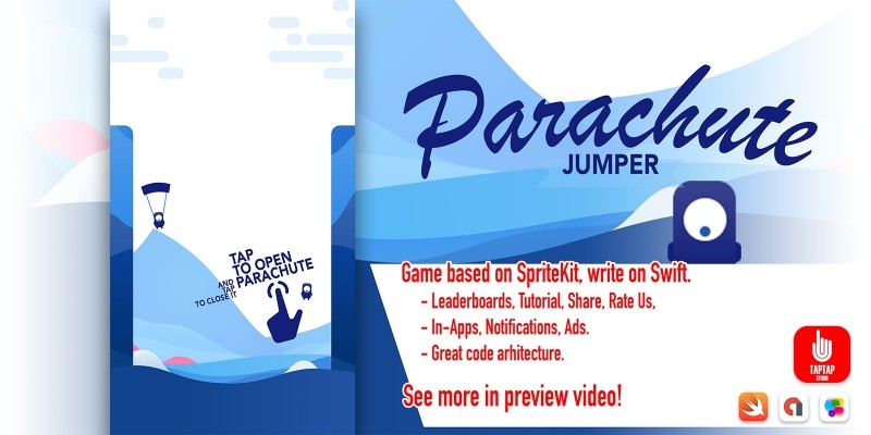 Parachute Jumper - iOS Source Code. Tap for open or close parachute. It’s endless type game!