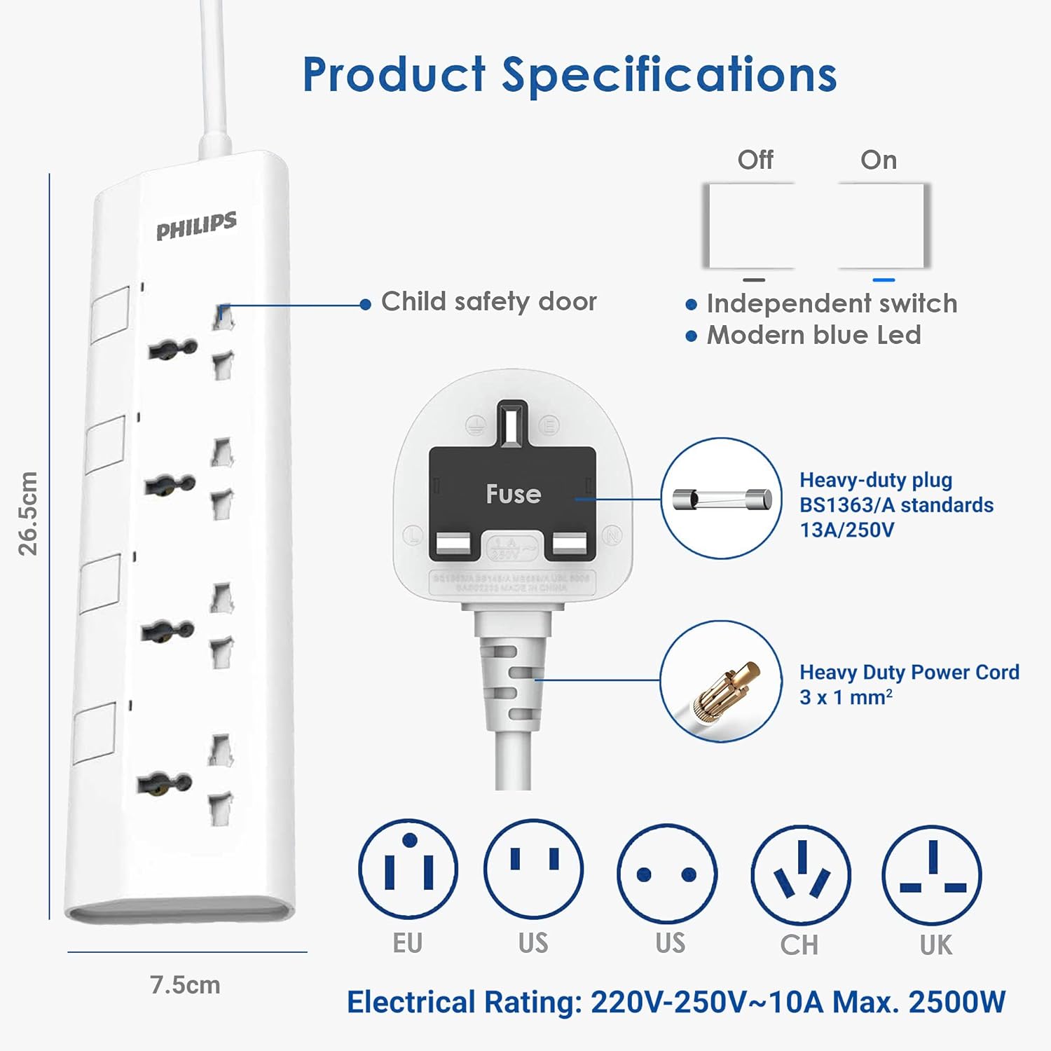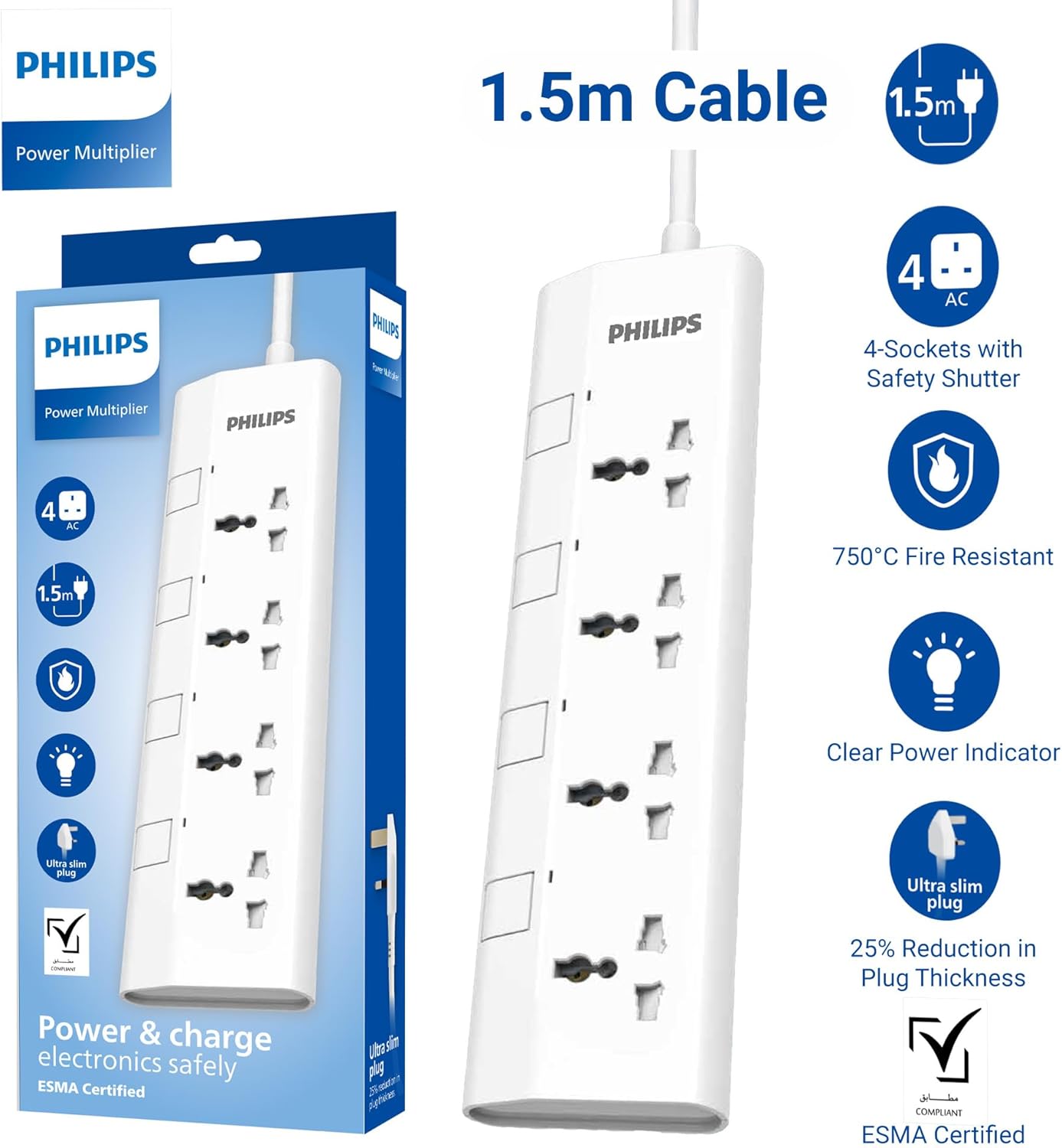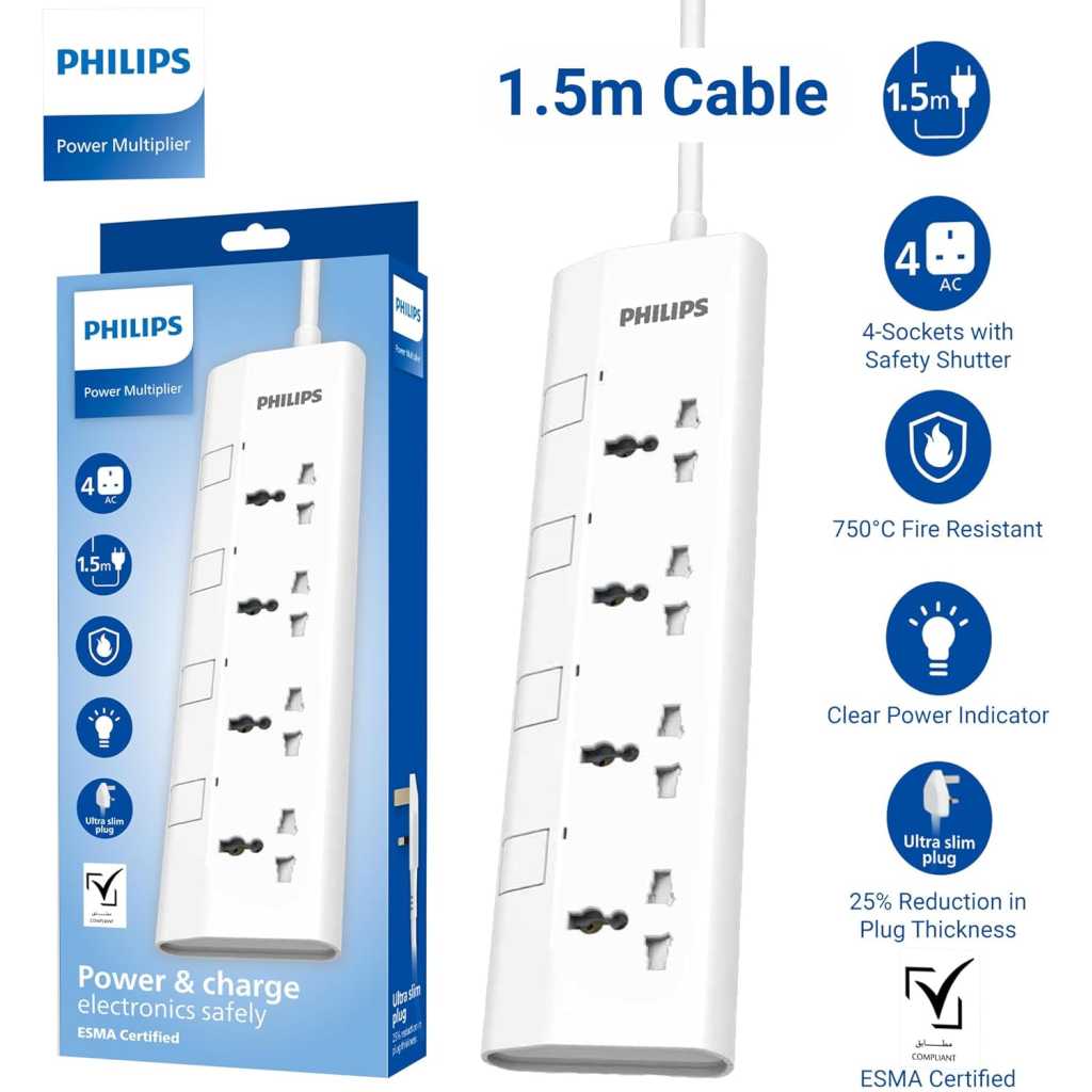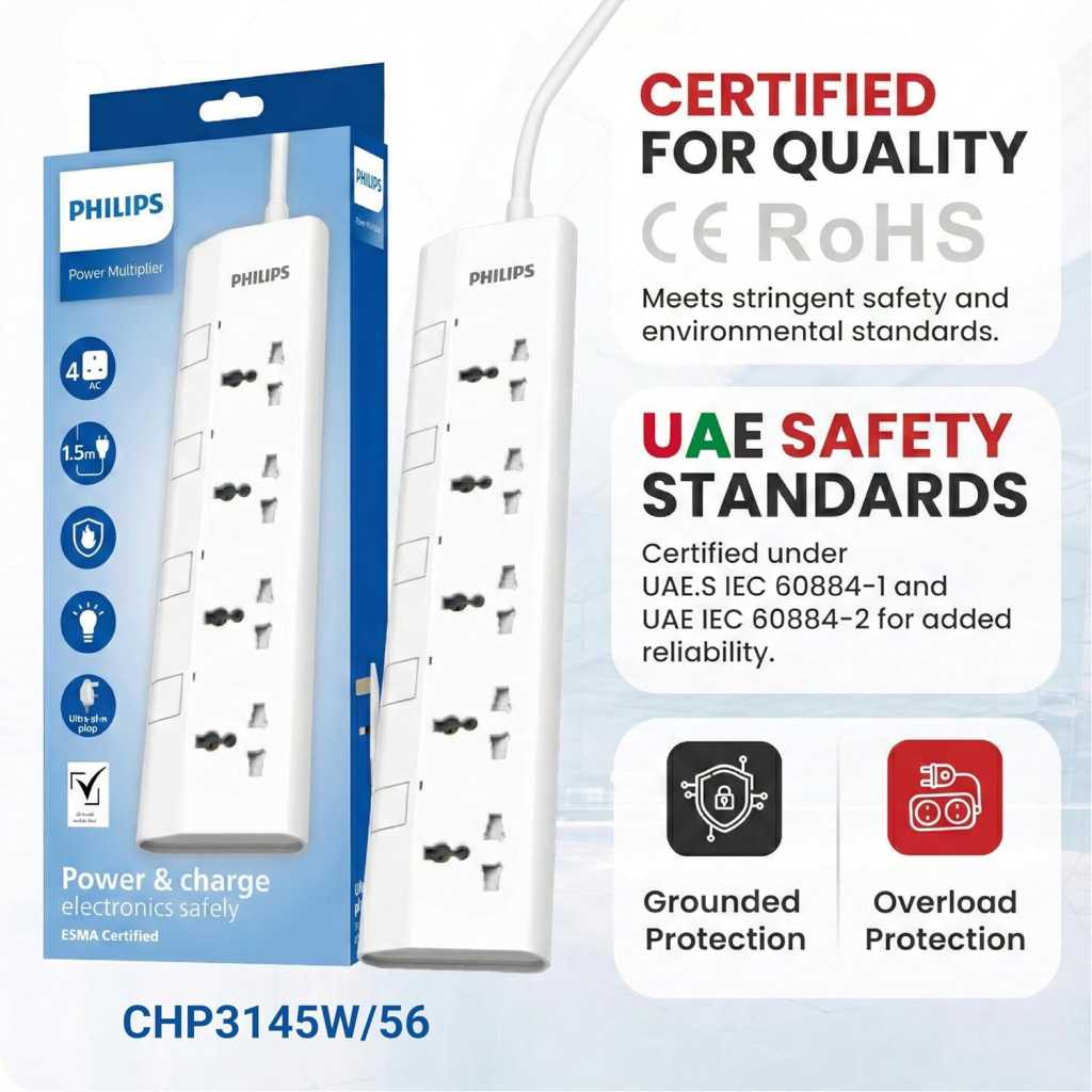 Key Features: ✅ Individual Control & Safety Shutters: Take full control of your power. Each of the 4 universal sockets features its own independent on/off switch and a clear power indicator light. Built-in safety shutters protect children and pets from accessing live parts. Always keep out of reach of children. ESMA & UAE SAFETY CERTIFIED: Charge with ultimate peace of mind. This power strip is fully ESMA Certified and compliant with all local UAE Safety Standards, including UAE S IEC 60884-1 and UAE S IEC 60884-2. Certified Overload & Fire Protection: Protect your valuable electronics. The strip is rated for a 2500W / 10A maximum load. The heavy-duty plug conforms to BS1363/A standards, contains a replaceable 13A fuse for overload protection, and features the official Safety Mark. The housing is 750°C fire-resistant. 1.5M Heavy-Duty 3x1mm² Cable: Enjoy flexible placement and superior performance. The 1.5-meter heavy-duty power cord is built with a 3x1mm² specification (100% pure copper) for superior conductivity, reduced heat, and maximum power efficiency. Ultra-Slim Plug & Power Indicators: Features a modern, ultra-slim plug that fits neatly behind furniture. A clear power indicator lets you know your power is functioning properly for each individual socket.