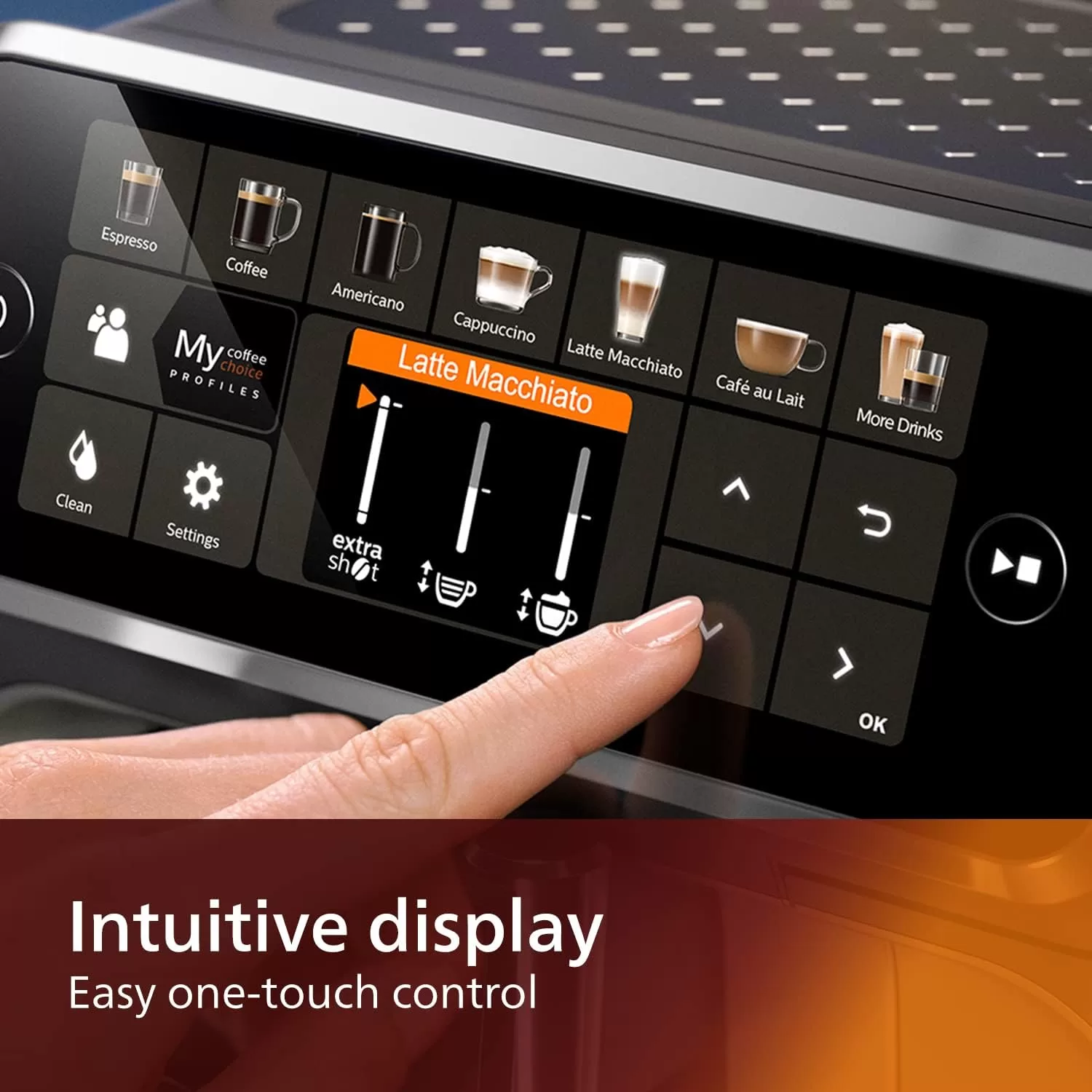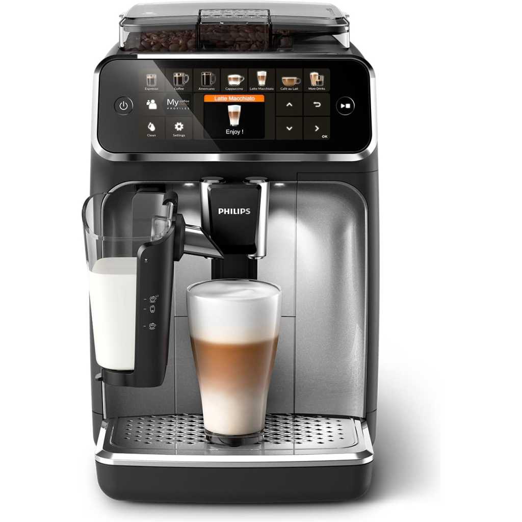 12 delicious fresh bean coffees, easier than ever LatteGo, the fastest to clean milk system ever* 12 Beverages LatteGo milk solution Black TFT display Key Features: Silky smooth froth: Get perfectly textured milk thanks to the high-speed LatteGo system – Made of only two dishwasher-safe parts and no tube for easy cleaning 12 beverages at your fingertips: Enjoy your favourite coffees, from powerful espresso to indulgent cappuccino Intuitive TFT display: Easily select your drink with this espresso machine’s simple one-touch interface – Adjust aroma strength and volume with the coffee customiser Boost intensity: With the ExtraShot function – Adds powerful flavour to your cup, without the bitterness Save your preferences: Store up to 4 people’s personal preferences for instant coffee selections and use the Coffee Customiser function to make any coffee your own by adjusting intensity, strength and milk length AquaClean included: the innovative AquaClean anti-calc filter allows you to enjoy up to 5000 cups without the need for descaling