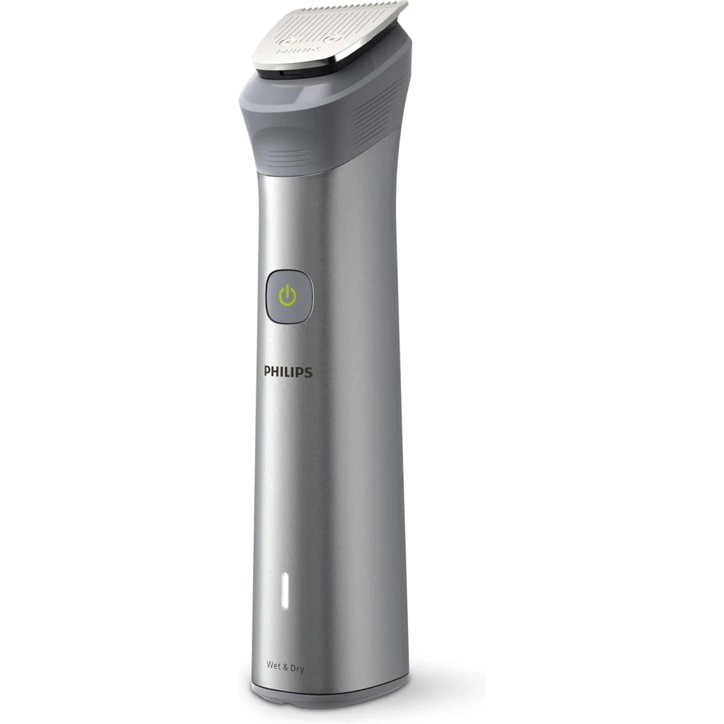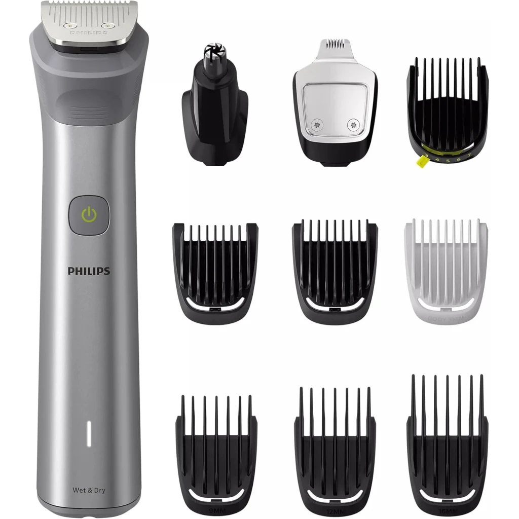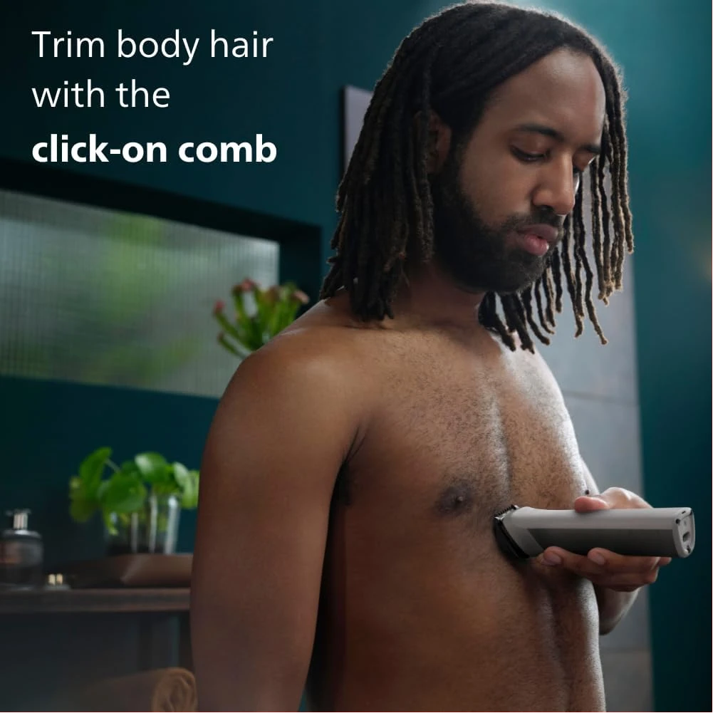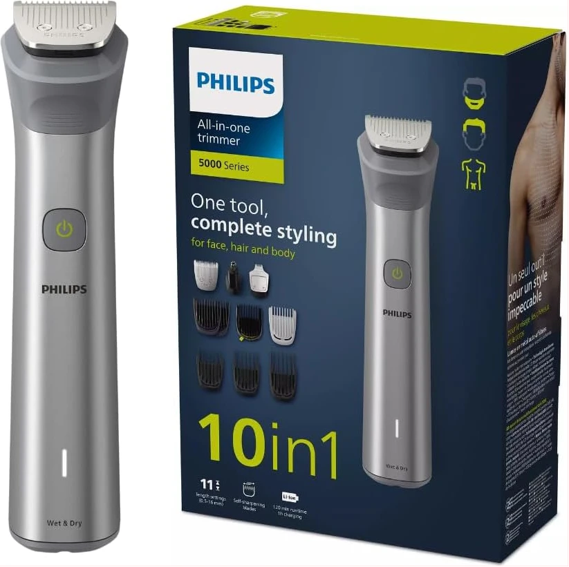 Philips All-in-One Series 5000, 10-in-1 Face, Hair and Body Trimmer, MG5920/15. The Philips OneBlade 5000 Series offers effortless trimming, shaving, and edging for both your face and body. Includes 12 tools for all your trimming needs Utilises BeardSense Technology scans beard density 125x per second and can increase cutting power for more bushy or longer beards. Choose from 11 lock-in length settings, ranging from 0.4mm to 5.0mm, to achieve the desired trimming and grooming style. Runs up to 4 weeks on a single charge, 120min runtime and comes with indicators to let you know exactly when’s time to charge. Its waterproof design allows for easy cleaning and can be used in both wet and dry conditions. Important information Safety Information Ensure the device is properly turned off and unplugged before cleaning or maintenance to reduce risk of electric shock. Avoid fully submerging the device in water, even though it is waterproof, to prevent damage.