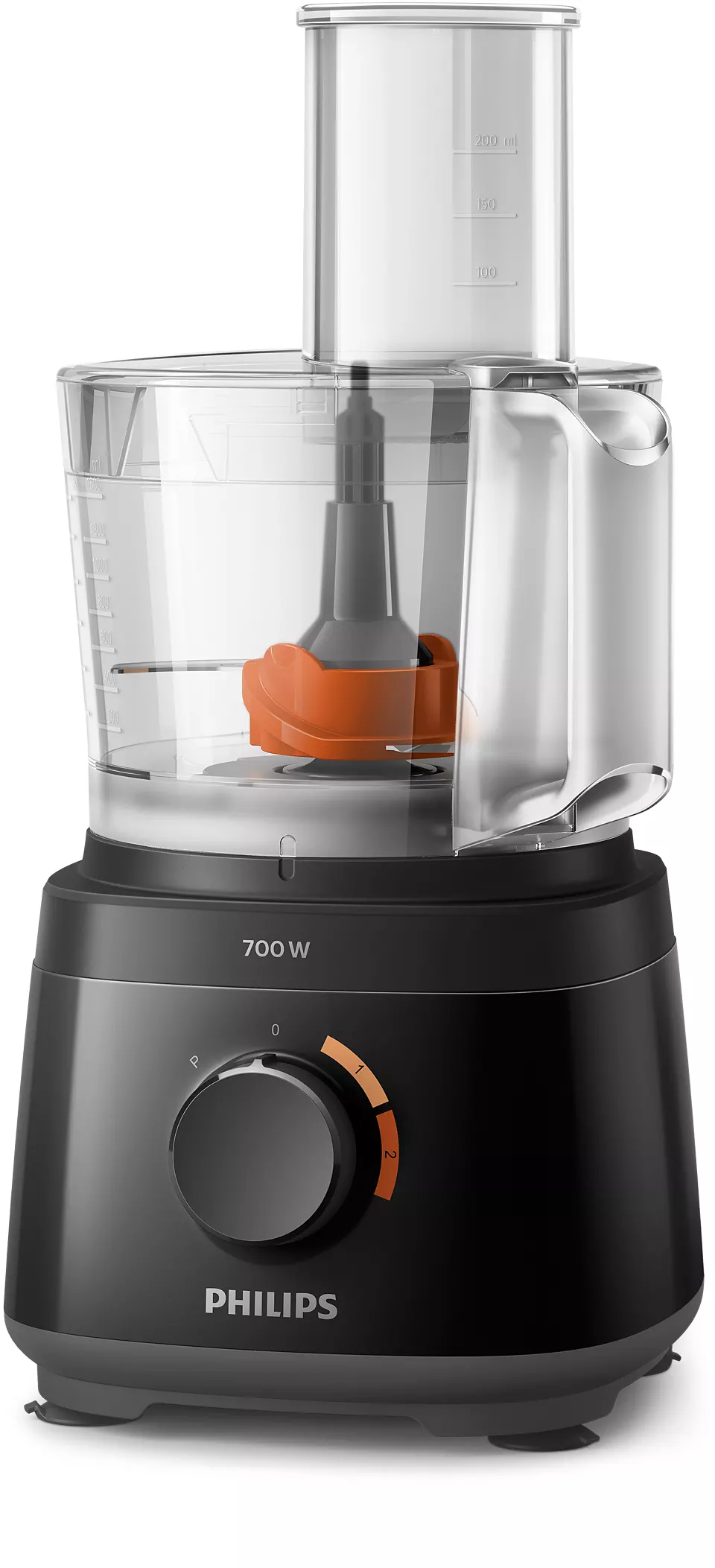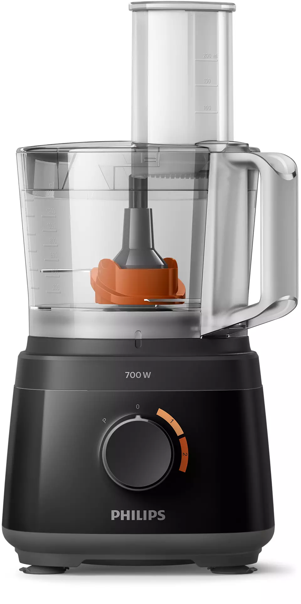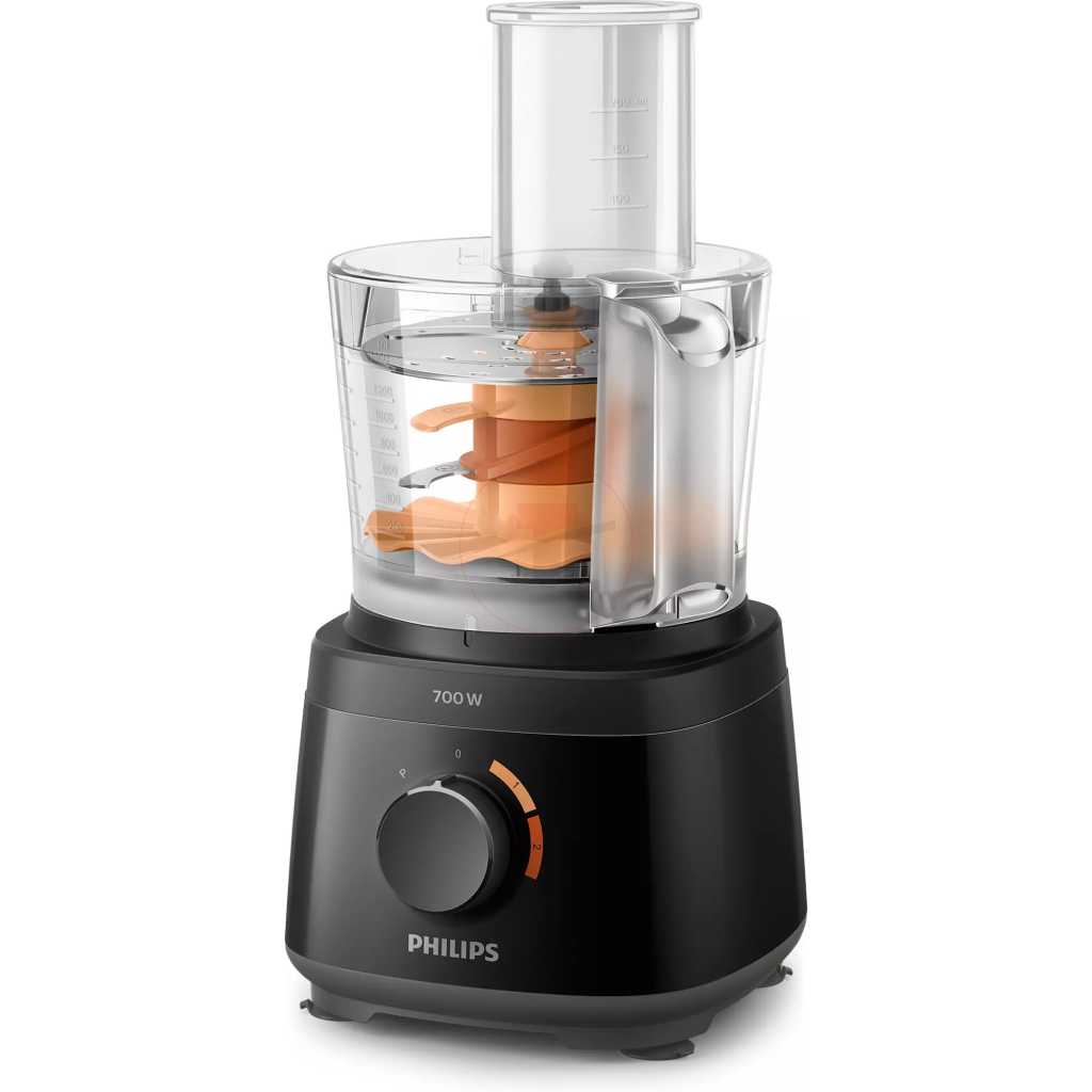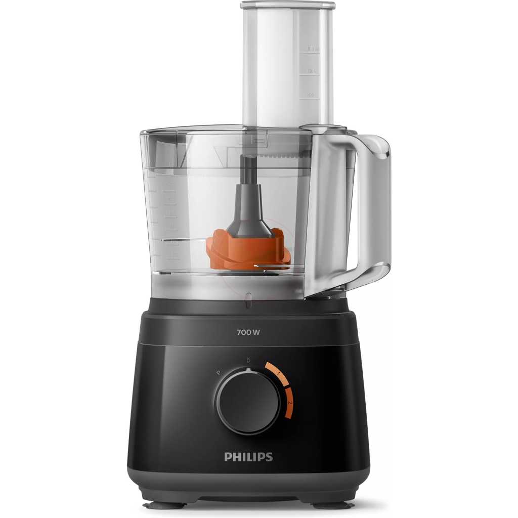 Philips Daily Collection Compact Food Processor HR7320/11 With Blender Jar – White/Beige – 700W. Powerful 700W motor for effortless processing Our powerful motor can easily handle a variety of ingredients from bread dough to hard vegetables, cheese and chocolate. It also slices and shreds with ease. Fast preparation with large feeding tube for minimal pre-cut Fast preparation with large feeding tube for minimal pre-cut. Quick and easy assembly of all parts Quick and easy assembly of all parts. All accessories are dishwasher safe All accessory parts can be put on the top rack of your dishwasher for easy cleaning. Resistant and transparent jar for heavy use The 1.5L resistant jar has a working capacity of 1L for up to 5 smoothie portions at once. Convenient all-in-one appliance: knead, whisk, shred, slice With more than 19 functions, there is no limt to what you can make: meals, bread, sauces and more. Use the high quality and multi-functional accessories to chop, puree and mince ingredients with the S-blade, or slice and shred with the 2-in-1 disc. Whatever you’re in the mood for, whip, whisk, knead and more. Color-coded speed and accessories guide for easy matching For perfect results every time, just match the accessory color to the same speed color. Use speed 1 to whip cream, beat eggs, make pastries and bread doughs. Speed 2 is ideal to chop onions, mince meat, make smoothies and more. Smaller footprint and in bowl storage for all accessories The compact Daily Food Processor takes up less countertop space, yet is fully equipped with all of the kitchen essentials that you can easily store inside of the bowl. 2 –in-1 double-sided stainless steel discs: shred & slice Ergonomic, double-sided disc makes it easy to slice with one side and shred with the other side! Make up to 5 portions at same time with 1.5L bowl capacity The generous 2.1L bowl (1.5 L working capacity) lets you blend up to 5 portions of soup in one go.