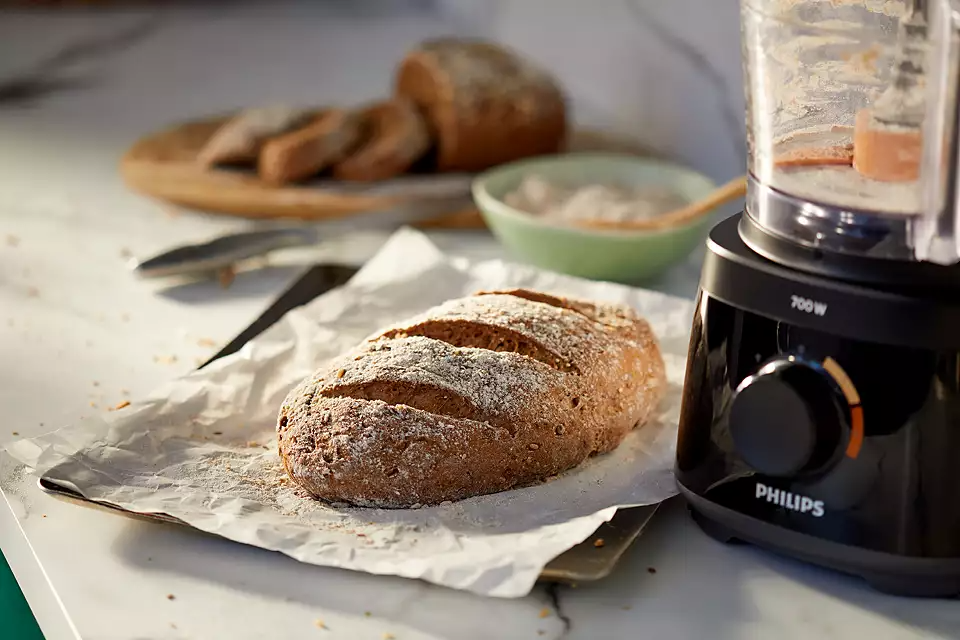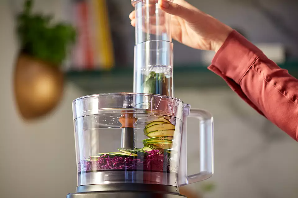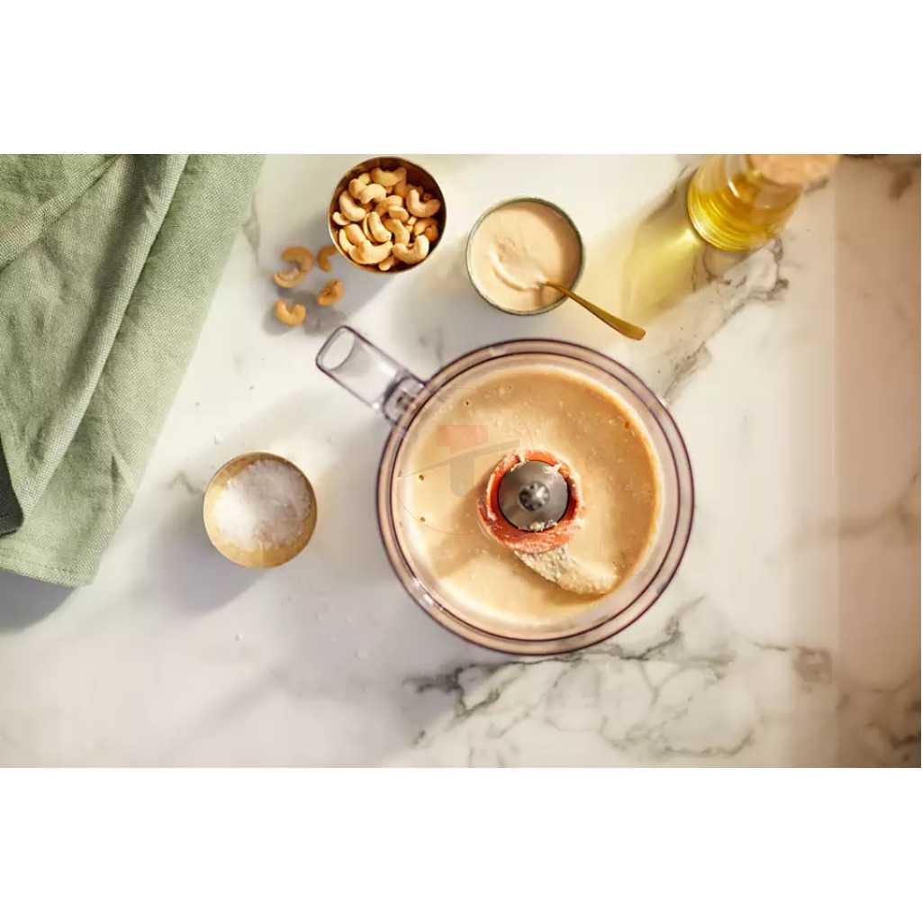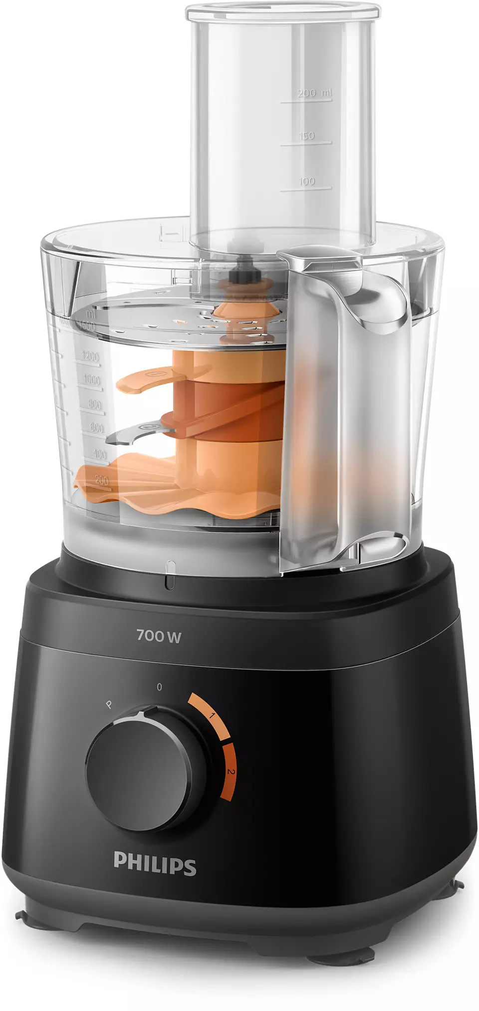 Philips Daily Collection Compact Food Processor HR7320/11 With Blender Jar – White/Beige – 700W. Powerful 700W motor for effortless processing Our powerful motor can easily handle a variety of ingredients from bread dough to hard vegetables, cheese and chocolate. It also slices and shreds with ease. Fast preparation with large feeding tube for minimal pre-cut Fast preparation with large feeding tube for minimal pre-cut. Quick and easy assembly of all parts Quick and easy assembly of all parts. All accessories are dishwasher safe All accessory parts can be put on the top rack of your dishwasher for easy cleaning. Resistant and transparent jar for heavy use The 1.5L resistant jar has a working capacity of 1L for up to 5 smoothie portions at once. Convenient all-in-one appliance: knead, whisk, shred, slice With more than 19 functions, there is no limt to what you can make: meals, bread, sauces and more. Use the high quality and multi-functional accessories to chop, puree and mince ingredients with the S-blade, or slice and shred with the 2-in-1 disc. Whatever you’re in the mood for, whip, whisk, knead and more. Color-coded speed and accessories guide for easy matching For perfect results every time, just match the accessory color to the same speed color. Use speed 1 to whip cream, beat eggs, make pastries and bread doughs. Speed 2 is ideal to chop onions, mince meat, make smoothies and more. Smaller footprint and in bowl storage for all accessories The compact Daily Food Processor takes up less countertop space, yet is fully equipped with all of the kitchen essentials that you can easily store inside of the bowl. 2 –in-1 double-sided stainless steel discs: shred & slice Ergonomic, double-sided disc makes it easy to slice with one side and shred with the other side! Make up to 5 portions at same time with 1.5L bowl capacity The generous 2.1L bowl (1.5 L working capacity) lets you blend up to 5 portions of soup in one go.