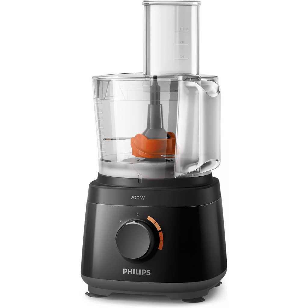 Key Features: Philips Daily Collection Compact Food Processor HR7320/11 With Blender Jar – White/Beige – 700W. 700W motor power for high efficiency when mixingh. Blender Jar. Kneading tool 3 disc inserts 2L bowl with 40% feeding tube. Improved chopping blade