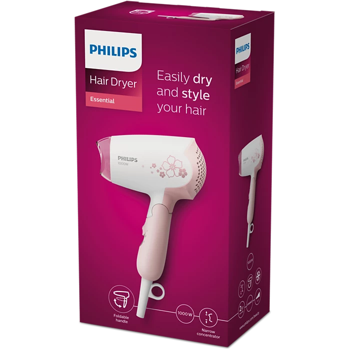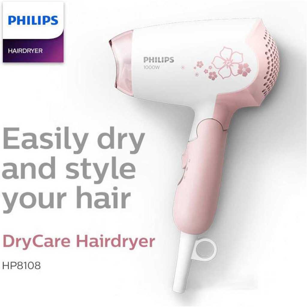 Philips DryCare Hair Dryer HP8108/00,1000 Watts 1.5M And 220/240 V, 2 Flexible Speed Settings, Foldable Hand, Cool Air Setting, Compact Design, Peach 1000W power for gentle drying 1000W power for gentle drying this Philips dry care 1000W hairdryer creates the optimal level of airflow and gentle drying for beautiful results everyday. 2 flexible speed settings for gentle drying 2 flexible speed settings for gentle drying. This hairdryer offers 2 pre selected speed or heat combinations to make it quick and easy to achieve the perfect style. Foldable handle for easy storage foldable handle for easy storage. This hairdryer has foldable handle, making it easy to pack, store and take with you anywhere you go. Narrow concentrator for focused airflow. The concentrator focuses airflow through the opening to specific areas. This results in better touch ups or more precise styling to finish your look. Compact design for easy handling and ergonomic, this hairdryer benefits from a clever modern design. This results in a dryer that is light and easy to handle yet small enough to store virtually anywhere. 2 years of worldwide guarantee. Cool air setting for extra gentle drying cool air setting for extra gentle drying. The cool air setting allows you to dry your hair at a more caring temperature, perfect for gentle drying and minimizing damage during the hot summer seasons. 1.5 meter cord for maximum flexibility. Key Features: Philips DryCare Hair Dryer HP8108/00,1000 Watts 1.5M And 220/240 V, 2 Flexible Speed Settings, Foldable Hand, Cool Air Setting, Compact Design, Peach 2 flexible speed settings for gentle drying Foldable handle for easy storage Narrow concentrator for focused airflow and cool air setting for extra gentle drying Compact design for easy handling and 1.5 meter cord for maximum flexibility 1000W power for gentle drying and 2 years of worldwide guarantee