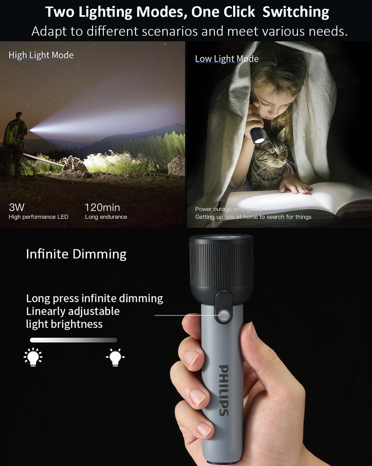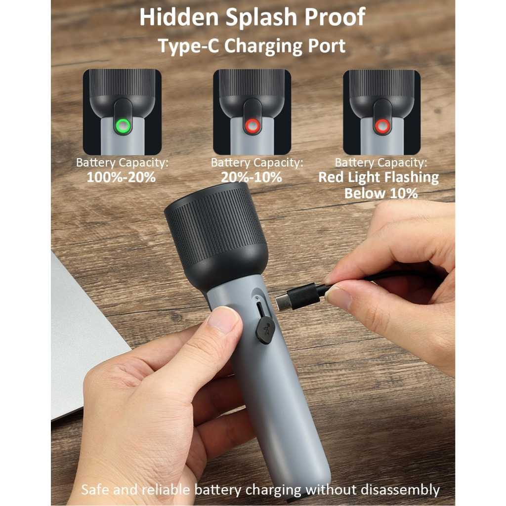 【Multifunctional Flashlight】The mini flashlight design with 400lm and the led light has a maximum illumination range of 150 meters, whether you’re camping, hiking, or other indoor, outdoor activities, our super bright flashlight will provide the reliable lighting you need 【2 Lighting Modes Torch Light】Supporting flashlight high/low light mode. Click to switch between high/low light flashlight. Long press to change light brightness in high & low mode, suitable for various use scenarios 【2000mAh Long Endurance】Torch light Built in 2000mAh rechargeable lithium battery, capable of illuminating for 120 minutes in high mode, paired with USB-C charging port for easy charging at any time 【Waterproof & Anti Drop】12 month warranty. The flashlight is made of durable ABS+PC material, high strength and good toughness, drop resistance height of 1.5 meter. Hidden waterproof USB-C charging port, IP44 waterproof and dustproof, safe and reliable 【Power Indicator Light & Anti-Slip】The remaining battery level indicator light is green for 100% -20%, red for 20% -10%, and flashing red for less than 10%. The anti slip pattern makes you grip more firmly, not afraid of bumps, compact and easy to carry, suitable for various outdoor use scenarios