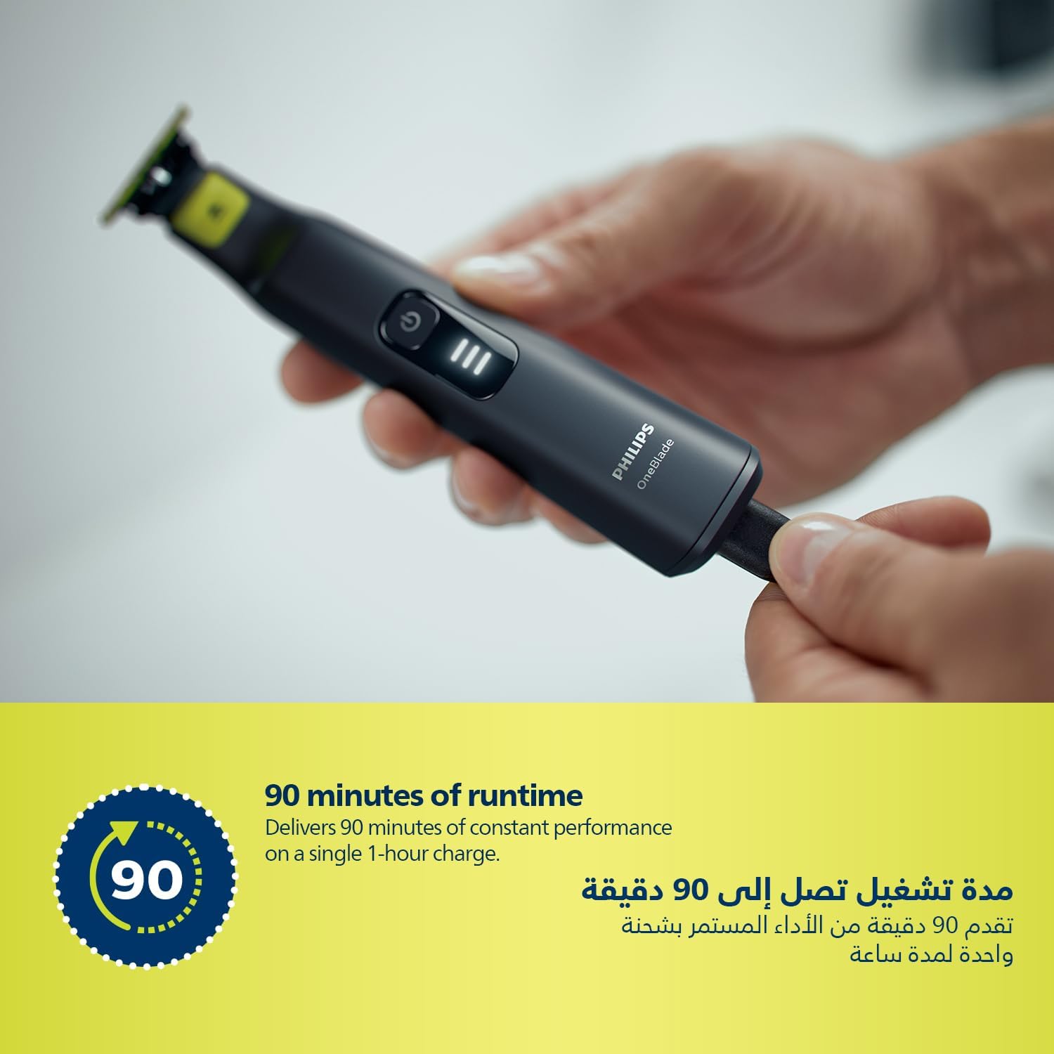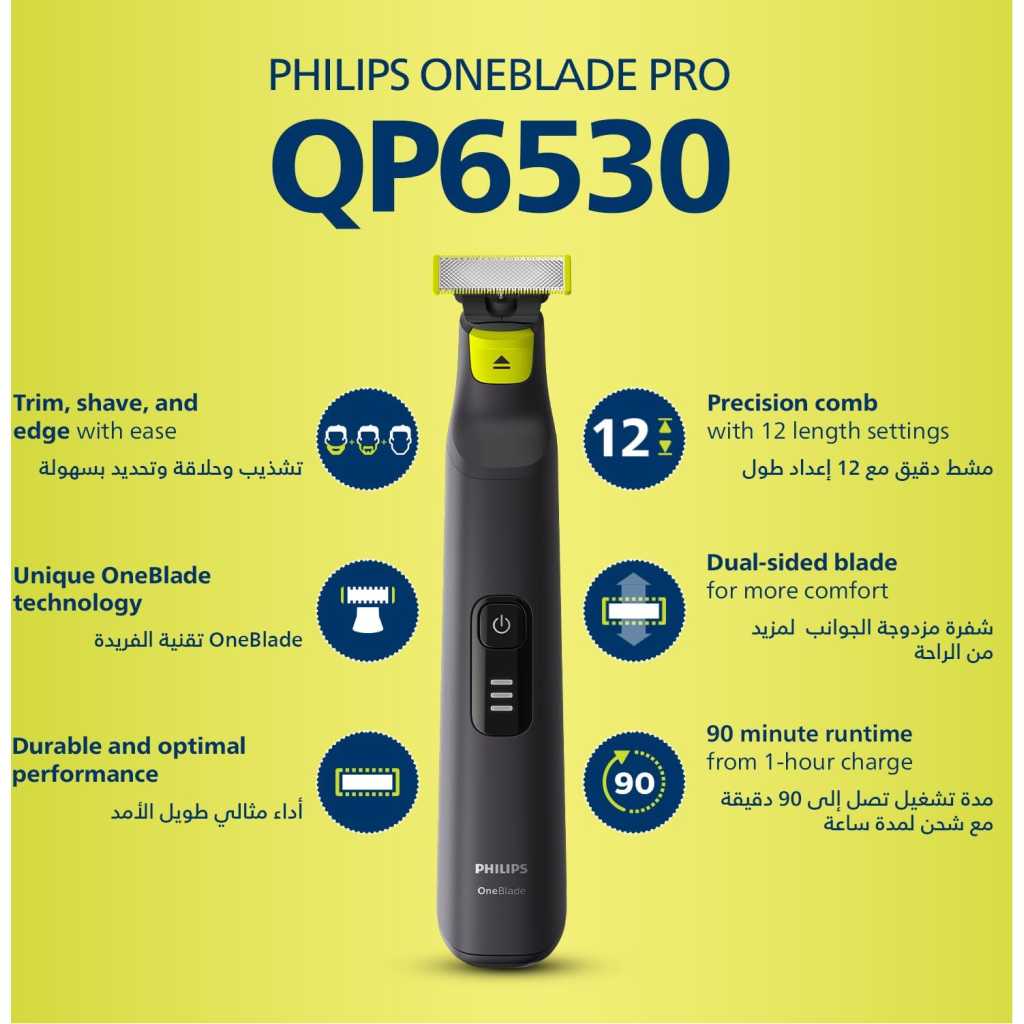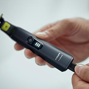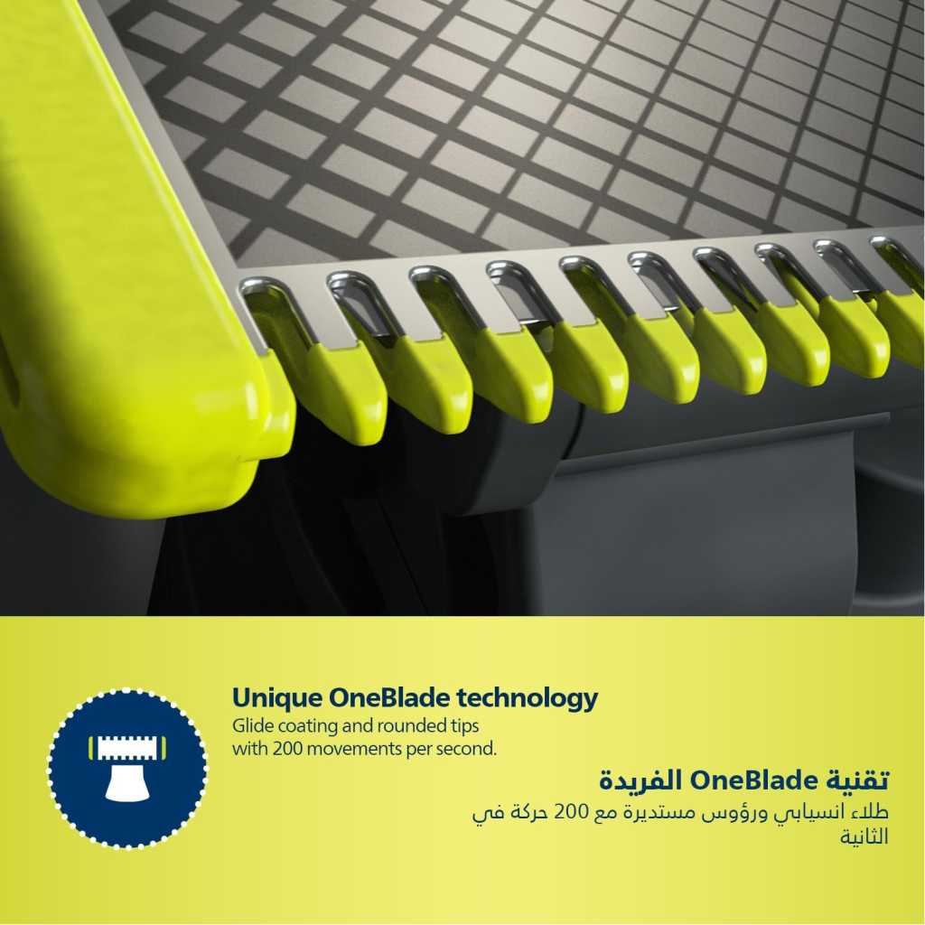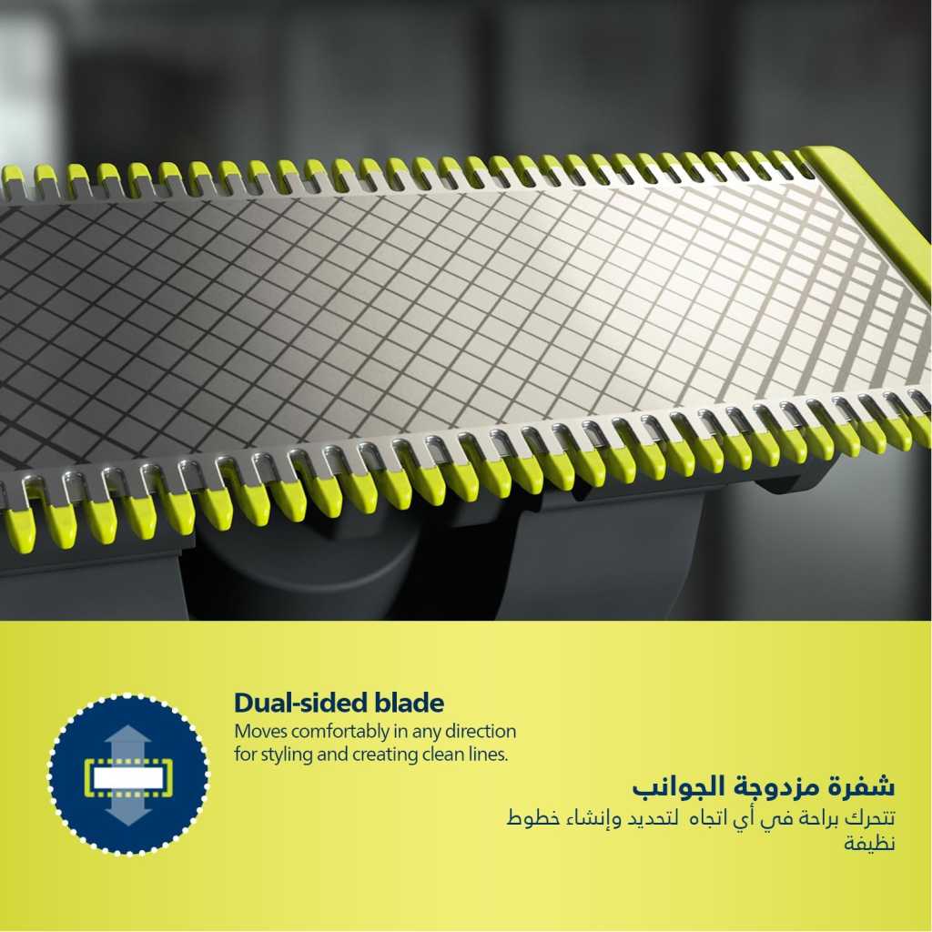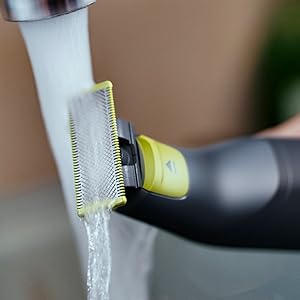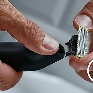 From the manufacturer Key Features: Designed for facial styling and body grooming, the Philips OneBlade trims, edges and shaves any length of hair. It delivers an easy and comfortable shave thanks to a glide coating and rounded tips. And with a cutter that moves at 200x per second, it’s efficient even on longer hairs. Trim to your preferred stubble length.Your Philips OneBlade comes with a precision comb with 12 lengths that you can use to create everything from a 5 o’clock, to tight trim, to longer beard style. Get precise lines in seconds with the dual-sided blade that enables you to see every hair you’re cutting. The OneBlade shaver doesn’t shave as close as a traditional blade, ensuring your skin stays comfortable. Go against the grain and shave off any length of hair easily. A wet and dry shaver that allows you to trim to your preferred hair length with 12 different settings from 0.5mm to 9mm. OneBlade follows the contours of your face, allowing you to easily and comfortably trim and shave all areas. Use the dual-sided blade to style your edges and create clean lines by moving the blade in any direction. Easily replace your blade once every 4 months for optimal performance. A green useage indicator will appear once the blade is worn out. Use this waterproof razor at the sink or take it with you into the shower. The OneBlade wet and dry razor is easy to clean and can be used with or without foam. A single charge takes 1 hour, and delivers 90 minutes of constant performance. Ensure that your OneBlade Pro is always ready to go. The battery indicator alerts you when your battery is low, and indicates charging progress when plugged in.
