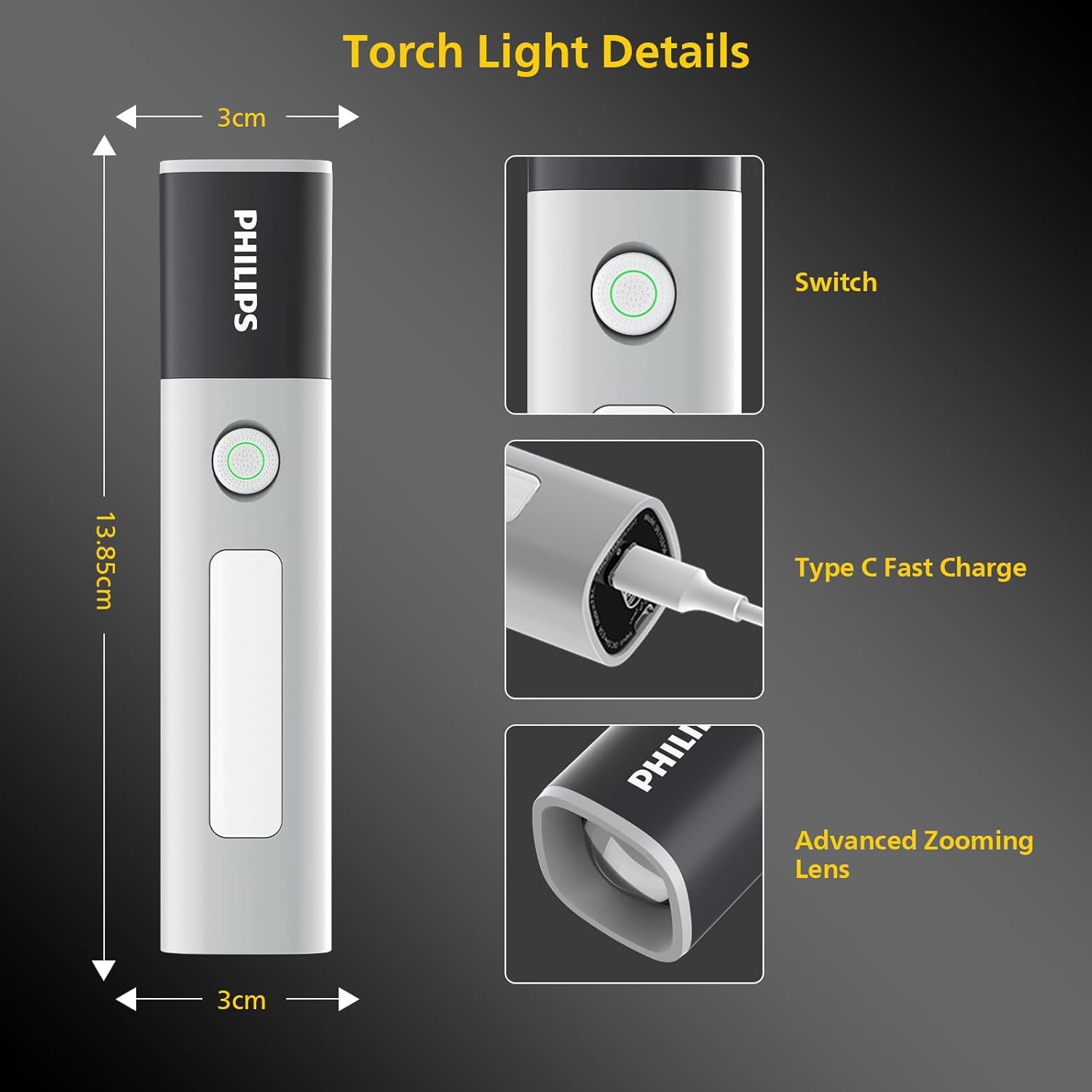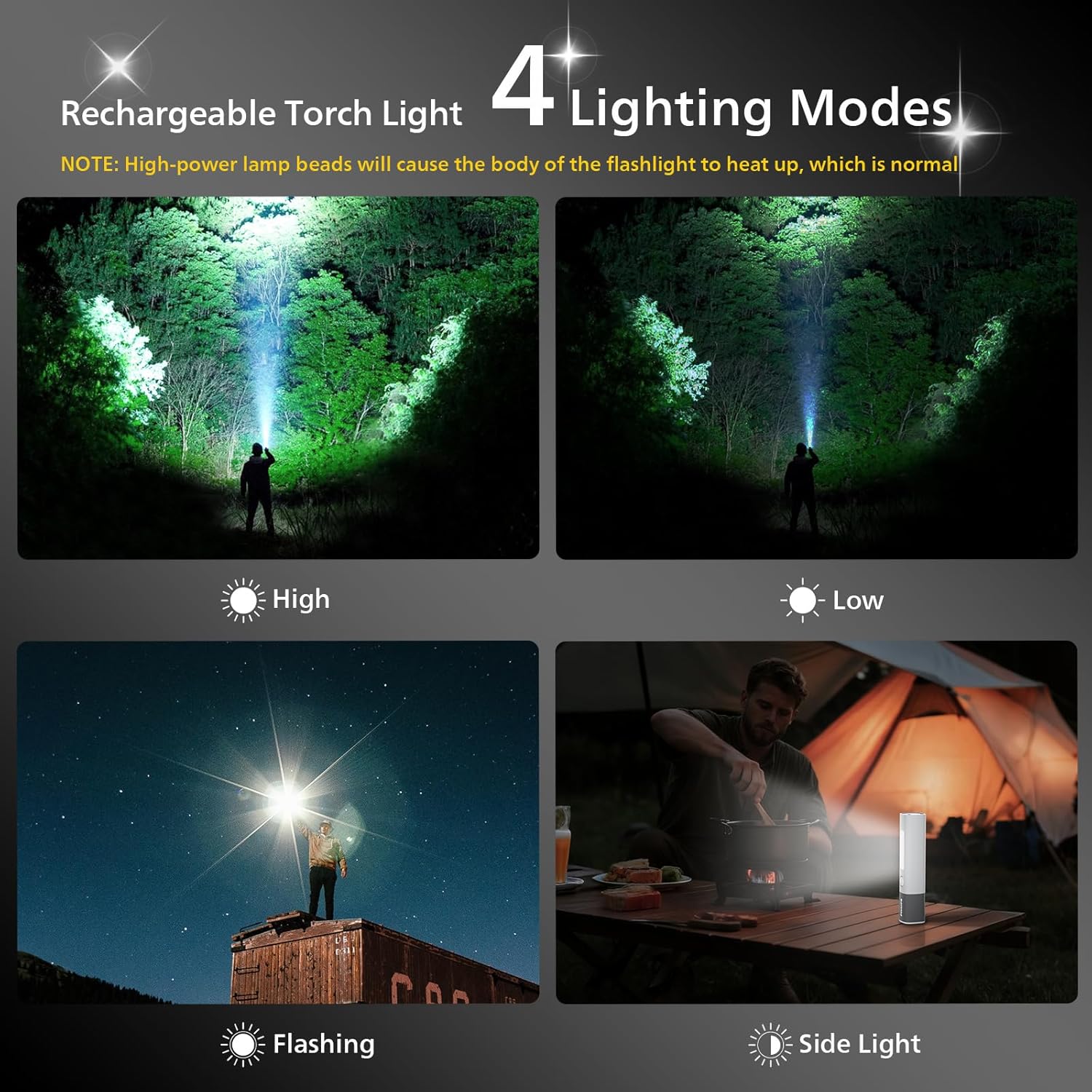 【Multifunctional Flashlight】The mini flashlight design with 200lm and the led light has a maximum illumination range of 150 meters, whether you’re camping, hiking, or other indoor, outdoor activities, our super bright flashlight will provide the reliable lighting you need 【4 Lighting Modes Torch Light】Supporting flashlight normal(high/low/off light) mode, stepless dimming mode, flashing mode, SOS mode. Click to switch 1.high light mode 2.low light mode 3. flashing mode 4.side light mode, suitable for various use scenarios 【1200mAh Long Endurance】Torch light Built in 1200mAh rechargeable lithium battery, capable of illuminating for 300 minutes in low light mode&120 minutes in high light mode, paired with USB-C charging port for easy charging at any time 【Telescopic Zoom】Adjustable high and low beams, adjustable illumination range through telescopic flashlight, 150 meter long focusing beam for further illumination, 70 ° defocused short distance wide range illumination for clearer field of view. Whether focused or defocused, it can present perfect light shape 【Waterproof & Anti Drop】12 month warranty. The flashlight is made of durable ABS+PC material, high strength and good toughness, drop resistance height of 1 meter. Hidden waterproof USB-C charging port, IP44 level, waterproof and dustproof, safe and reliable 【Power Indicator Light & Anti-Slip】The remaining battery level indicator light is green for 100% -20%, red for 20% -10%, and flashing red for less than 10%. The anti slip pattern makes you grip more firmly, not afraid of bumps, compact and easy to carry, suitable for various outdoor use scenarios