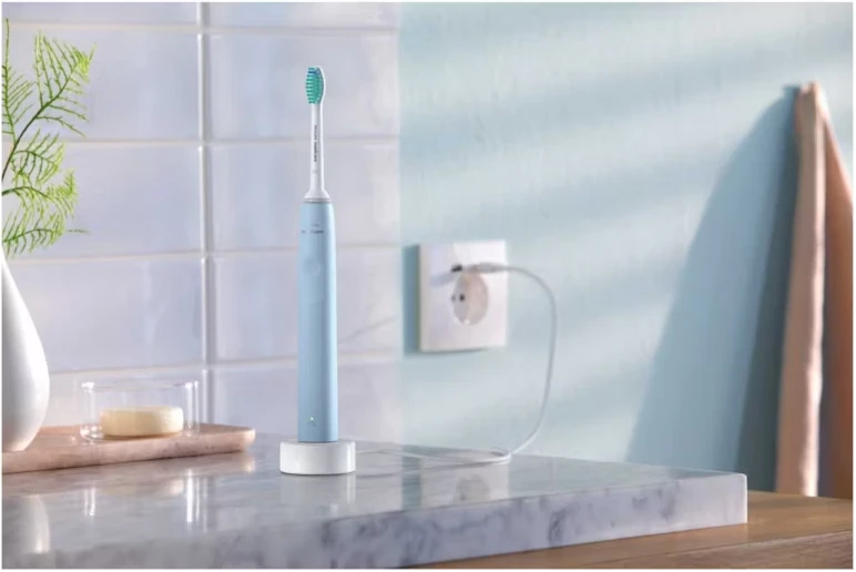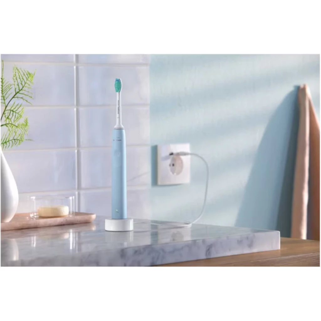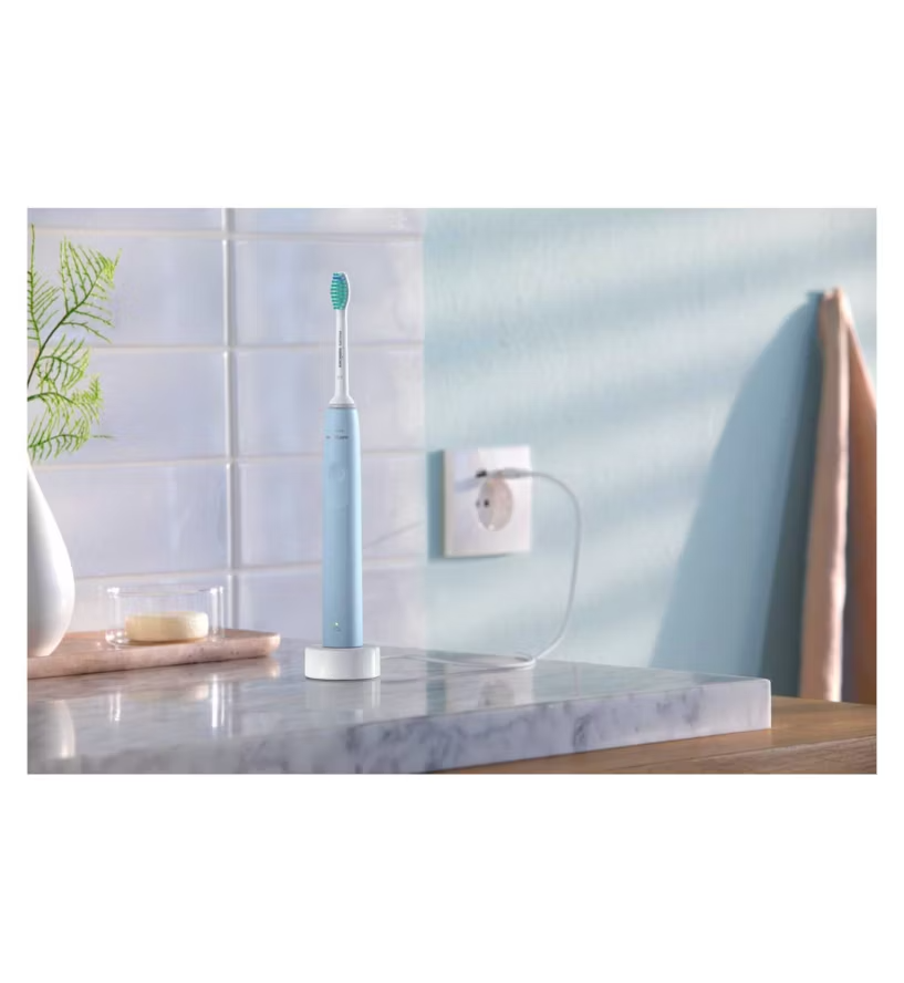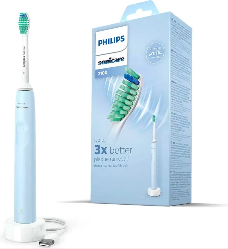 Goodbye manual toothbrush. Hello Sonic technology. Advanced Sonic Technology Powerful bristle vibrations drive microbubbles deep between your teeth and along your gum line for a refreshing experience. You will get two months’ worth of manual brushing in just 2 minutes.** 31,000 brush strokes per minute gently clean your teeth, break up plaque, and sweep it away for an exceptional daily clean. Removes up to 3x more plaque The Sonicare electric toothbrush with advanced sonic technology is clinically proven to remove plaque up to 3X better* than a manual toothbrush. It removes plaque from your teeth and along the gum line, without being harsh and whilst protecting your gums. SmartTimer and QuadPacer 2 minute SmarTimer and 30-second QuadPacer guide you to brush for the recommended time in all areas of your mouth to ensure a complete clean. Designed around you Slim, light-weight, and ergonomic design makes the toothbrush easy to hold and use so that you can get an amazing clean without any strain. Long lasting battery life Battery life lasts up to 14 days so you can go long periods without charging. Easy-start Our Easy-Start program gives you the option of a gradual, gentle increase in brushing power the first 14 times you use your new toothbrush. Goodbye adapter. Hello USB. Power adapters may seem small, but added together, their plastics make a huge impact on the environment. By switching to USB charger in our Philips Sonicare 1000-4000 Series alone, we can use up to 189,210 kg less plastic every year. That’s powerful, right? Key Features: Philips Sonicare Series 2100 Electric Toothbrush. Two different intensity settings achieve a gentle yet effective clean. Battery life up to 14 days 2 minute SmarTimer with QuadPacer ensure Dentist-recommended brushing time Slim ergonomic design makes brushing easier and more comfortable Easy-start gently eases you into the electric brushing experience by gradually increasing power Long battery life with battery light indicator: One charge last for 2 weeks Includes: 1 Philips Sonicare 2100 electric toothbrush, 1 SimplyClean (C1) brush head, and 1 USB charger (wall adaptor not included) Subscribe & Save on genuine Philips Sonicare brush head replacements and save up to 15%.