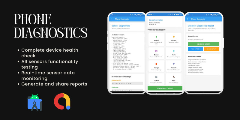 Phone Diagnostic With Admob Ads Android. Comprehensive phone diagnostic app with real-time battery, sensor, storage, network analysis and PDF reports.