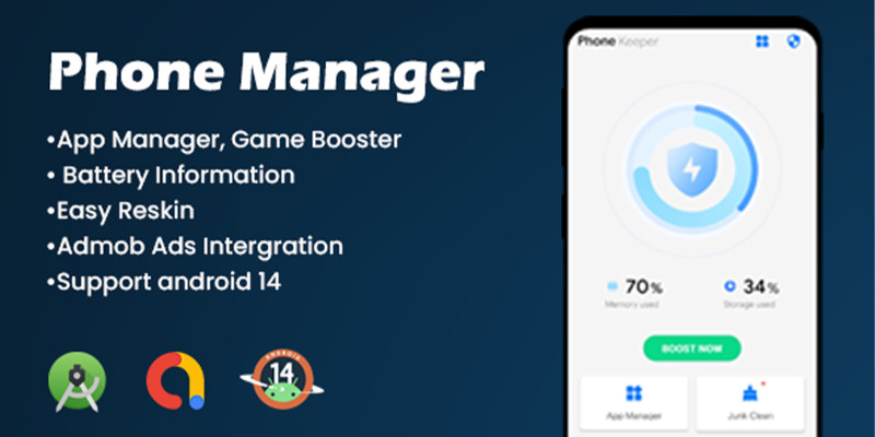 Phone Manager - Android App Template. Optimize storage, boost performance, and manage apps easily.