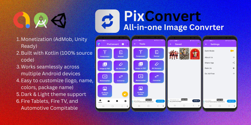 PixConvert – All-in-One Image Converter App Unit. A modern Android app to convert, compress, and manage images in multiple formats with a clean UI, AdMob integration, and offline .