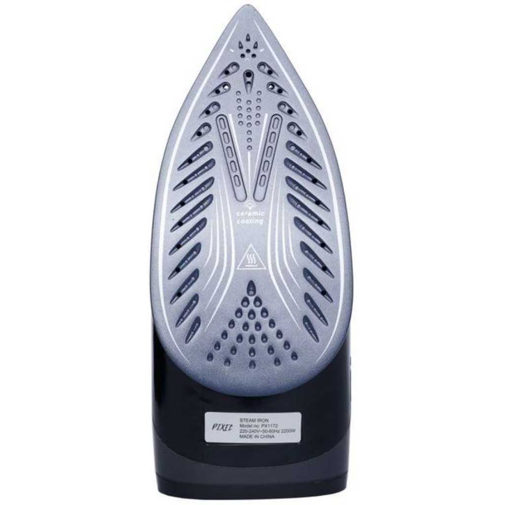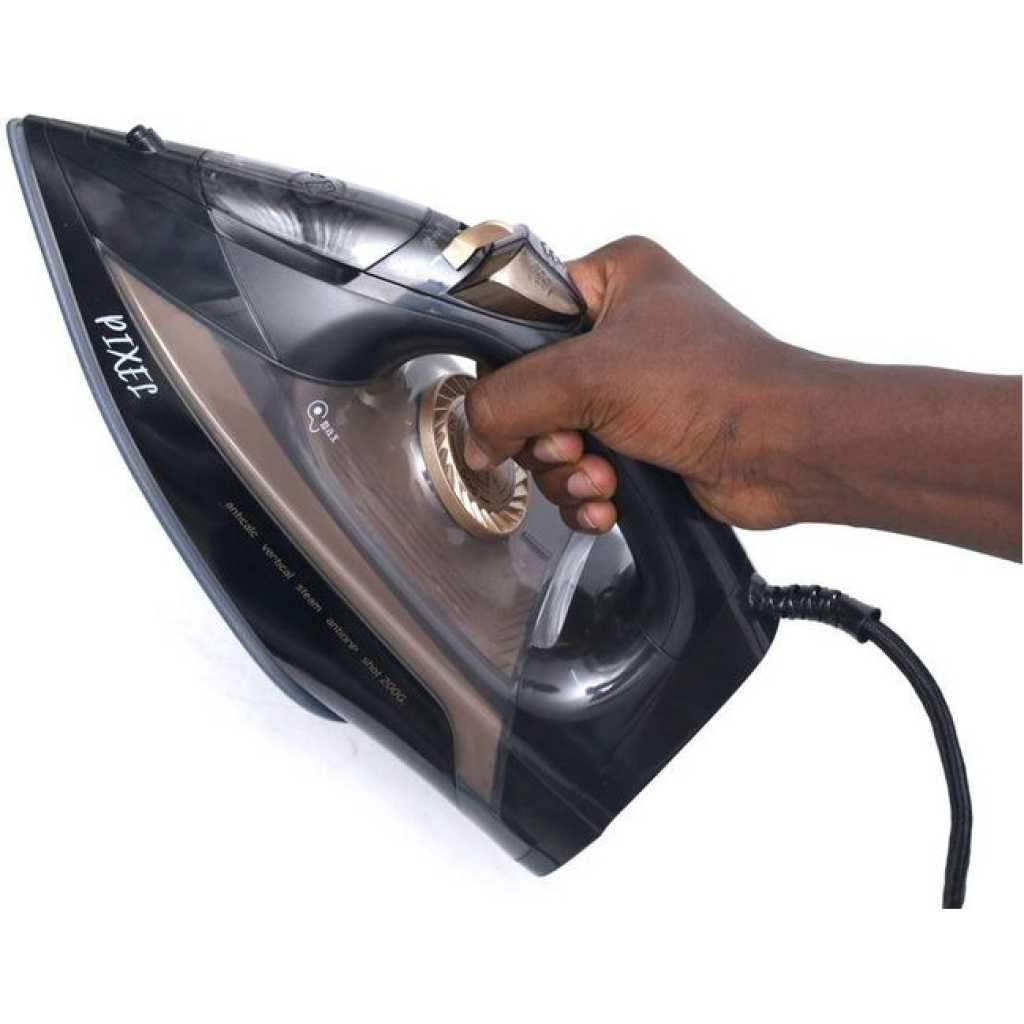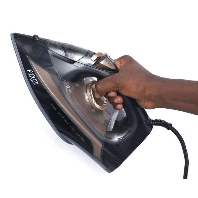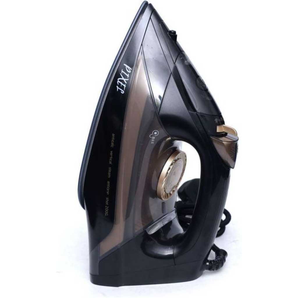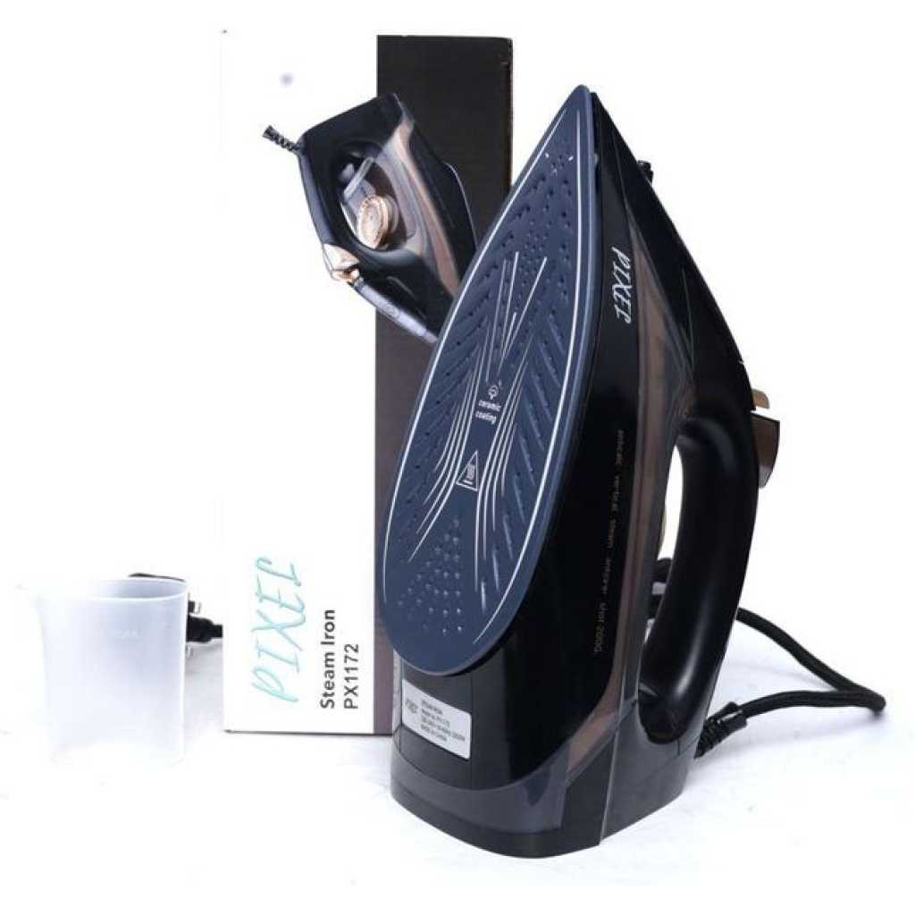 Pixel Steam Flat Dry Iron – Black This is an efficient steam iron that will be useful in ironing your laundry. It is designed with a ceramic soleplate which is non stick, it has a temperature control dial, it has a variable steam control and a powerful burst function.it is small in size and may be very useful during travel because it is absolutely portable. .It works well with electricity because of it’s over heat protection component. It has a transparent water level window and a pilot indicator light. It is highly recommended to those traveling.