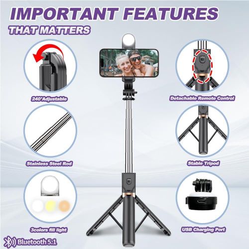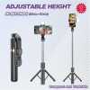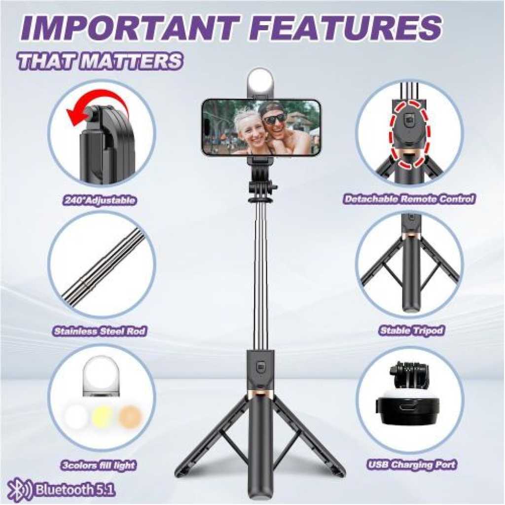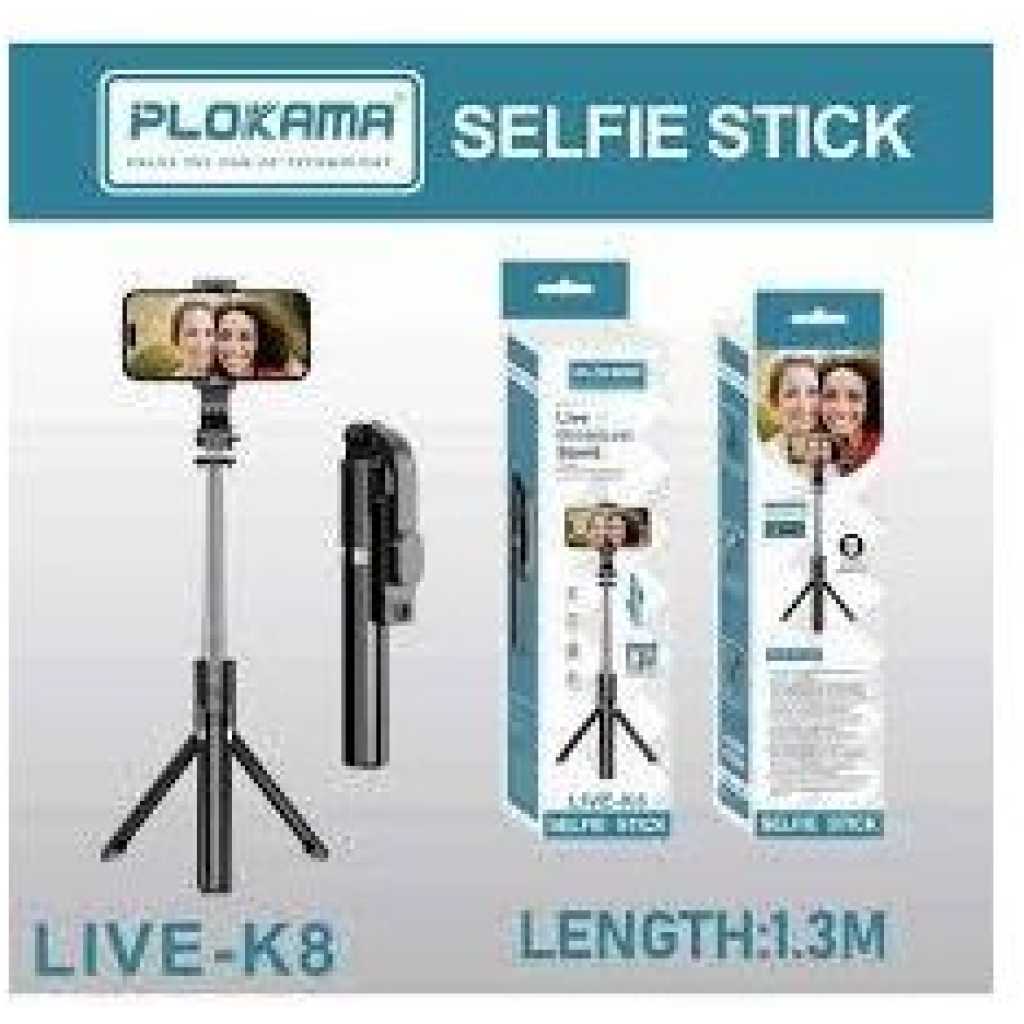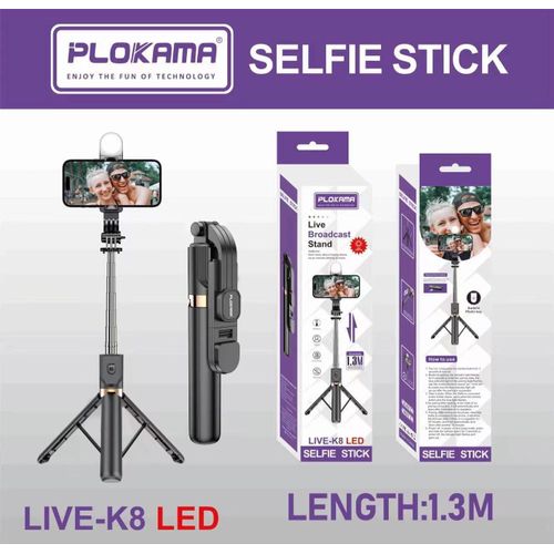 Product description Plokama Live K8 LED 4-in-1 Selfie Stick Tripod, Black, Steel & ABS, 20-130 cm, with LED Light, Bluetooth Remote, Phone Holder for Live Streaming, Vlogging Key Features: 4-IN-1 DESIGN: Versatile selfie stick combines tripod stand, LED light ring, and Bluetooth remote control for complete mobile photography and streaming solution ADJUSTABLE LENGTH: Extends from compact 20 cm to full 130 cm length, perfect for wide-angle shots and group photos while remaining portable LIGHTING FEATURES: Built-in LED light with multiple brightness modes ensures well-lit photos and videos in any environment WIRELESS CONTROL: Detachable Bluetooth remote allows hands-free operation from up to 10 metres away for convenient photo and video capture UNIVERSAL COMPATIBILITY: Flexible phone mount supports both portrait and landscape orientations, suitable for iOS and Android devices