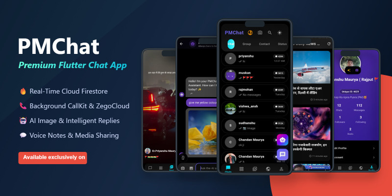 PMChat - Flutter Application. PMChat is a complete Flutter chat app with WhatsApp-style background calling, AI image generation,real-time messaging, voice/video