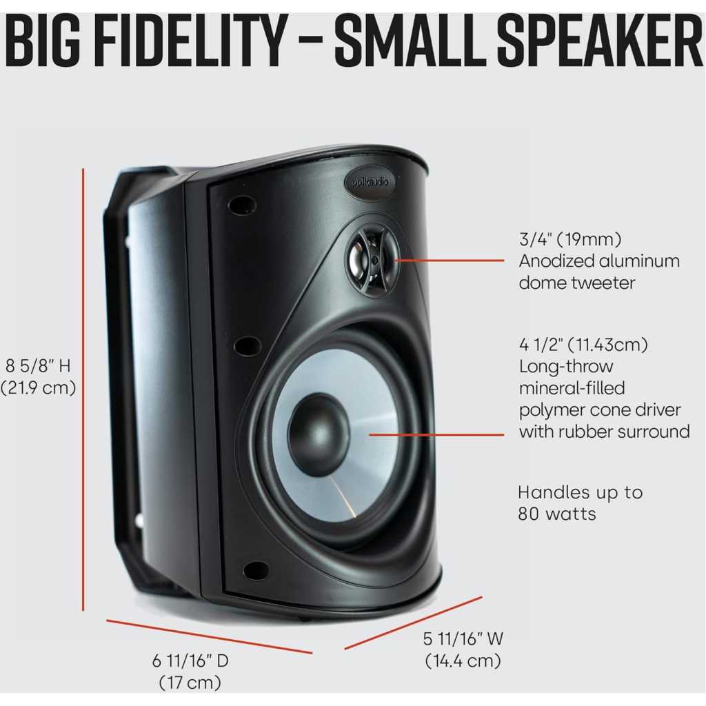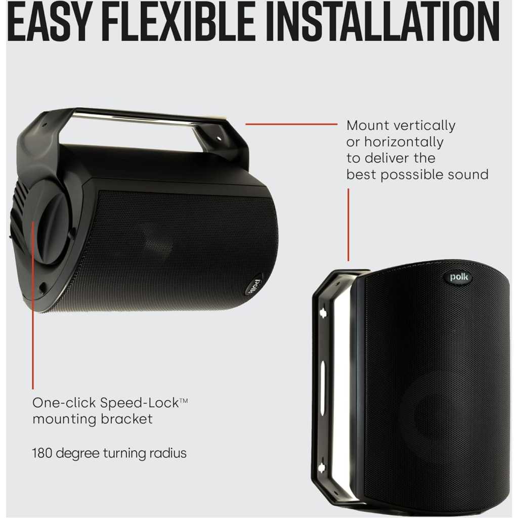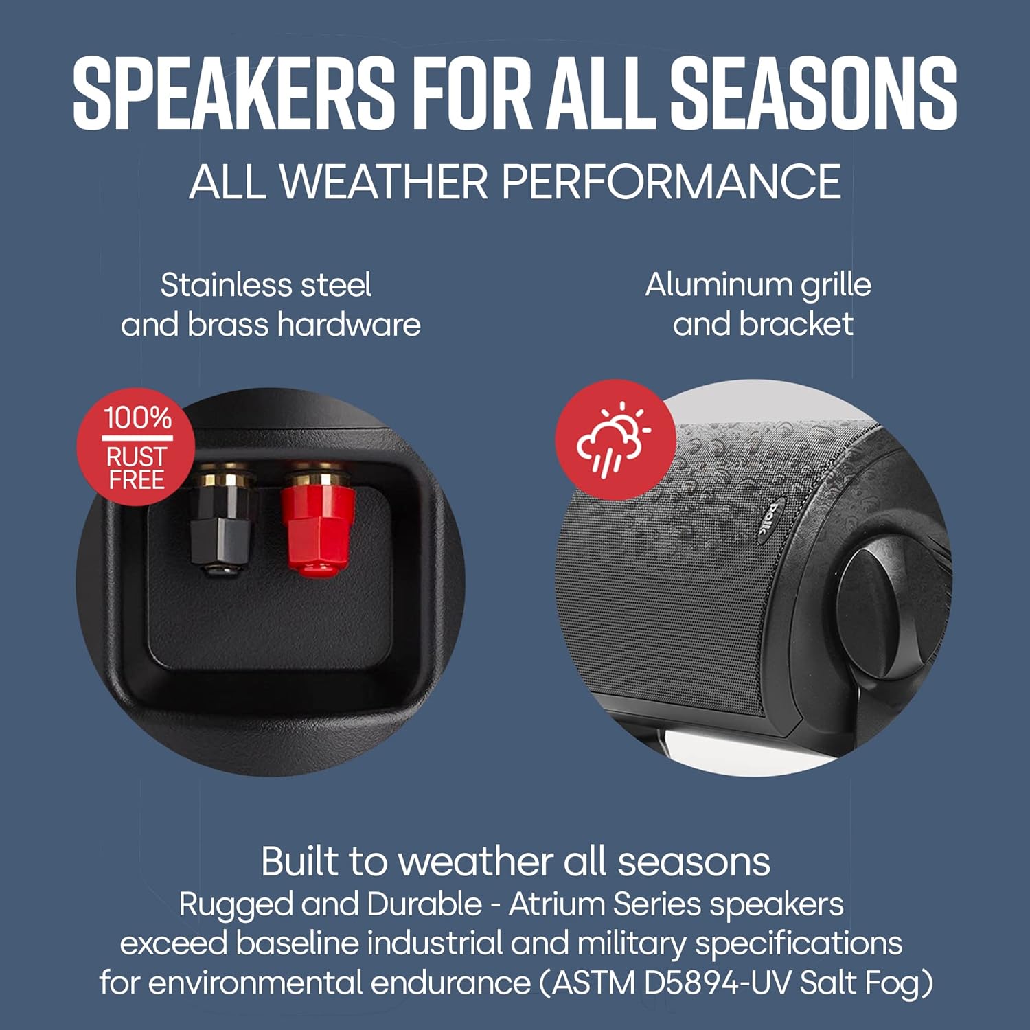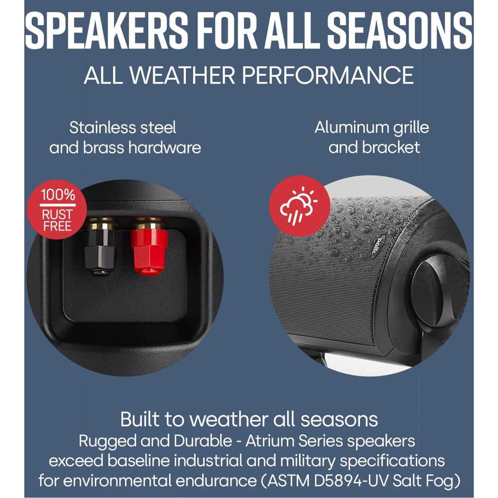 Key Features: CREATED TO LIVE AND PLAY OUTDOORS – To deliver exceptionally great sound, the Polk Audio Atrium 4 Speakers can be installed in any open space – by a pool, in the patio or a sunroom, or tucked away somewhere in the backyard Created to live and play outdoors, your Atrium Speakers can be installed in any open space—by a pool, inEXCEPTIONALLY GREAT SOUND no matter where you set them up! FULL-RANGE SPEAKERS – Recognized as one of the best-looking outdoor speakers, Polk Atrium 4 comes with a steeply angled baffle design filling open spaces with complete audio coverage! The outer profile easily blends into the corners of the outdoor walls EASY INSTALLATION – One-click speed-lock mounting bracket offers anti-slip one-handed installation allowing you to mount these speakers vertically or horizontally, to deliver the optimal sound in different setups. Simply mount the swiveling C-bracket THE SPEAKER FOR ALL SEASONS – Its rugged durability, high environmental endurance, and superior quality have helped Polk Outdoor Speakers earn the all-weather Certification. Effortlessly withstands extreme temperatures and heavy rain year after year