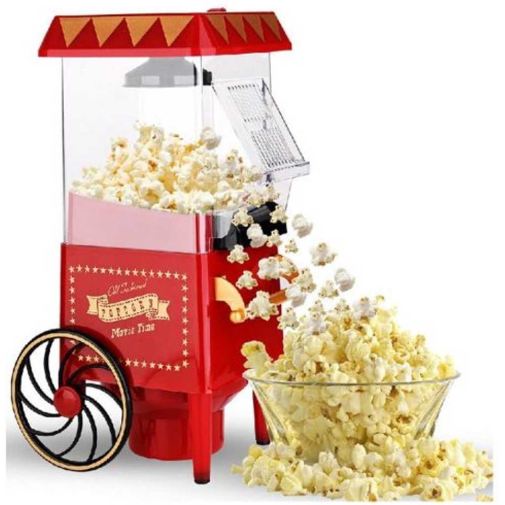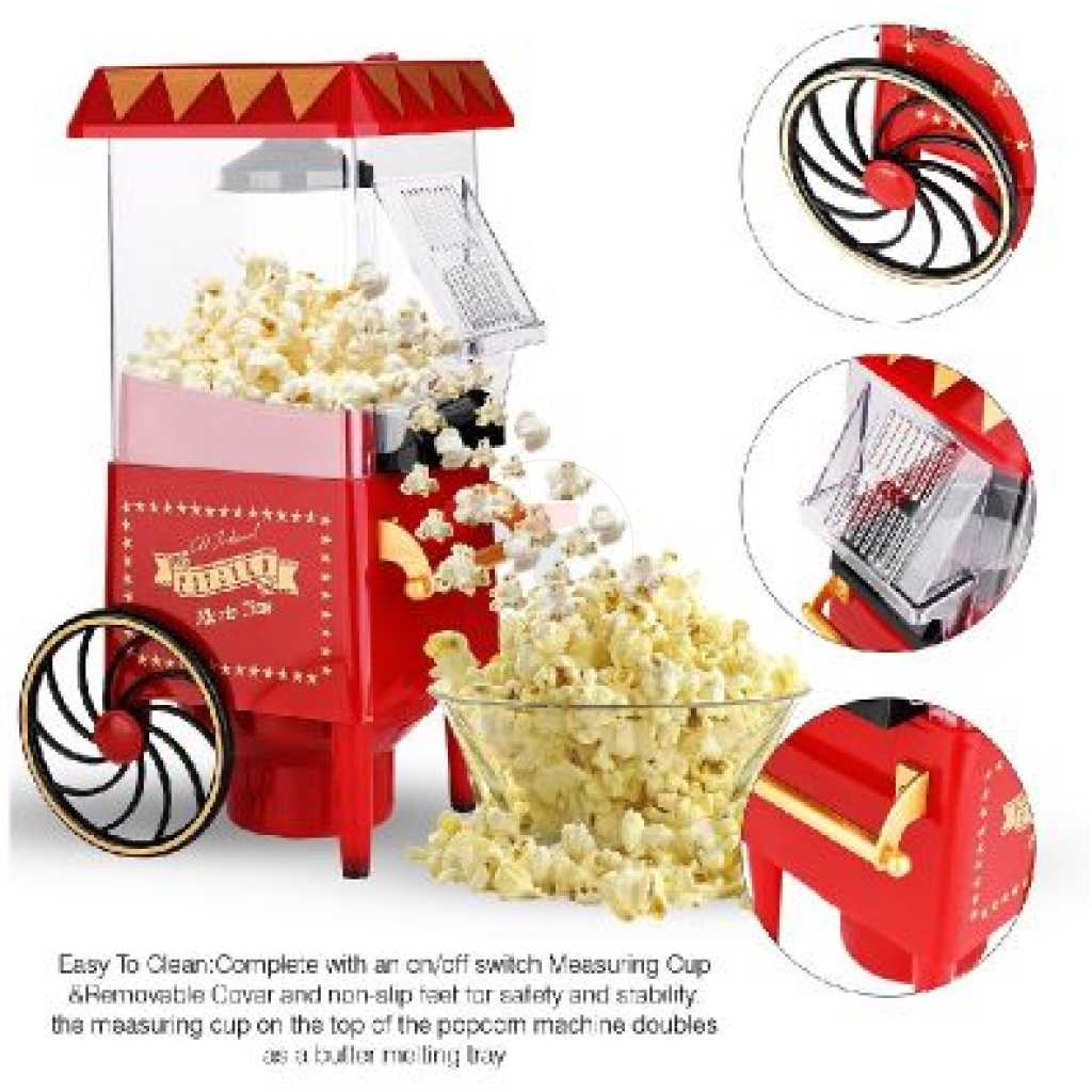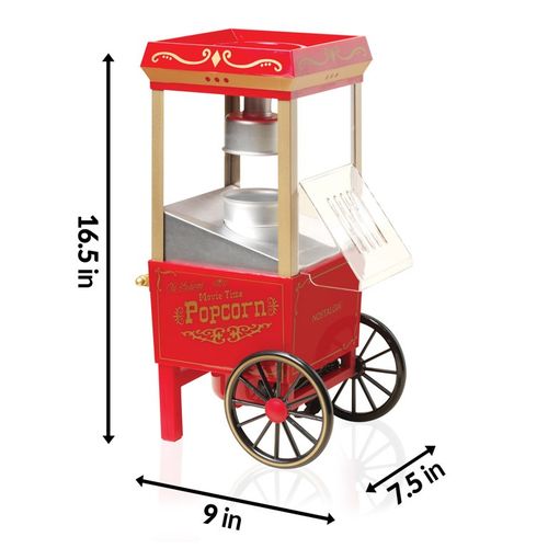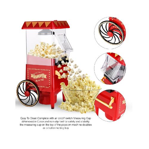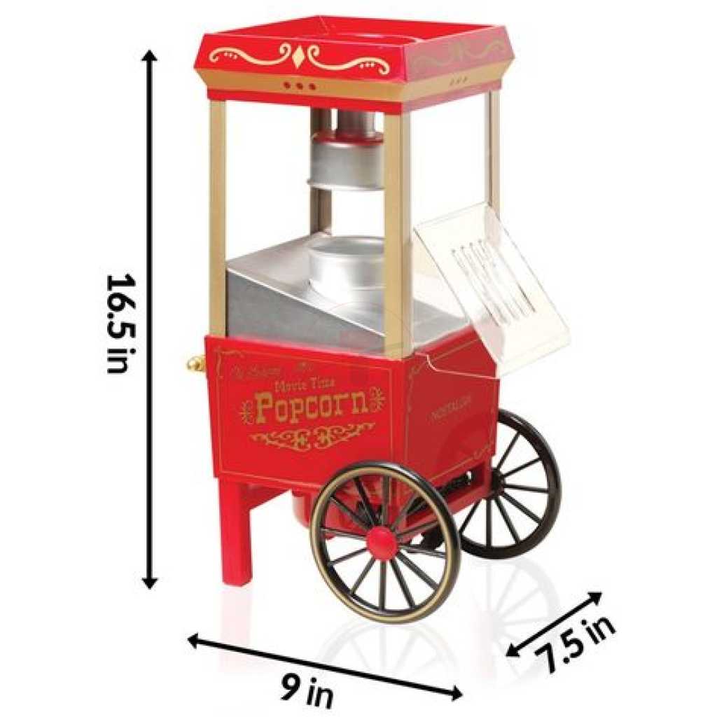 Key Features: Popcorn Maker Machine With Wheels- Red Style: Old-Fashioned Material: Plastic Power Source: Wall Plug-In Capacity: 3-1/2 Oz Type: Electric & Air Popcorn Makers Features: Dishwasher Safe, Easy Clean, Electric Color: Red Power: 1400 W Making Method: Hot Air