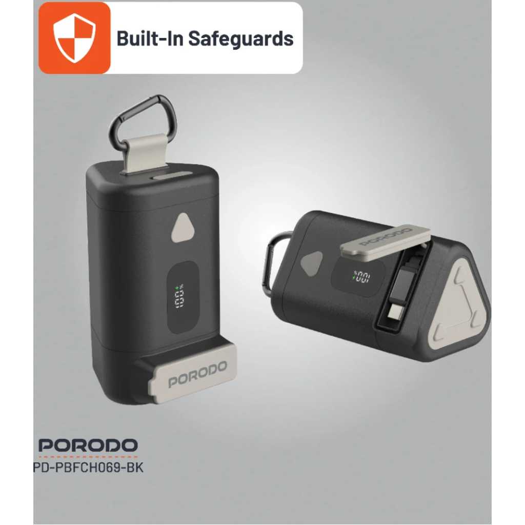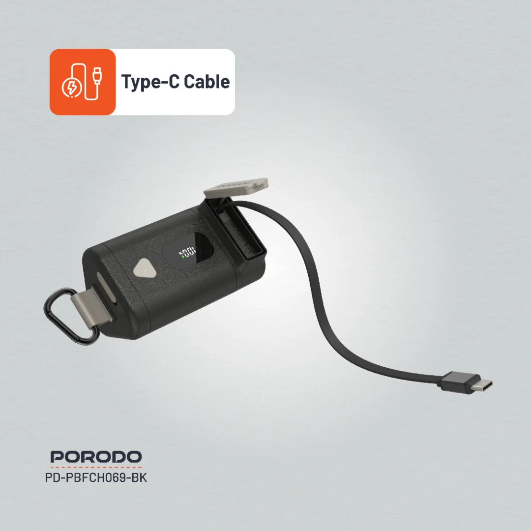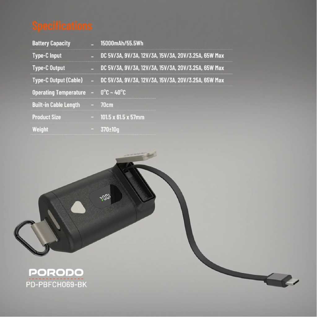 The Porodo 15000mAh Power Bank with a 70cm retractable Type-C cable offers an efficient and portable solution for powering your devices on the go. With a battery capacity of 15000mAh (55.5Wh), it provides ample energy to charge smartphones, tablets, and other electronics multiple times. The built-in 70cm retractable Type-C cable adds convenience, reducing cable clutter and making it easy to charge your devices without needing additional cables. The power bank supports PD 65W fast charging, delivering various output options via its Type-C ports. It provides DC 5V/3A, 9V/3A, 12V/3A, 15V/3A, and 20V/3.25A, with a maximum output of 65W, making it perfect for quick and efficient charging. The Type-C input also supports the same charging parameters, ensuring fast recharging of the power bank itself. This model is equipped with built-in safeguards to protect both your devices and the power bank from damage. It also includes a digital display for easy monitoring of battery levels and charging status. With an operating temperature range of 0°C to 40°C, the power bank operates optimally under normal conditions. Weighing 370g and measuring 101.5×61.5x57mm, this power bank is compact enough to be easily carried in your bag. Whether you’re traveling or at home, the Porodo 15000mAh Power Bank provides a reliable source of power for your devices, making it an excellent choice for those who need high capacity and fast charging on the go.