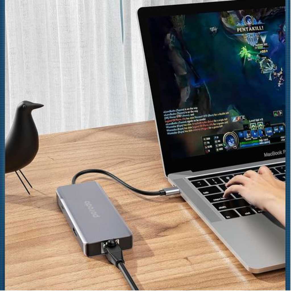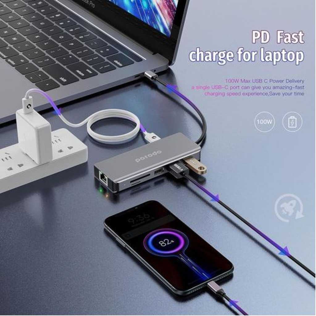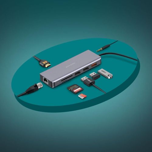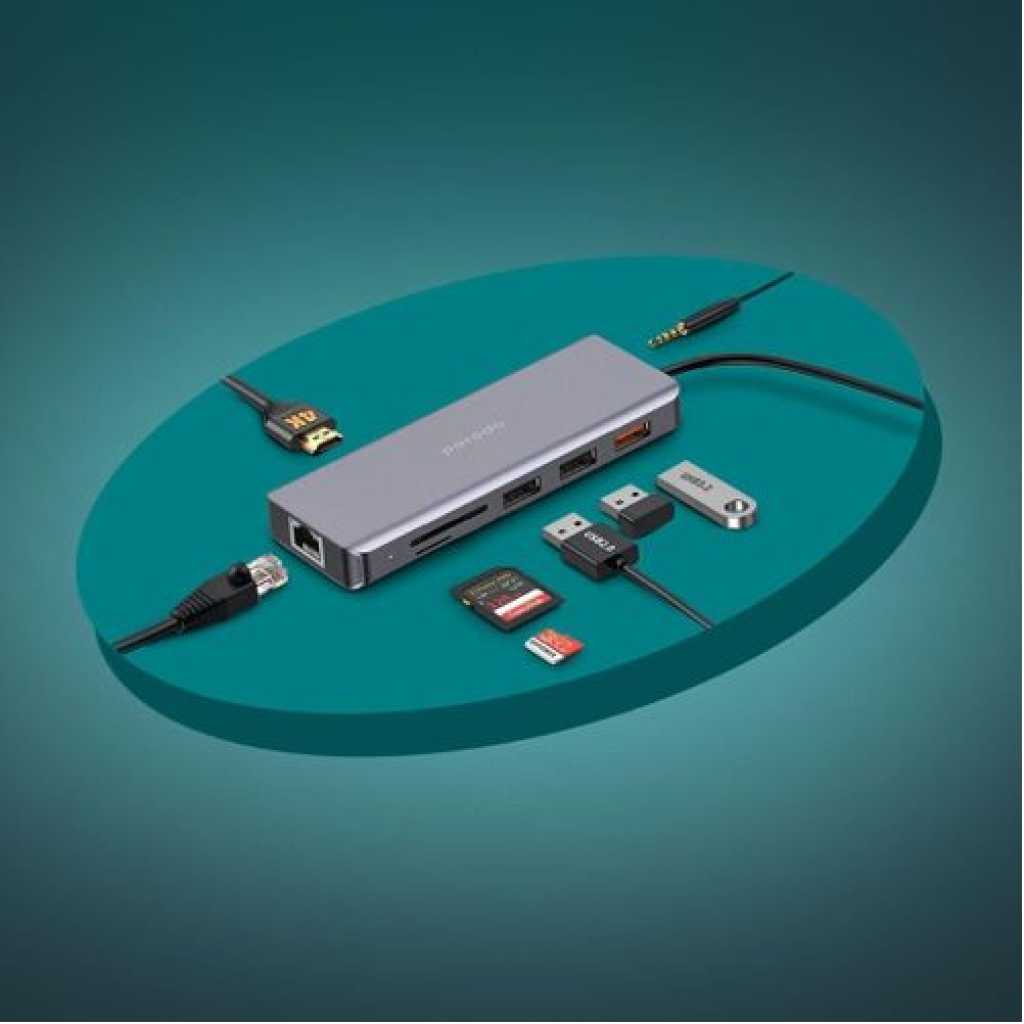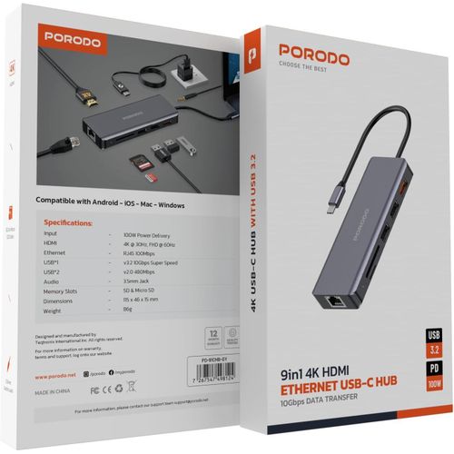 Porodo 9-in-1 USB-C Hub Multiport Adapter with 100W PD, 4K HDMI, Gigabit Ethernet, 3.5mm Audio Jack, SD/MicroSD Card Reader for MacBook, Windows Laptops & Tablets