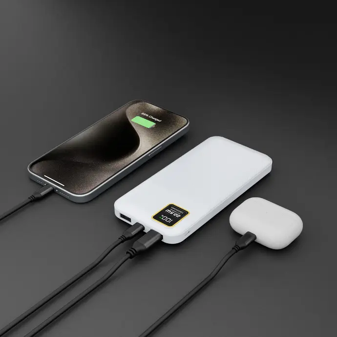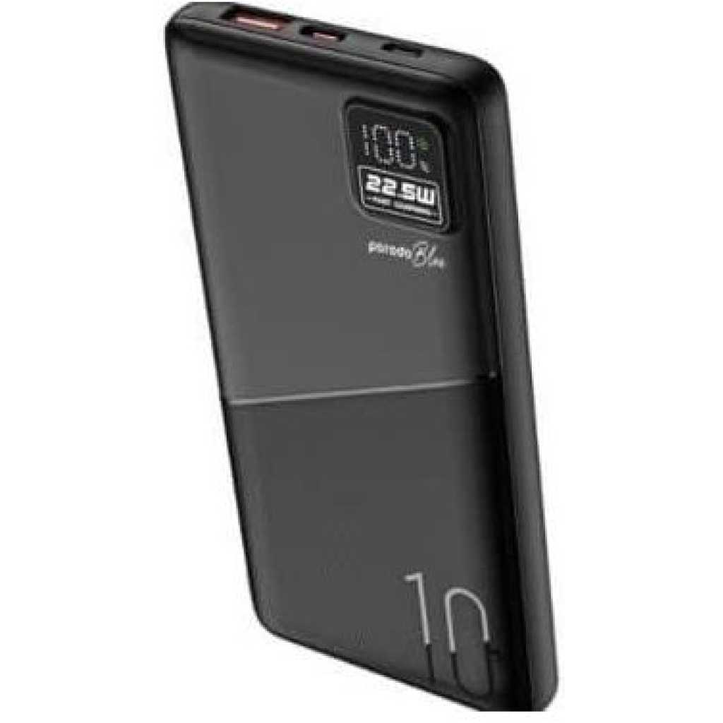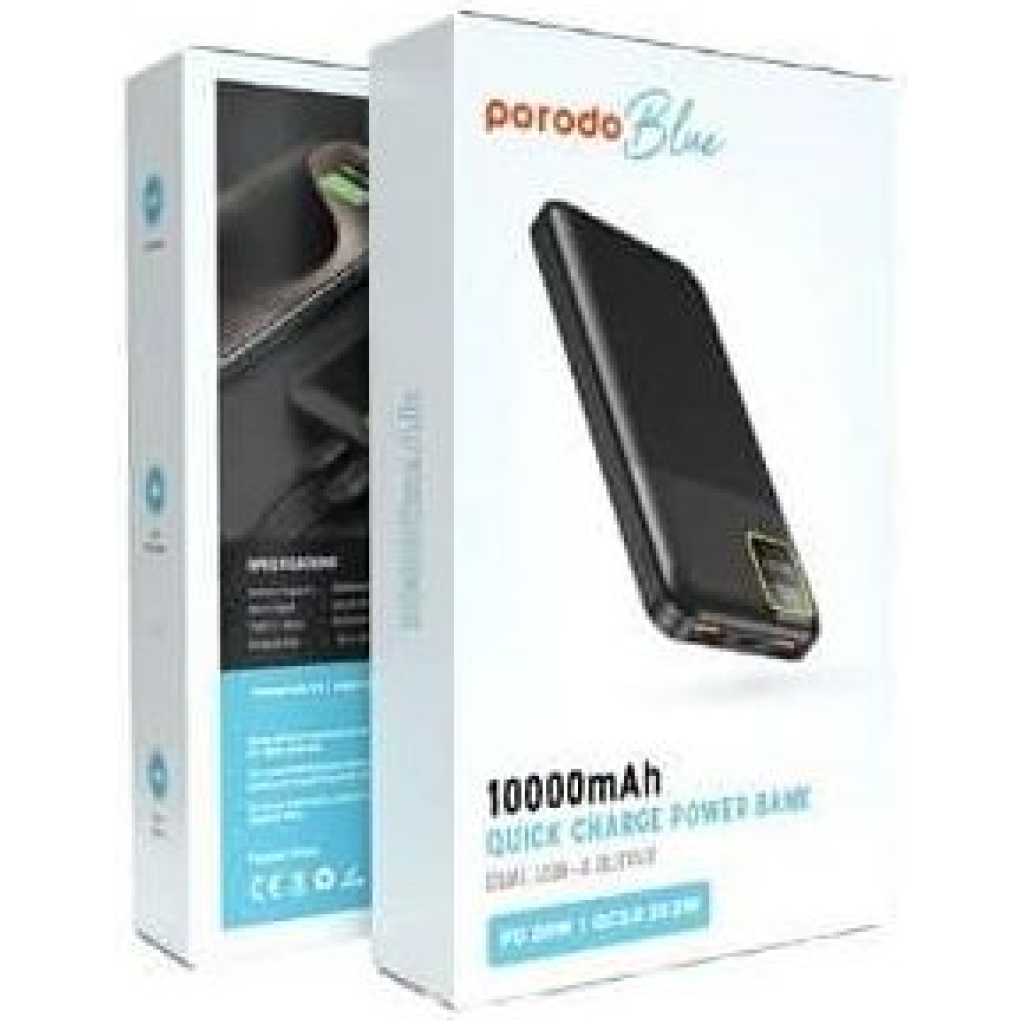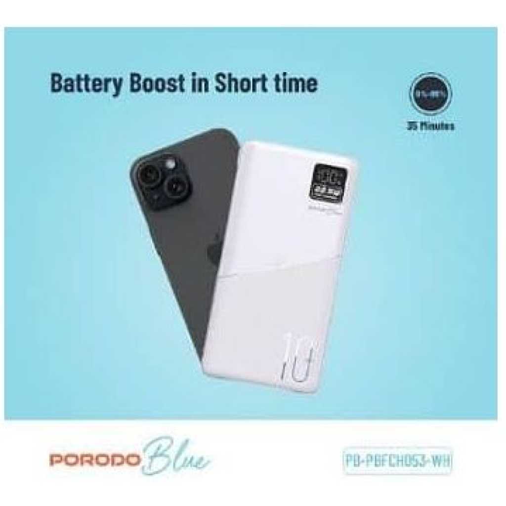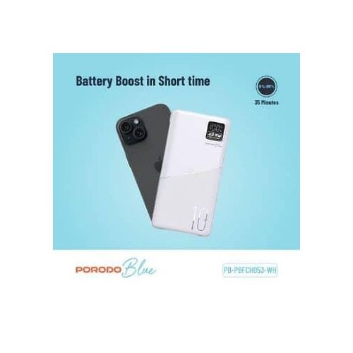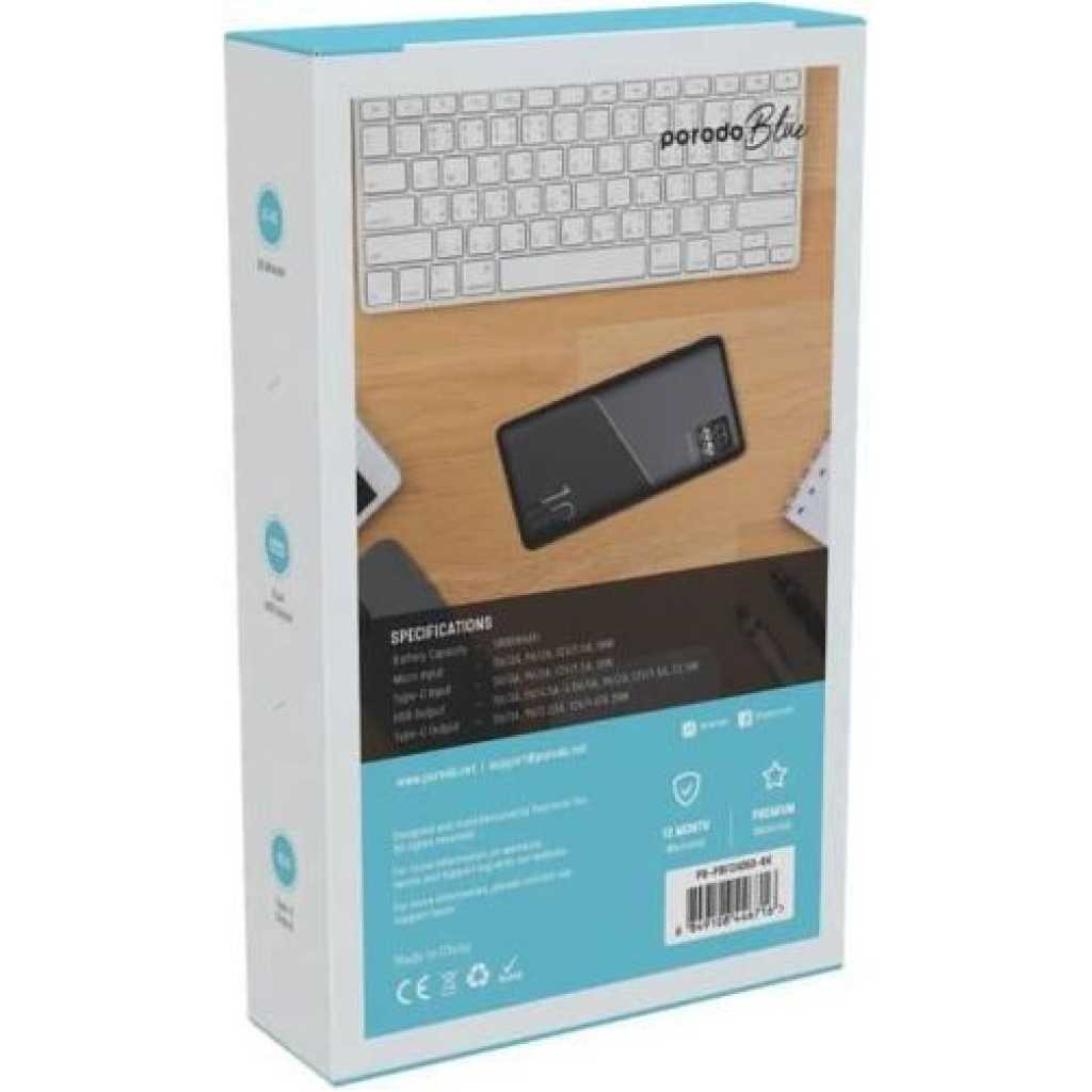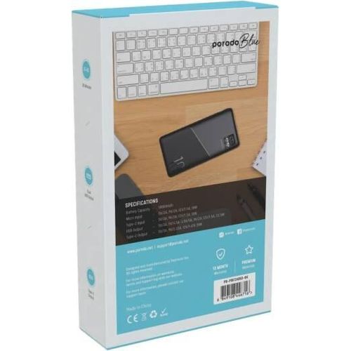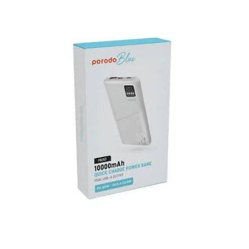 Description Porodo Blue power bank provides you with a fast 20W power delivery, taking only 35min to charge from 0% to 65%. Its 22.5W dual QC 3.0 USB-A output makes it super easy to fully charge your gadgets, and it comes with a long-lasting 10000mAh battery capacity. It also features a small digital display to show the battery status. Having a lightweight and catchy design, it enables you to easily carry it on your travels or wherever you go, while looking smart and stylish. Features 0%-65% 35 Minutes Dual USB Output 20W PD QC 3.0 Specifications Battery Capacity: 10000mAh Micro Input: 5V/2A 9V/2A (18W) Type-C Input: 5V/3A 9V/2A (18W) USB1/2 Output: 5V/3A 5V/4.5A 9V/2A 12V/1.5A (22.5W) Type-C Output: 5V/3A 9V/2.22A 12V/1.67A (20W) SKU: PB-22WPB10K-BK – PB-22WPB10K-WH GTIN: 0990478140967 – 0990478140950 User Manual Porodo Blue 10000mAh/22.5W Quick Charge Power Bank Dual USB-A Output To discover your product, click on the button below to view the User Manual Key Features: 【???????????????? ????????????????????????】Supports 20W Power Delivery & QC3.0, charging your device 0%-65% in just 35 minutes. 【???????????????????????????? ????????????????????????????】Real-time LED screen shows the exact battery percentage for easy monitoring. 【???????????????? ???????????? ????????????????????????】Features USB-A (22.5W) and USB-C (20W) for fast, simultaneous charging. 【???????????????????????????? ????????????????????????????????????】Designed with high-quality, durable construction for long-lasting use. 【???????????????????????????????? ????????????????????】Massive 20,000mAh battery capacity, perfect for multiple device recharges. 【???????????????? ???????????? ????????????】The package includes The Porodo Blue Quick Charge 20000mAh Power Bank