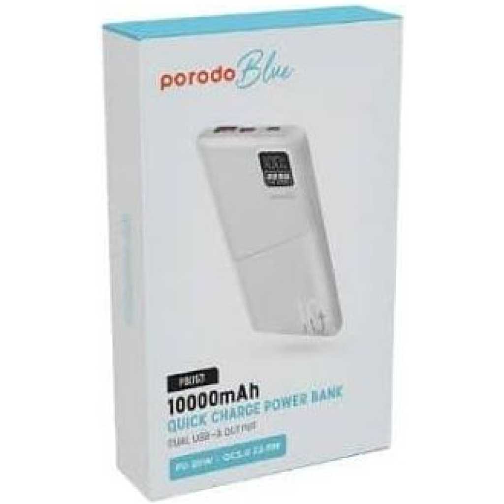 Porodo Blue PB053 Quick Charge Power Bank 10000 MAh, PD 20W Power Delivery, Dual USB-A & USB-C Outputs, Digital Display, Fast Charging 0%-65% In 35 Min, Portable & Durable