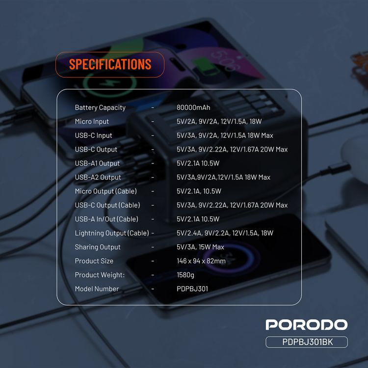 Key Features: USB-C Input: 5V/3A, 9V/2A, 12V/1.5A 18W Max / USB-C Output: 5V/3A, 9V/2.22A, 12V/1.67A 20W Max USB-A1 Output: 5V/2.1A 10.5W / USB-A2 Output: 5V/3A,9V/2A,12V/1.5A 18W Max Sharing Output: 5V/3A, 15W Max / Product Size: 146 x 94 x 82mm USB-C Output (Cable): 5V/3A, 9V/2.22A, 12V/1.67A 20W Max Lightning Output (Cable): 5V/2.4A, 9V/2.2A, 12V/1.5A, 18W Flashlight / Portable Handle / Fast Charging / PD 20W Product Weight: 1580g / Model Number: PDPBJ301 Universal Compatibility / Built-in Safety Feature Micro Input: 5V/2A, 9V/2A, 12V/1.5A, 18W Micro Output (Cable): 5V/2.1A, 10.5W USB-A In/Out (Cable): 5V/2.1A 10.5W Battery Capacity: 80000mAh