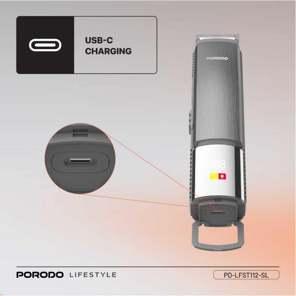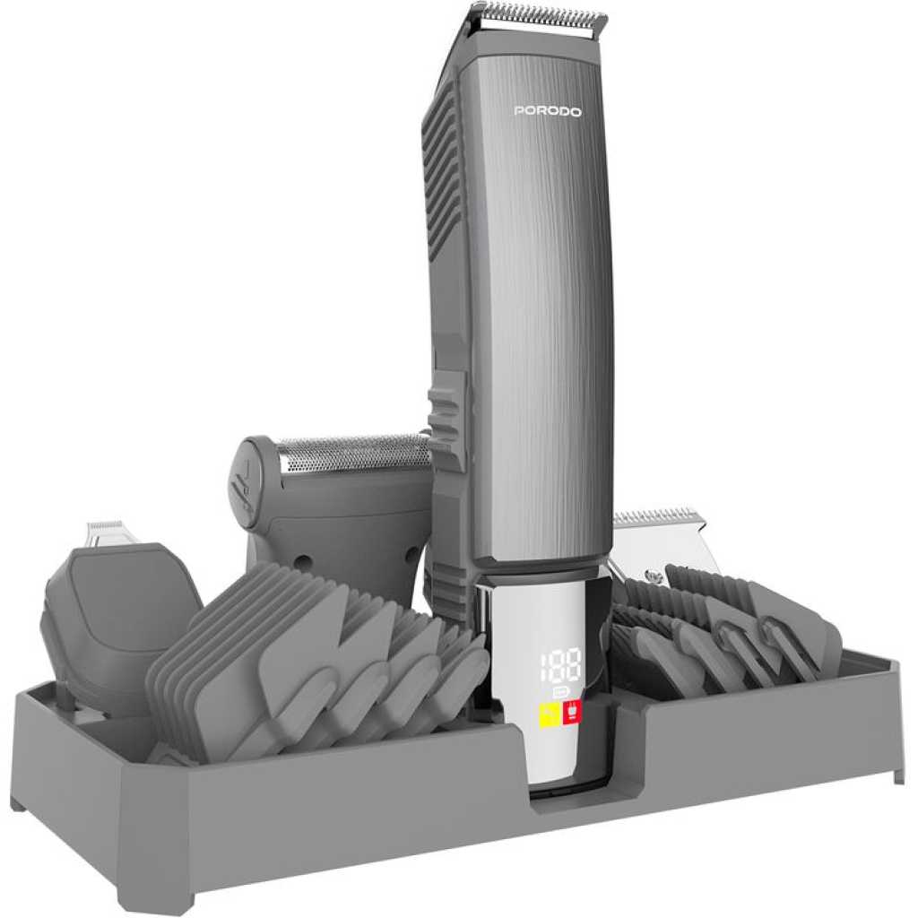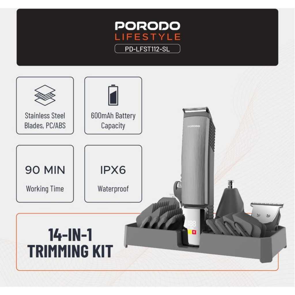 The Porodo 14 in 1 Trimming & Grooming Kit for Hair, Beard & Body (Model Number: LFS112) is a highly versatile grooming solution designed to cater to a wide range of needs. It features a selection of guide combo lengths, including 1mm, 2mm, 3mm, 5mm, 6mm, 7mm, 9mm, and 12mm, allowing for precise customization of your trim. Crafted with stainless steel blades and durable PC/ABS material, this trimmer provides a sharp and efficient performance for both hair and body grooming. With 14 attachments, this kit is suitable for all types of grooming tasks, whether for hair, beard, or body care. Powered by a 600mAh battery, it offers a working time of up to 90 minutes after a full charge. The trimmer features an IPX6 waterproof rating, allowing for easy cleaning and maintenance, even under running water. Its USB-C charging port offers convenience, and the charging time is quick, taking only 2 hours to fully recharge. Designed for both corded and cordless use, this kit offers flexibility and convenience, making it a reliable companion for all your grooming needs.