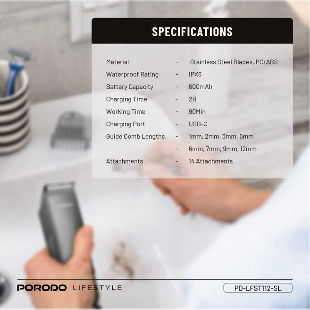 Key Features: Guide Combo Lengths: 1mm, 2mm, 3mm, 5mm, 6mm, 7mm, 9mm, 12mm Material: Stainless Steel Blades, PC/ABS Attachments: 14 Attachments Battery Capacity: 600mAh Waterproof Rating: IPX6 Model Number: LFS112 Charging Port: USB-C Length Customization Cord & Cordless Use Working Time: 90Min Charging Time: 2H