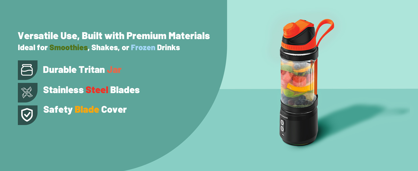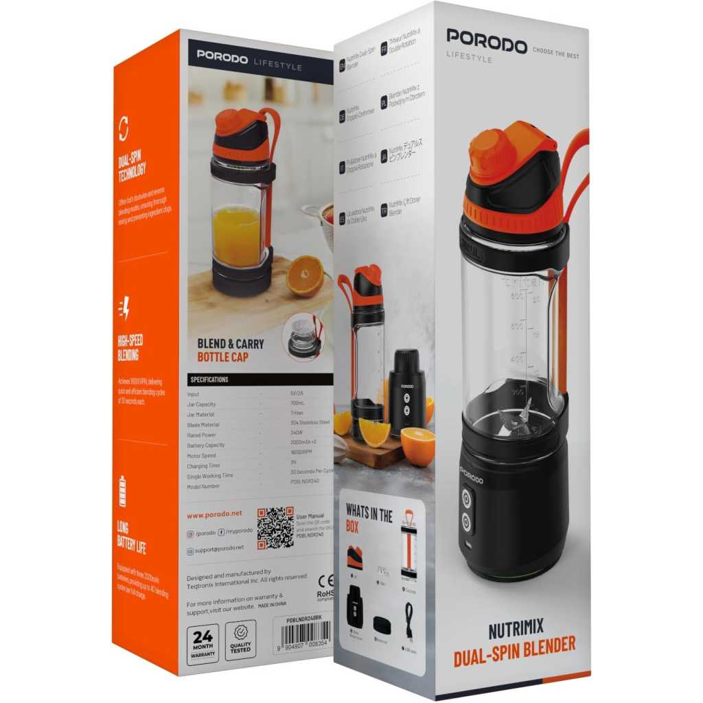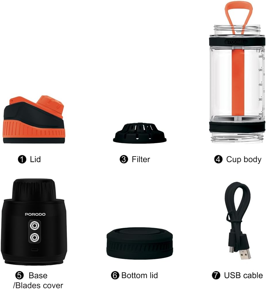 Key Features: 【- & – 】 The innovative Dual-Spin Technology blends in both clockwise and reverse directions, preventing ingredients from getting stuck and ensuring a perfectly smooth mix. The high-speed 18000 RPM motor crushes ice, fruits, and vegetables in just 30 seconds. 【 & – 】 Equipped with a massive 6000mAh (3x 2000mAh) battery, this blender delivers incredible power and numerous blending cycles on a single charge. It recharges conveniently in just 3 hours via a standard USB cable. 【 & 】 The large 700ml jar is made from shatterproof, BPA-free Tritan material. After blending, simply detach the motor base and attach the included bottom lid to convert it into a lightweight, portable drinking bottle, perfect for the gym or office. 【 】 Designed with your safety in mind, the blender includes a safety blade cover that protects the sharp 304 stainless steel blades when not in use, preventing accidental cuts and ensuring safe storage and travel. 【 】 This blender comes with a removable filter, perfect for making smoother juices by separating pulp and seeds, or for infusing water with your favorite fruits. Enjoy a variety of drinks tailored exactly to your preference. 【 】The package includes the Porodo Blender Base with Blade Cover, 700ml Cup Body, a travel-friendly Lid, a separate Bottom Lid for the cup, a Filter, a USB Charging Cable, – , and a + .