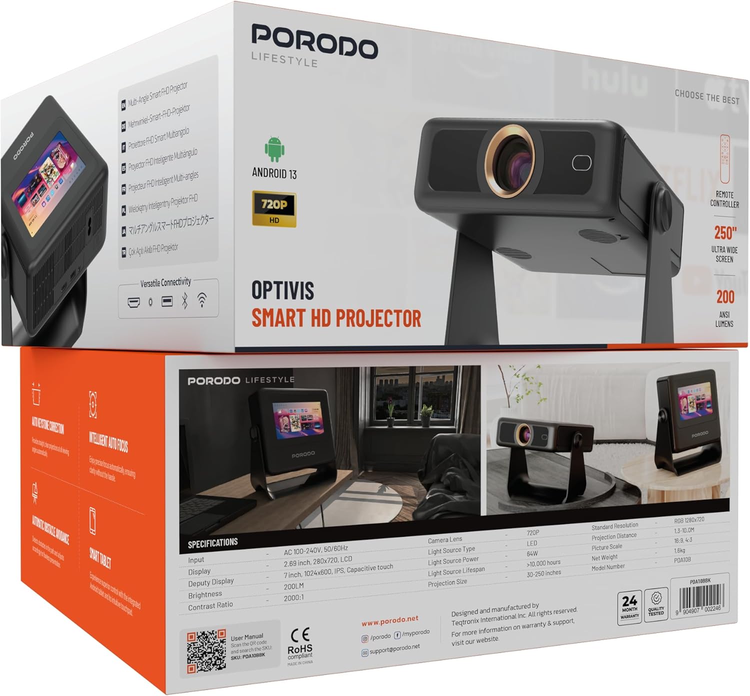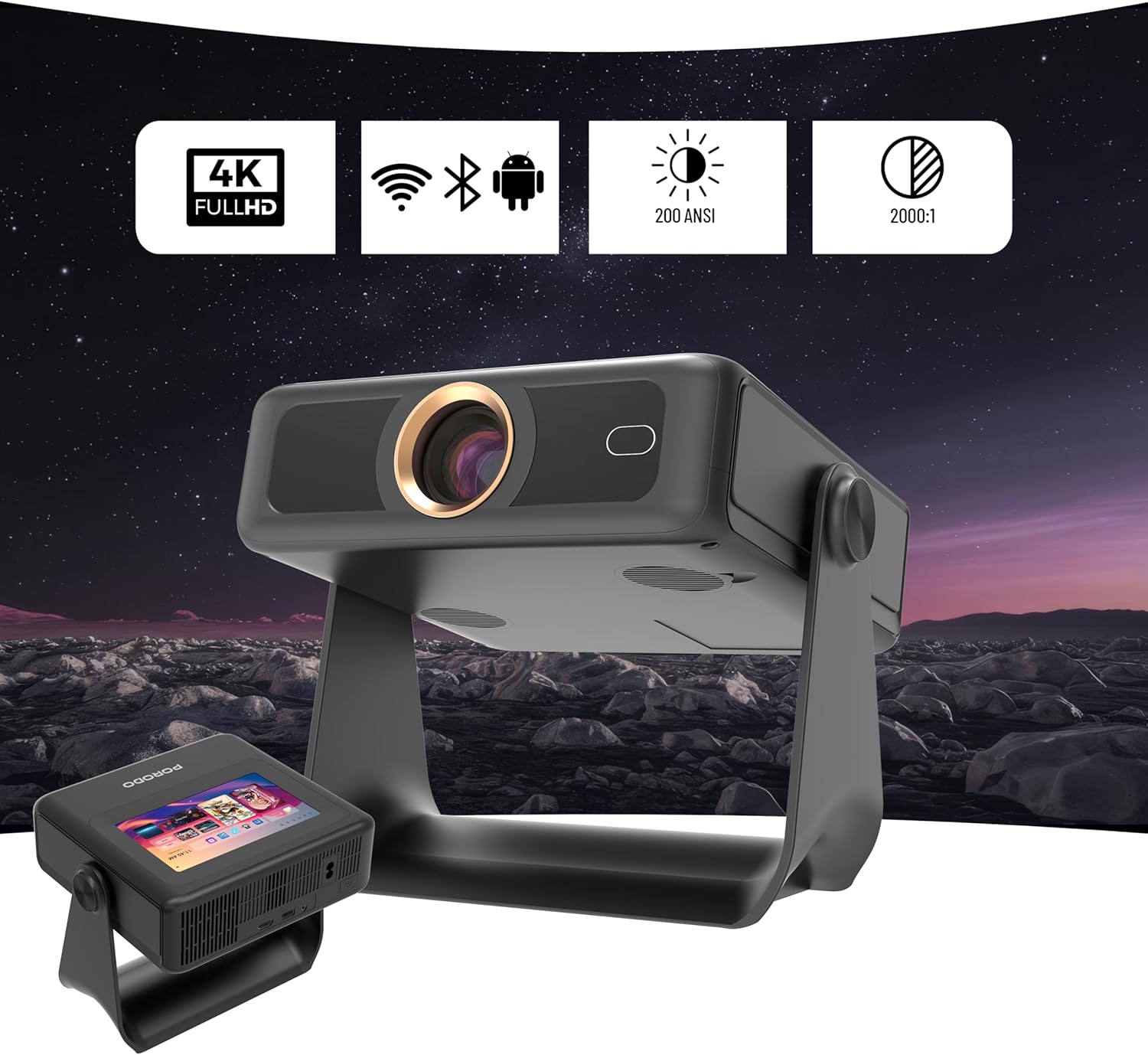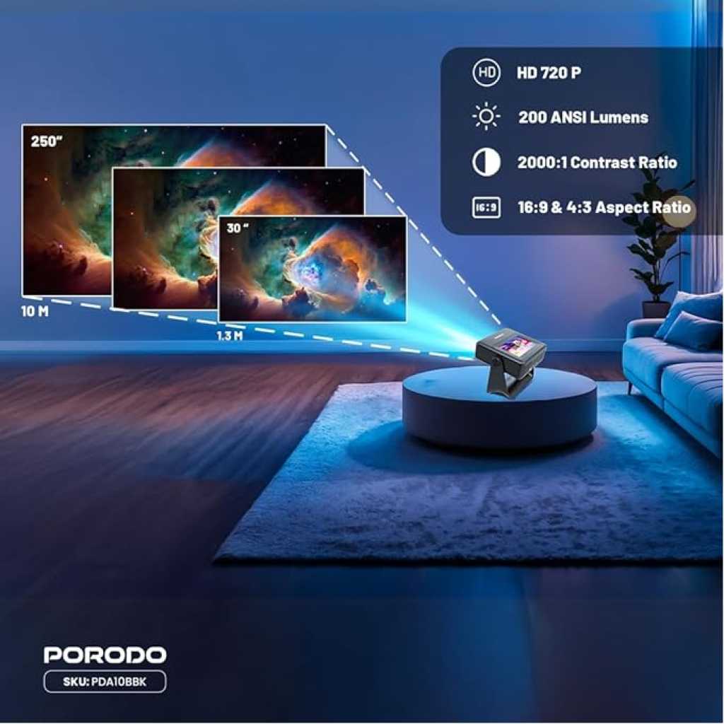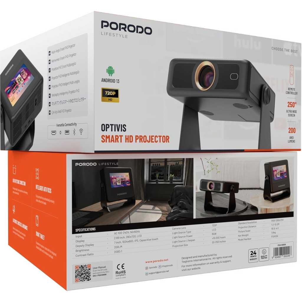 Key Features: Sleek and Portable Design: Imagine carrying a OPTIVIS 1.81 inch pocket projector that looks like a premium hardcover book. Its compact, lightweight form factor allows you to slip it into your bag with ease, ready for any projection, movie night, or trip. The minimalist design complements any setting, making it a stylish addition to your workspace or living room. It brings entertainment to life, enhancing every gathering. Instant clarity, Precise alignment: The porodo smart projector 720P combines automatic fast focus and keystone correction technology, from power on to enjoyment, auto focus projector only takes some seconds. It abandons tedious manual adjustment, whether it is immersive movies or fierce games, it is ready instantly. The built-in high-sensitivity displacement gyroscope and smart sensor can keenly capture subtle environmental changes, optimize the image in real-time, and present a perfect view. 360° Tool-free Adjustable Bracket: With a 360° rotatable stand, the bedroom projector effortlessly projects images onto the ceiling, offering an unparalleled viewing experience. Whether you prefer sitting or lounging to watch your movies, it satisfies all. Optivis mini projector stand is quick to assemble and disassemble, requiring no tools and providing easy operation. Furthermore, the stand safeguards the projector lens when stored, guarding against dust accumulation and accidental impacts. Lightning-Fast WiFi & Bluetooth: WiFi ensures stable, rapid signal transmission, empowering the wireless projector with seamless wireless screen mirroring for ultra-smooth movie & gaming sessions. Built-in Bluetooth 5.2 enables the outdoor projector to have seamless audio sync, transforming it into a Bluetooth speaker for on-demand phone music. Immersive viewing awaits! Authentic 200 ANSI Brightness: The OPTIVIS SMART HD Projector delivers certified brightness, achieving a true 2000 ANSI lumens – equivalent to the 1200 ANSI lumens claimed by other brands. We rigorously test each light beam using a 9-point measurement system, eliminating “light source” trickery and peak mode deception. No exaggerated number – only honest brightness. Experience vivid, precise visuals in bedrooms, living rooms, and beyond. Unique 7″ Touchscreen Design: Switch Between Touch & Big Screen Effortlessly with Porodo Smart Tablet-Projector portable projector with a built-in touchscreen! Easily toggle between the interactive smart panel (for quick settings/navigation) and projecting a massive 250″ screen on walls, ceilings, or tents. Perfect for family movie nights, kids’ learning games, backyard movie, business presentations. Do not forget popcorn while watching a movie on the screen! You will receive: Porodo Smart HD Projector 250″, User Manual for Easy Setup, 24 Hours Custome Service, LifetimeTechnical Support and a Free 12 + 12 Months Warranty.