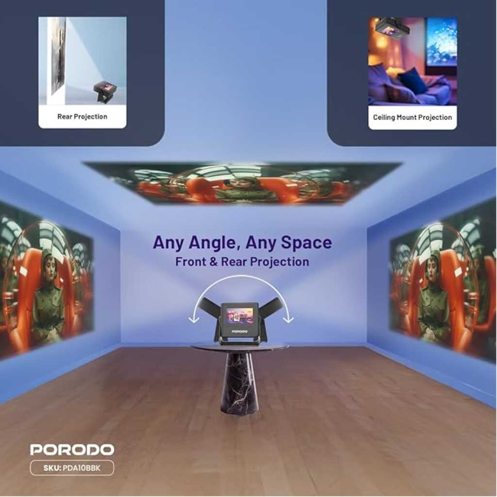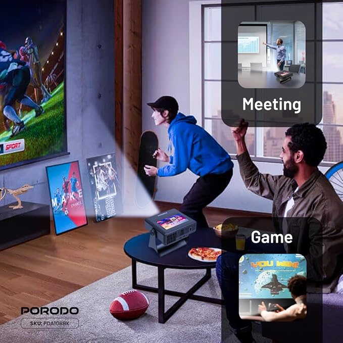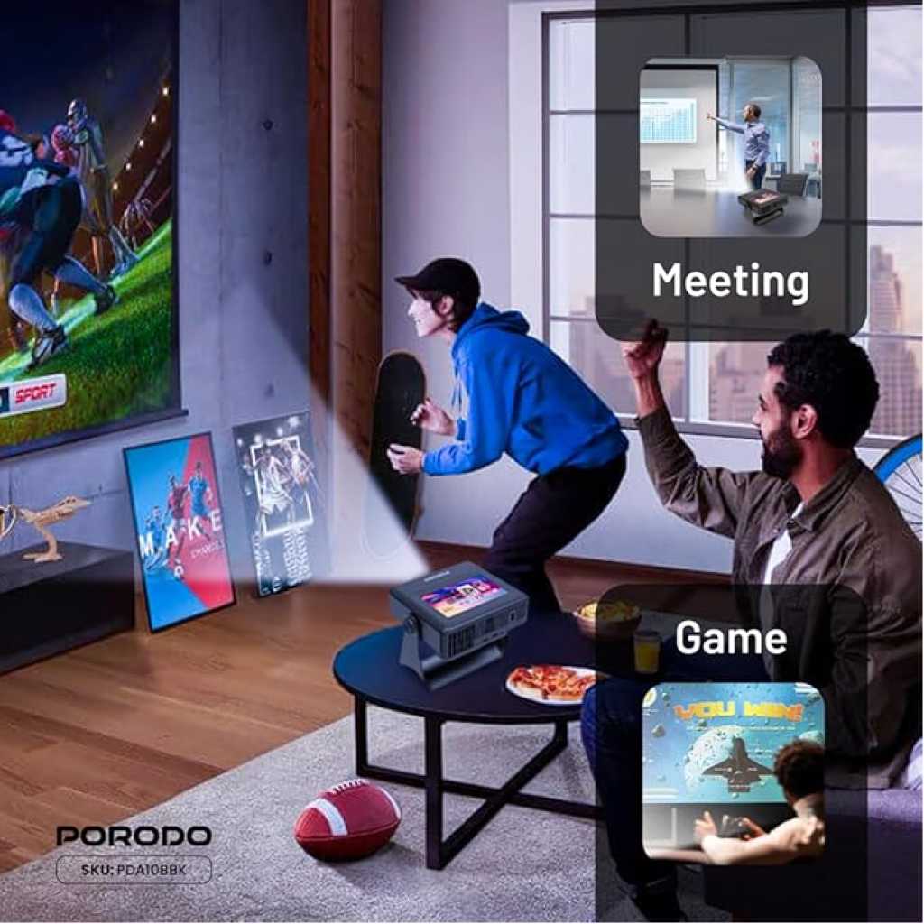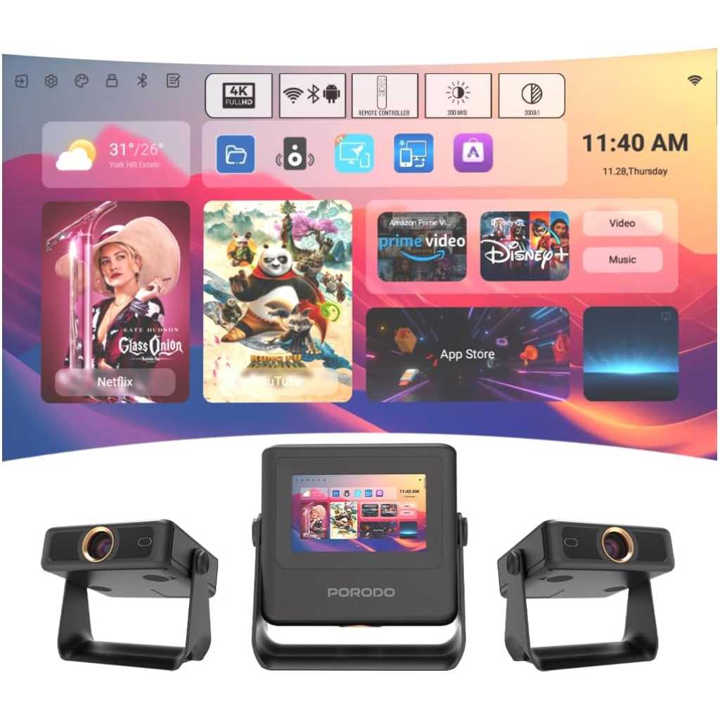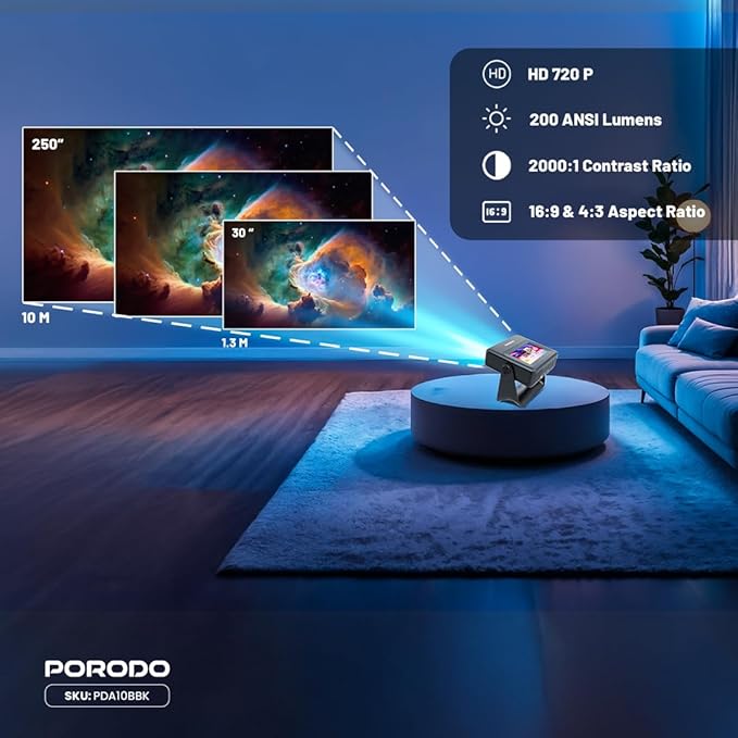 Sleek and Portable Design: Imagine carrying a OPTIVIS 1.81 inch pocket projector that looks like a premium hardcover book. Its compact, lightweight form factor allows you to slip it into your bag with ease, ready for any projection, movie night, or trip. The minimalist design complements any setting, making it a stylish addition to your workspace or living room. It brings entertainment to life, enhancing every gathering. Instant clarity, Precise alignment: The porodo smart projector 720P combines automatic fast focus and keystone correction technology, from power on to enjoyment, auto focus projector only takes some seconds. It abandons tedious manual adjustment, whether it is immersive movies or fierce games, it is ready instantly. The built-in high-sensitivity displacement gyroscope and smart sensor can keenly capture subtle environmental changes, optimize the image in real-time, and present a perfect view. 360° Tool-free Adjustable Bracket: With a 360° rotatable stand, the bedroom projector effortlessly projects images onto the ceiling, offering an unparalleled viewing experience. Whether you prefer sitting or lounging to watch your movies, it satisfies all. Optivis mini projector stand is quick to assemble and disassemble, requiring no tools and providing easy operation. Furthermore, the stand safeguards the projector lens when stored, guarding against dust accumulation and accidental impacts. Lightning-Fast WiFi & Bluetooth: WiFi ensures stable, rapid signal transmission, empowering the wireless projector with seamless wireless screen mirroring for ultra-smooth movie & gaming sessions. Built-in Bluetooth 5.2 enables the outdoor projector to have seamless audio sync, transforming it into a Bluetooth speaker for on-demand phone music. Immersive viewing awaits! Authentic 200 ANSI Brightness: The OPTIVIS SMART HD Projector delivers certified brightness, achieving a true 2000 ANSI lumens – equivalent to the 1200 ANSI lumens claimed by other brands. We rigorously test each light beam using a 9-point measurement system, eliminating “light source” trickery and peak mode deception. No exaggerated number – only honest brightness. Experience vivid, precise visuals in bedrooms, living rooms, and beyond. Unique 7″ Touchscreen Design: Switch Between Touch & Big Screen Effortlessly with Porodo Smart Tablet-Projector portable projector with a built-in touchscreen! Easily toggle between the interactive smart panel (for quick settings/navigation) and projecting a massive 250″ screen on walls, ceilings, or tents. Perfect for family movie nights, kids’ learning games, backyard movie, business presentations. Do not forget popcorn while watching a movie on the screen! You will receive: Porodo Smart HD Projector 250″, User Manual for Easy Setup, 24 Hours Custome Service, LifetimeTechnical Support and a Free 12 + 12 Months Warranty.