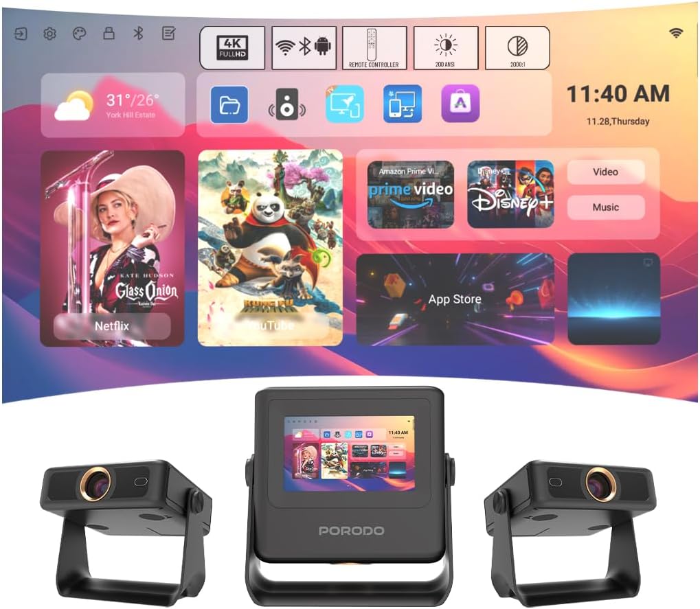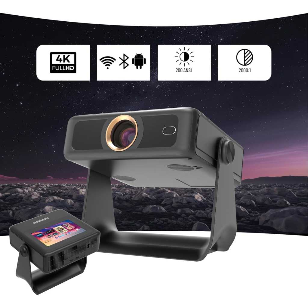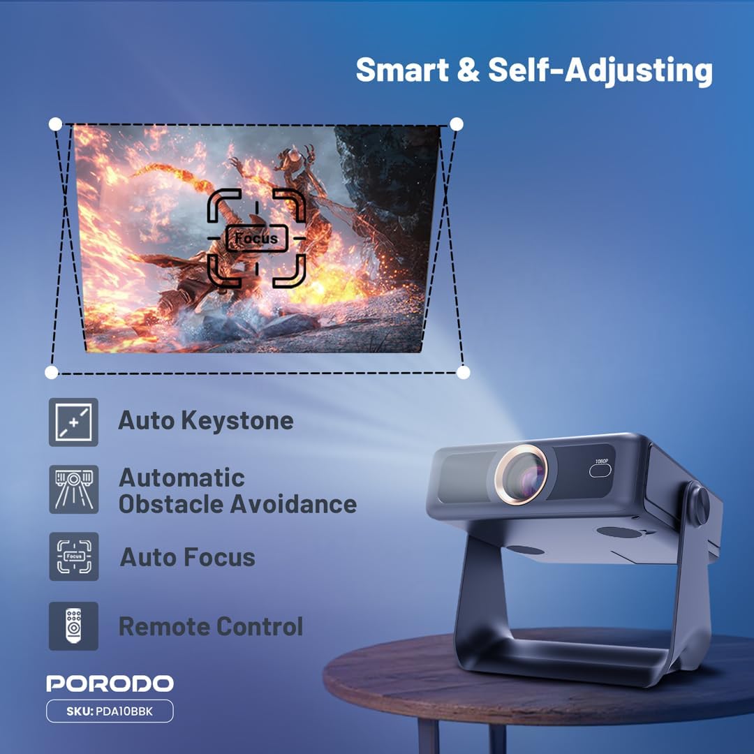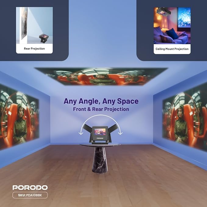 Sleek and Portable Design: Imagine carrying a OPTIVIS 1.81 inch pocket projector that looks like a premium hardcover book. Its compact, lightweight form factor allows you to slip it into your bag with ease, ready for any projection, movie night, or trip. The minimalist design complements any setting, making it a stylish addition to your workspace or living room. It brings entertainment to life, enhancing every gathering. Instant clarity, Precise alignment: The porodo smart projector 720P combines automatic fast focus and keystone correction technology, from power on to enjoyment, auto focus projector only takes some seconds. It abandons tedious manual adjustment, whether it is immersive movies or fierce games, it is ready instantly. The built-in high-sensitivity displacement gyroscope and smart sensor can keenly capture subtle environmental changes, optimize the image in real-time, and present a perfect view. 360° Tool-free Adjustable Bracket: With a 360° rotatable stand, the bedroom projector effortlessly projects images onto the ceiling, offering an unparalleled viewing experience. Whether you prefer sitting or lounging to watch your movies, it satisfies all. Optivis mini projector stand is quick to assemble and disassemble, requiring no tools and providing easy operation. Furthermore, the stand safeguards the projector lens when stored, guarding against dust accumulation and accidental impacts. Lightning-Fast WiFi & Bluetooth: WiFi ensures stable, rapid signal transmission, empowering the wireless projector with seamless wireless screen mirroring for ultra-smooth movie & gaming sessions. Built-in Bluetooth 5.2 enables the outdoor projector to have seamless audio sync, transforming it into a Bluetooth speaker for on-demand phone music. Immersive viewing awaits! Authentic 200 ANSI Brightness: The OPTIVIS SMART HD Projector delivers certified brightness, achieving a true 2000 ANSI lumens – equivalent to the 1200 ANSI lumens claimed by other brands. We rigorously test each light beam using a 9-point measurement system, eliminating “light source” trickery and peak mode deception. No exaggerated number – only honest brightness. Experience vivid, precise visuals in bedrooms, living rooms, and beyond. Unique 7″ Touchscreen Design: Switch Between Touch & Big Screen Effortlessly with Porodo Smart Tablet-Projector portable projector with a built-in touchscreen! Easily toggle between the interactive smart panel (for quick settings/navigation) and projecting a massive 250″ screen on walls, ceilings, or tents. Perfect for family movie nights, kids’ learning games, backyard movie, business presentations. Do not forget popcorn while watching a movie on the screen! You will receive: Porodo Smart HD Projector 250″, User Manual for Easy Setup, 24 Hours Custome Service, LifetimeTechnical Support and a Free 12 + 12 Months Warranty.