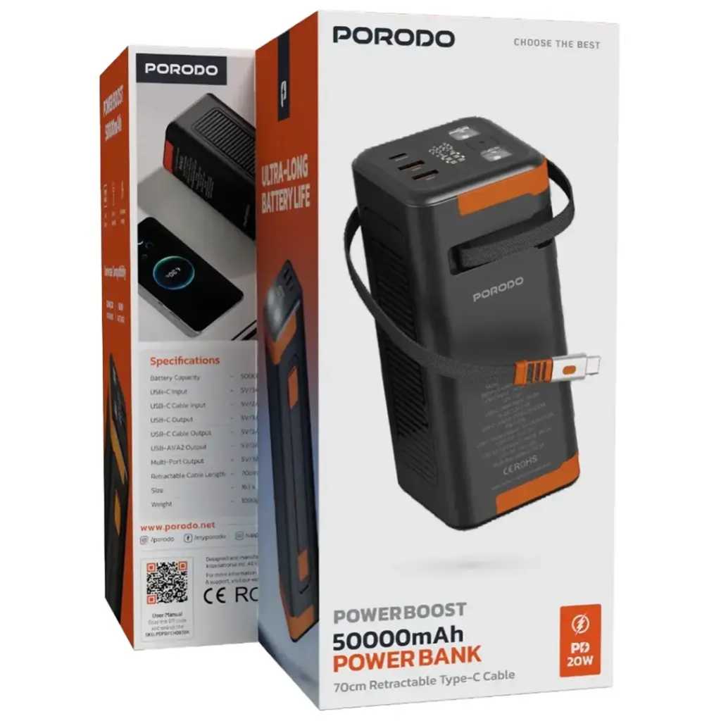 The Porodo Powerboost 50000mAh Power Bank is a high-capacity power solution designed to keep your devices charged for longer. With a massive 50000mAh (185Wh) battery, this power bank offers an incredible amount of power to charge smartphones, tablets, laptops, and other devices multiple times. It features PD 20W and QC 22.5W fast charging , ensuring that your devices are charged quickly and efficiently. The built-in retractable 70cm Type-C cable adds convenience, allowing you to charge your device without needing to carry extra cables. This power bank also includes a built-in flash-light for emergencies, ensuring you’re prepared for any situation. The info display keeps you updated on the power status, providing essential details such as remaining battery life. With multi-port output , including USB-C and USB-A , the Powerboost allows for simultaneous charging of multiple devices, making it perfect for on-the-go charging needs. Whether you’re at home, in the office, or traveling, you can easily charge all your devices at once. Compact yet powerful, the Porodo Powerboost is designed for convenience and portability, measuring 163 x 73.5 x 72mm and weighing 1090g . Despite its large battery capacity, the power bank remains relatively lightweight and easy to carry. With a wide range of output options, including USB-C , USB-A , and USB-C cable output , you can charge a variety of devices without worrying about compatibility. This power bank is the ultimate choice for those who need a reliable, high-capacity charger that can power multiple devices simultaneously.