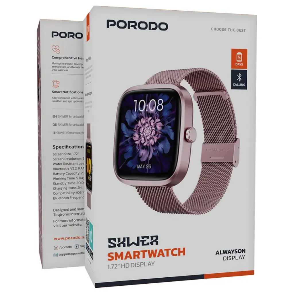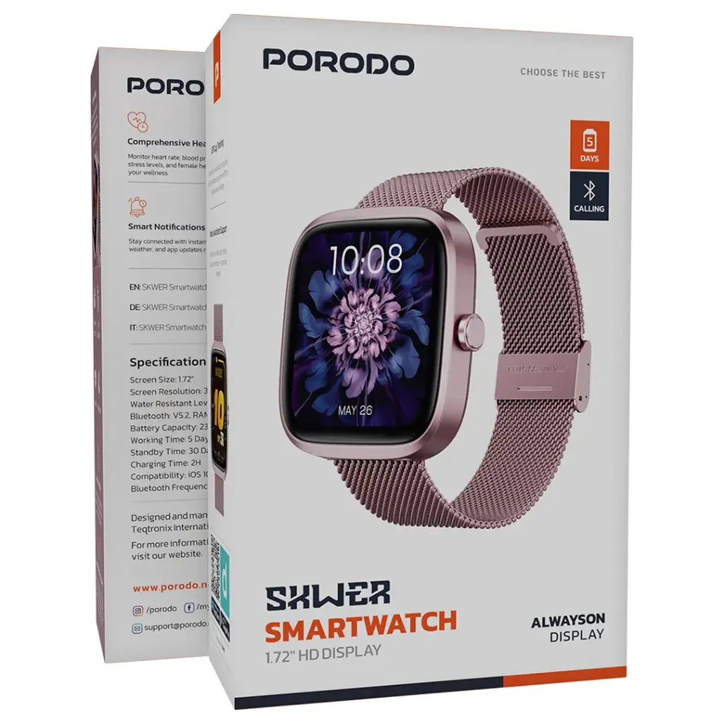 The Porodo SKWER Smartwatch is a feature-packed wearable designed for modern convenience and comprehensive health tracking. With its 1.72″ HD display and 360 x 360 resolution , the smartwatch offers a sharp, bright screen that’s easy to read in any lighting condition. It is equipped with Bluetooth V5.2 , offering Bluetooth calling , so you can make and receive calls directly from your wrist. The Porodo SKWER Smartwatch includes comprehensive health tracking , including heart rate monitoring , sleep analysis , and stress management , providing insights into your well-being. The camera shutter feature allows you to control your phone’s camera remotely, perfect for group shots or selfies. Additionally, with voice assistant support , you can control your watch with just your voice for hands-free convenience. With a 230mAh battery , the smartwatch offers 5 days of usage and 30 days of standby time, making it an ideal choice for daily use. It also offers GPS functionality and a weather forecast feature, helping you plan your day with ease. The IP68 water resistance ensures the watch can withstand splashes or rain, adding extra reliability. Compatible with both iOS 10+ and Android 10.0+ devices, the Porodo SKWER Smartwatch is a versatile and durable device that helps you stay connected and maintain a healthy lifestyle. Whether you’re tracking your workouts or managing notifications, this smartwatch combines convenience, style, and functionality.