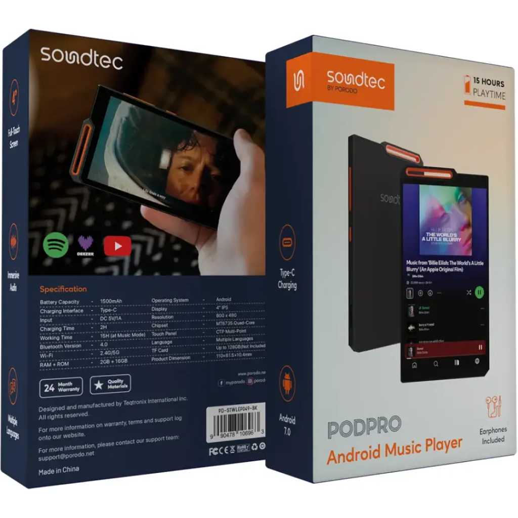 The Porodo Soundtec Pod Pro Android Music Player is a versatile and feature-rich device designed for music lovers. It supports a TF card of up to 128GB, allowing you to store a large library of songs (card not included). With a robust battery capacity of 1500mAh, the device provides up to 15 hours of playback in music mode, making it perfect for long listening sessions. The Android 7.0 operating system provides a smooth and responsive experience, and the 4-inch IPS touch display with a resolution of 800 × 480 ensures clear and vibrant visuals. The CTP Multi-Point touch panel adds precision and ease of use. Powered by the MT6735 Quad-Core chipset, the device is efficient and responsive. It features 2GB of RAM and 16GB of internal storage, providing ample space for your media. The Porodo Soundtec Pod Pro supports Bluetooth 4.0 for wireless connectivity, and it also includes Wi-Fi support for both 2.4G and 5G bands, allowing seamless internet access and online music streaming. The device also offers immersive audio for a rich listening experience, and it includes earphones for immediate use. The battery charges in approximately 2 hours using a Type-C charging interface, and the input required is DC 5V/1A. The multiple language options make it accessible to users across different regions. This music player is a reliable and stylish companion for anyone seeking a portable music solution.