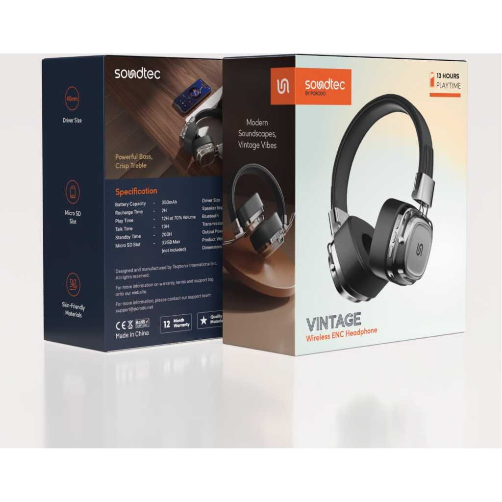 Key Features: Advanced Bluetooth Technology: Equipped with Bluetooth 5.3 EDR, these headphones provide a stable and quick connection to your devices. This means fewer dropouts and interruptions while you’re listening to music or taking calls. Long Battery Life: Enjoy up to 13 hours of playtime on a single charge, ensuring you can listen to your favorite tunes throughout the day. The 350mAh rechargeable battery is efficient and reliable, allowing for extended use without frequent recharging. Stylish Design: The Porodo Soundtec Vintage headphones feature a chic, retro-inspired design that complements any outfit. Their unique look makes them a fashionable accessory for music lovers. Environmental Noise Cancellation (ENC): The built-in ENC feature blocks out background noise, allowing you to immerse yourself in your music or podcasts. This is especially useful in crowded environments, like gyms or public transport. Micro SD Slot for Convenience: With the Micro SD slot, you can easily play music directly from your memory card. This feature adds versatility, letting you enjoy your favorite tracks without needing to connect to a device. It’s perfect for those who prefer a more portable listening option. Reason to Buy: The Porodo Soundtec Vintage Wireless ENC Headphone is an excellent investment for anyone seeking quality sound and style. With their long battery life, noise cancellation, and stylish design, they are perfect for both everyday use and active lifestyles.